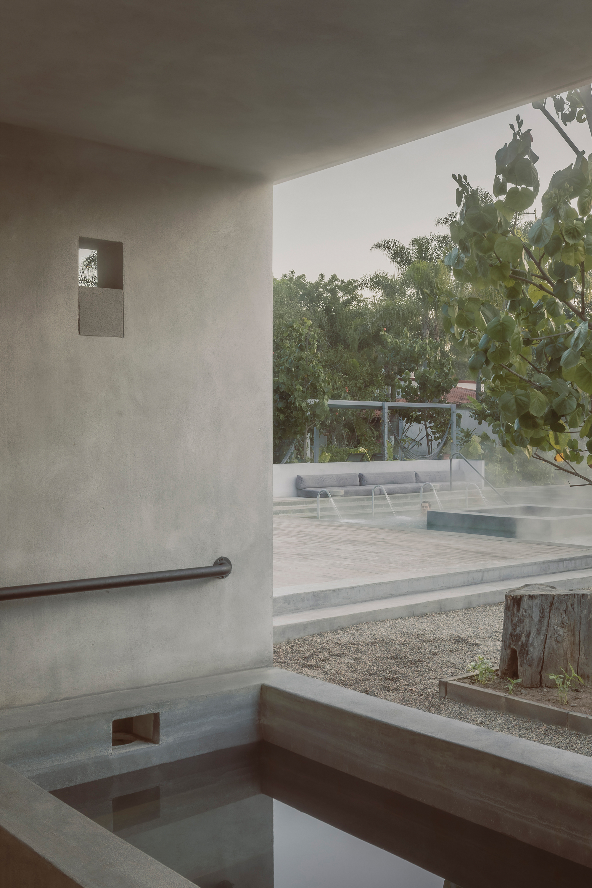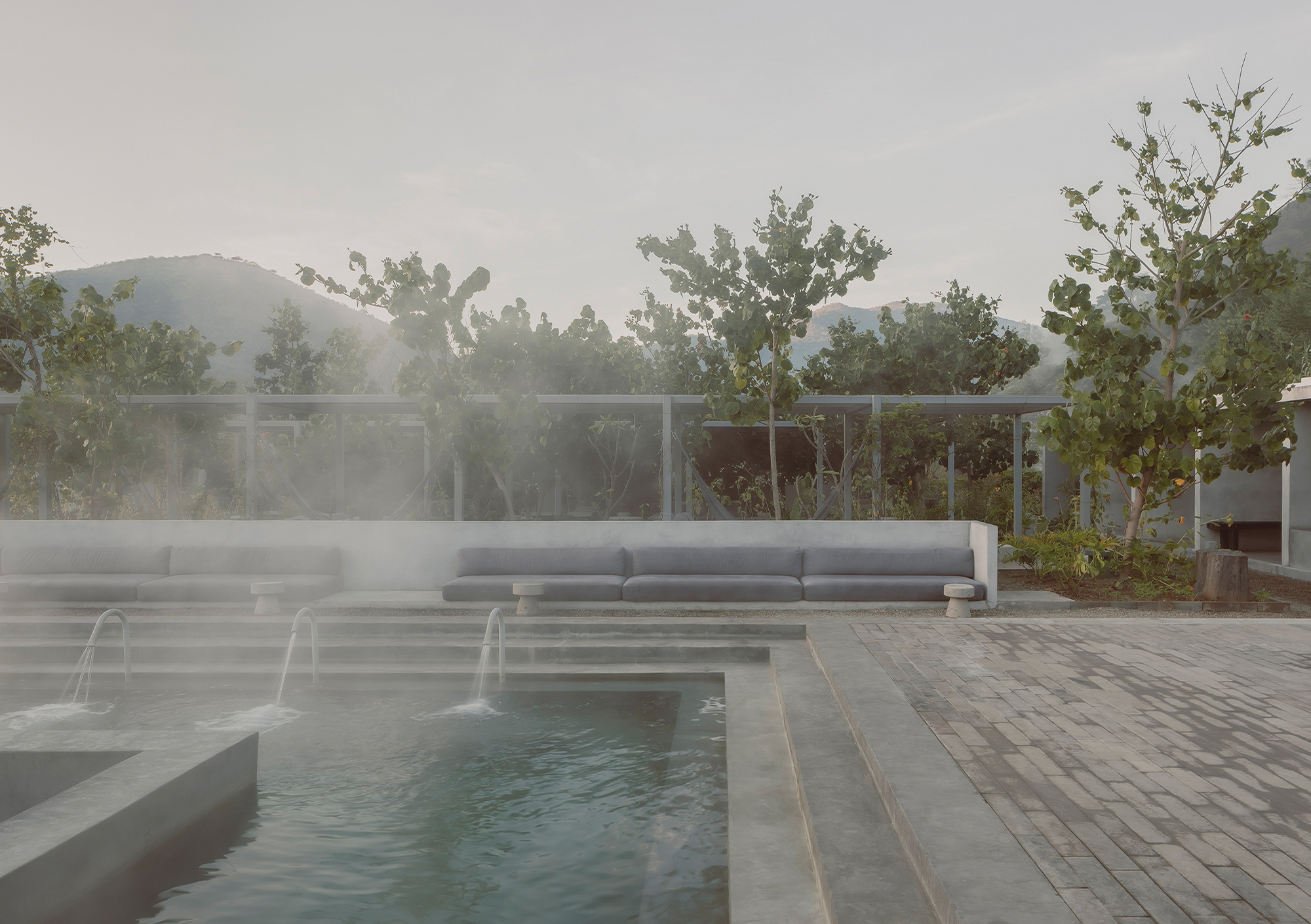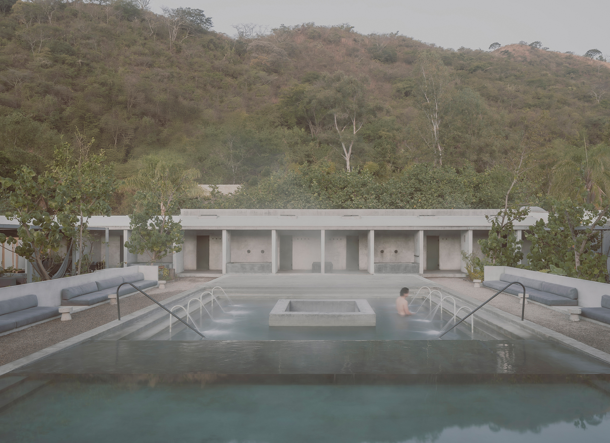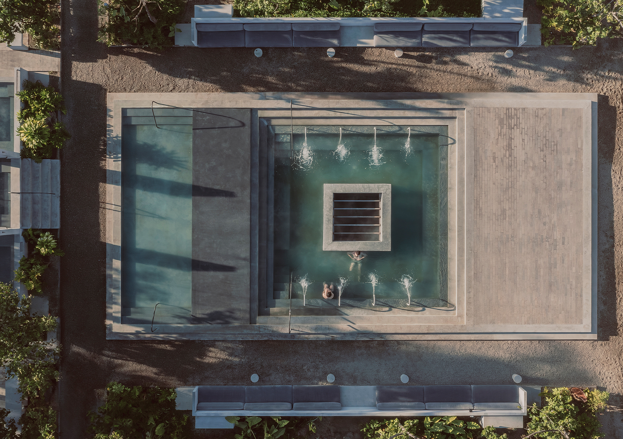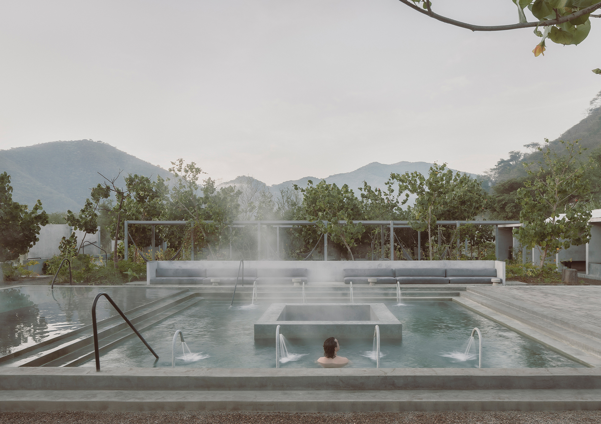 The garden’s architecture is minimal but precise. The materials –pigmented plasters, gravel, local stones– are chosen to blend with the environment rather than stand out from it. There is no artifice: only planes, shadows, and paths that invite a slowing down, a conscious immersion in temperature, gravity, and sound. Jardin de Aguas Termales is a choreography of heat and coolness, of emptiness and body. A place where water springs from the earth’s center and, in passing through it, one returns to oneself.