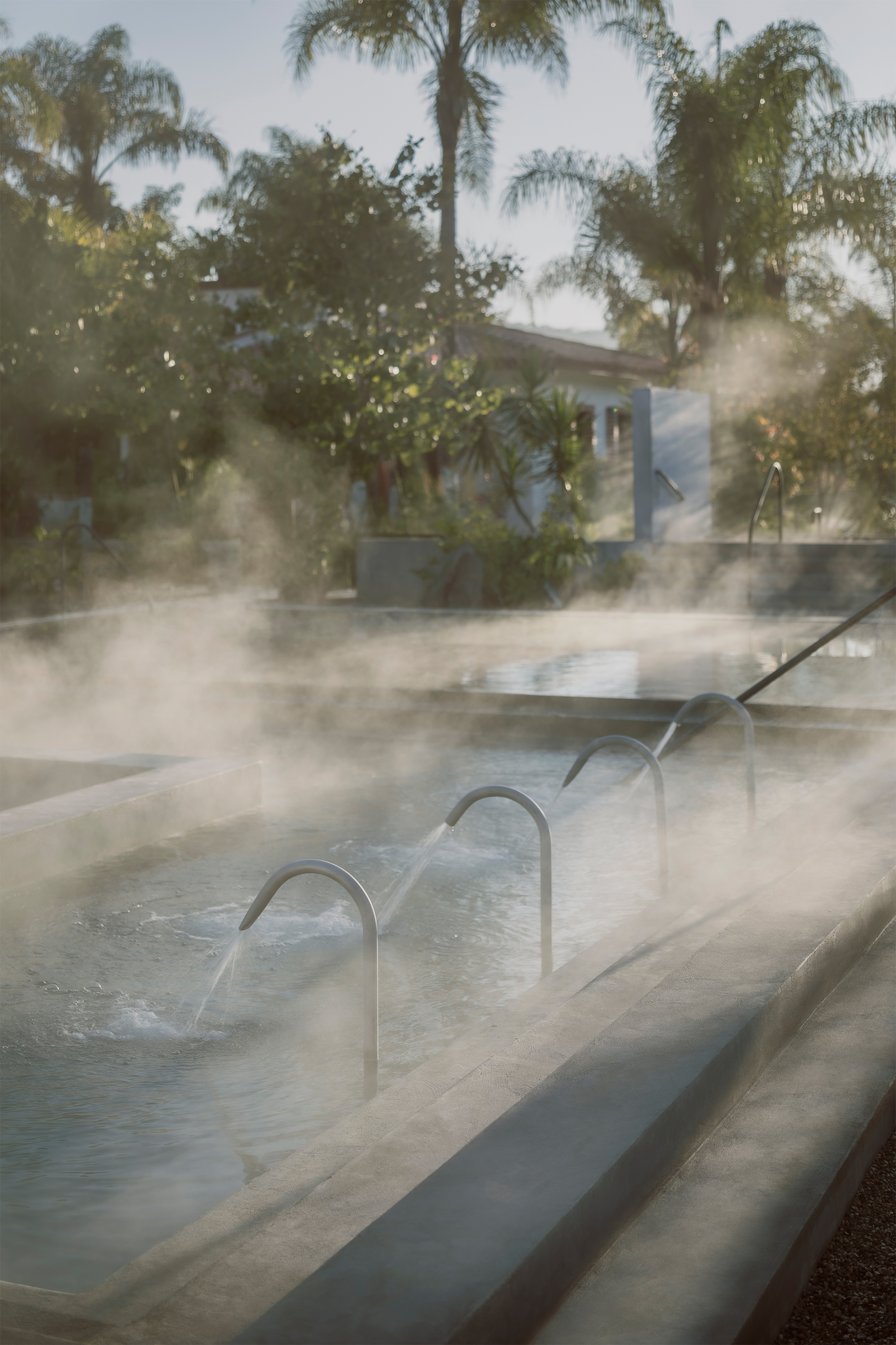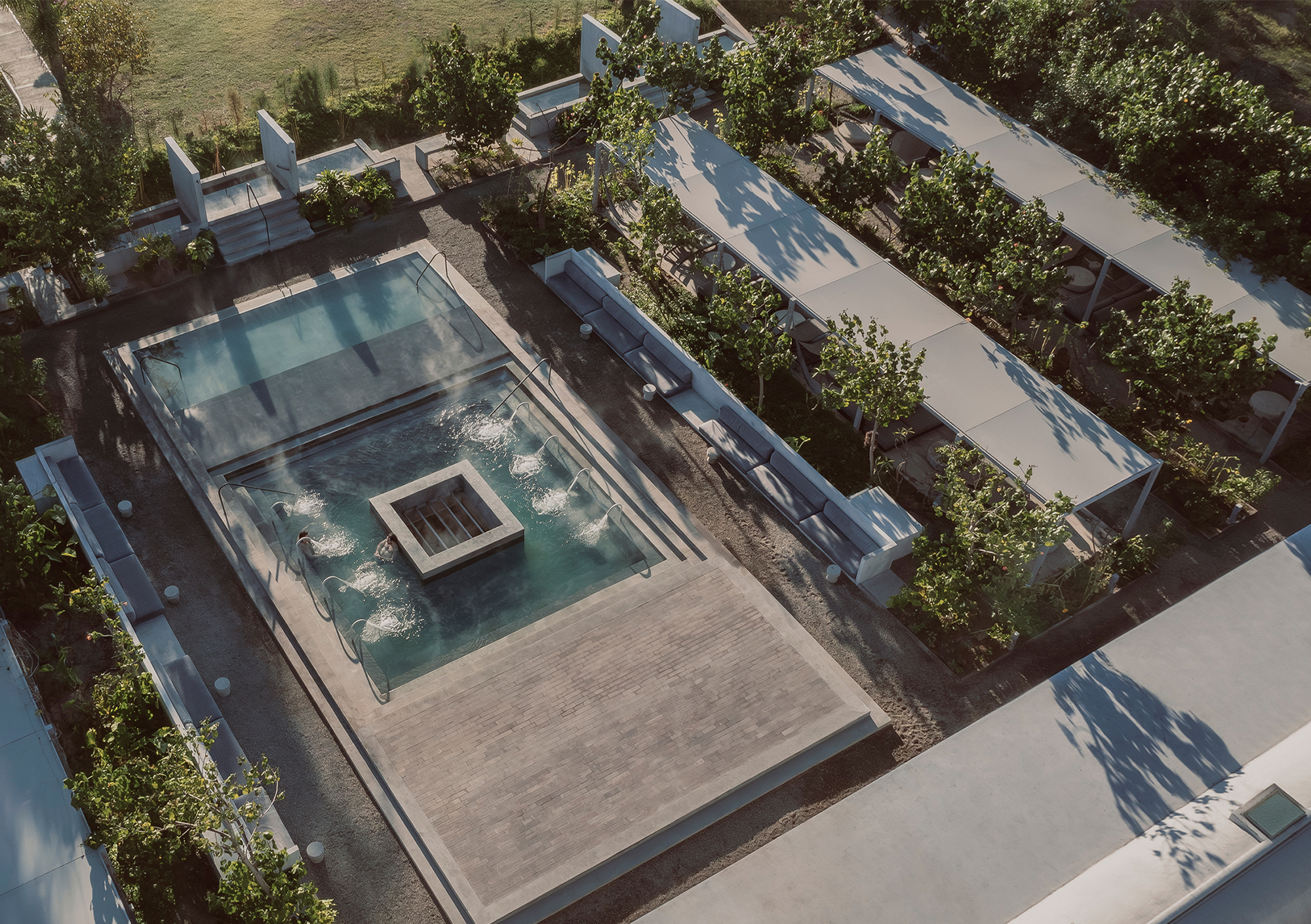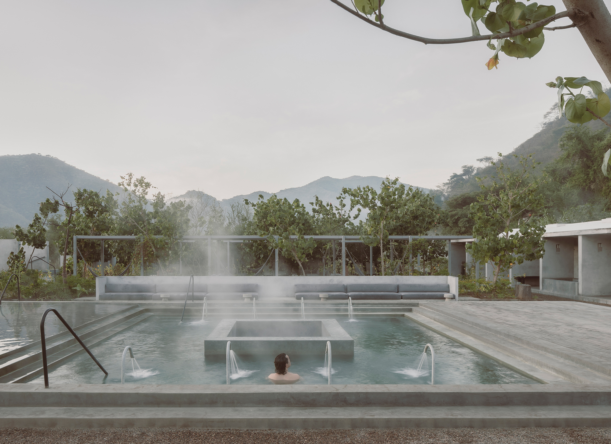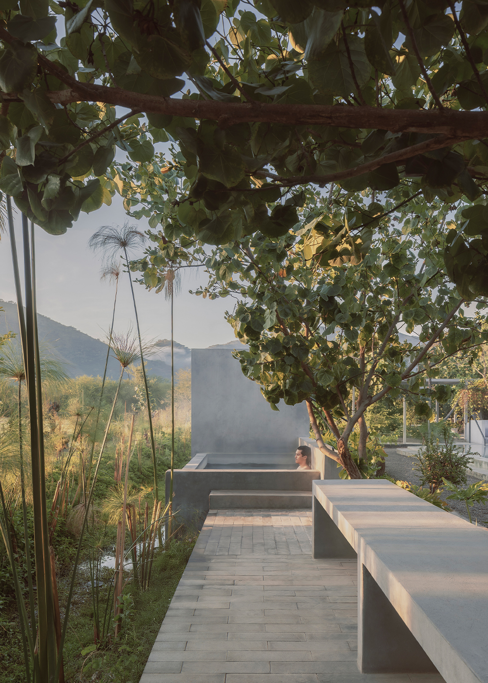 The garden’s architecture is minimal but precise. The materials –pigmented plasters, gravel, local stones– are chosen to blend with the environment rather than stand out from it. There is no artifice: only planes, shadows, and paths that invite a slowing down, a conscious immersion in temperature, gravity, and sound. Jardin de Aguas Termales is a choreography of heat and coolness, of emptiness and body. A place where water springs from the earth’s center and, in passing through it, one returns to oneself.