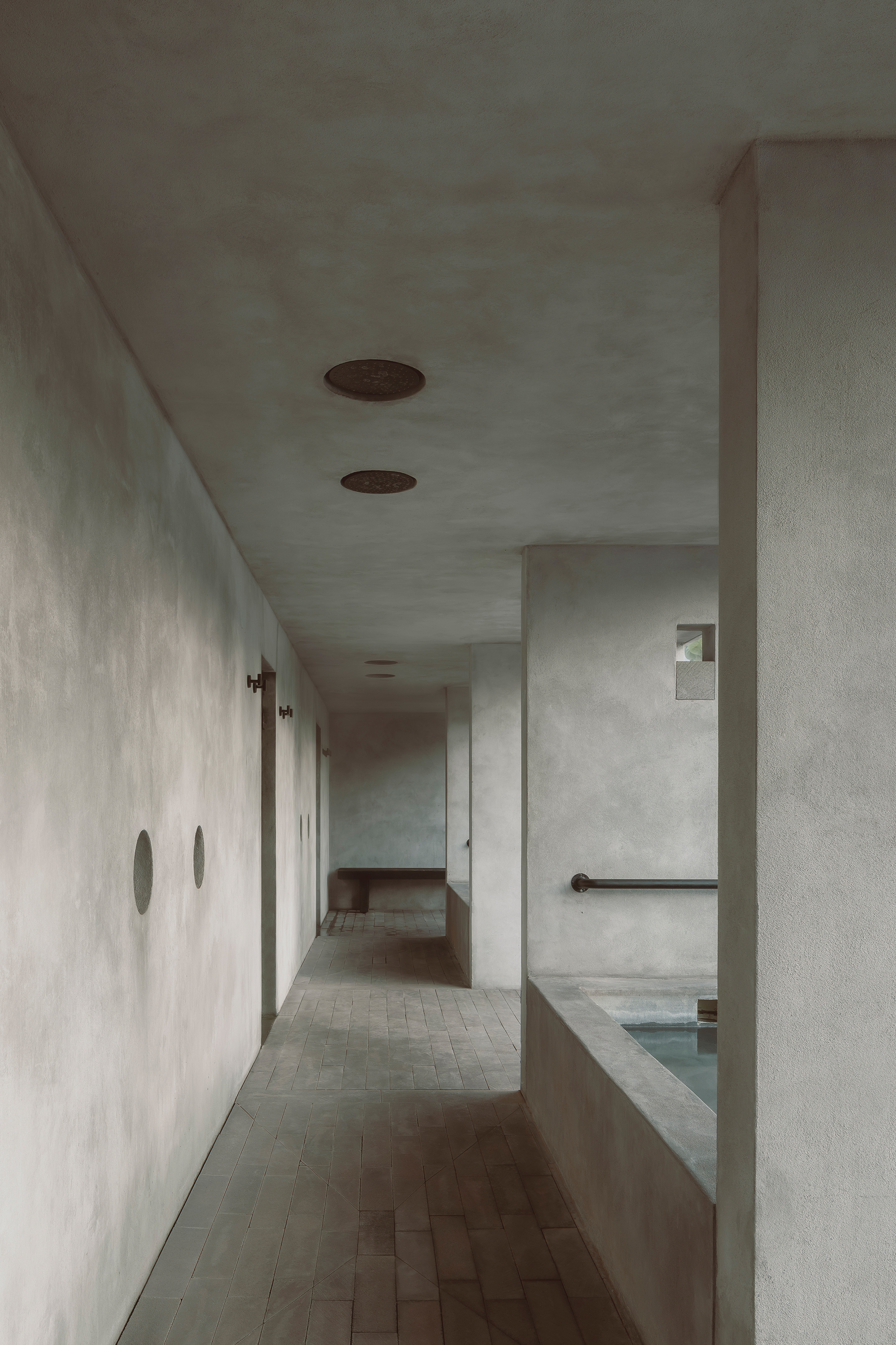 The northern zone gathers a series of steam rooms arranged linearly, like individual thermal cells, enclosed within thick walls that retain heat. Preceding these rooms, an open-air pavilion acts as a threshold and transition between outside and inside: it contains cold plunge pools and showers, where the abrupt change in temperature activates the body. This pavilion also establishes an entry rhythm that brings order and pause to the experience.
