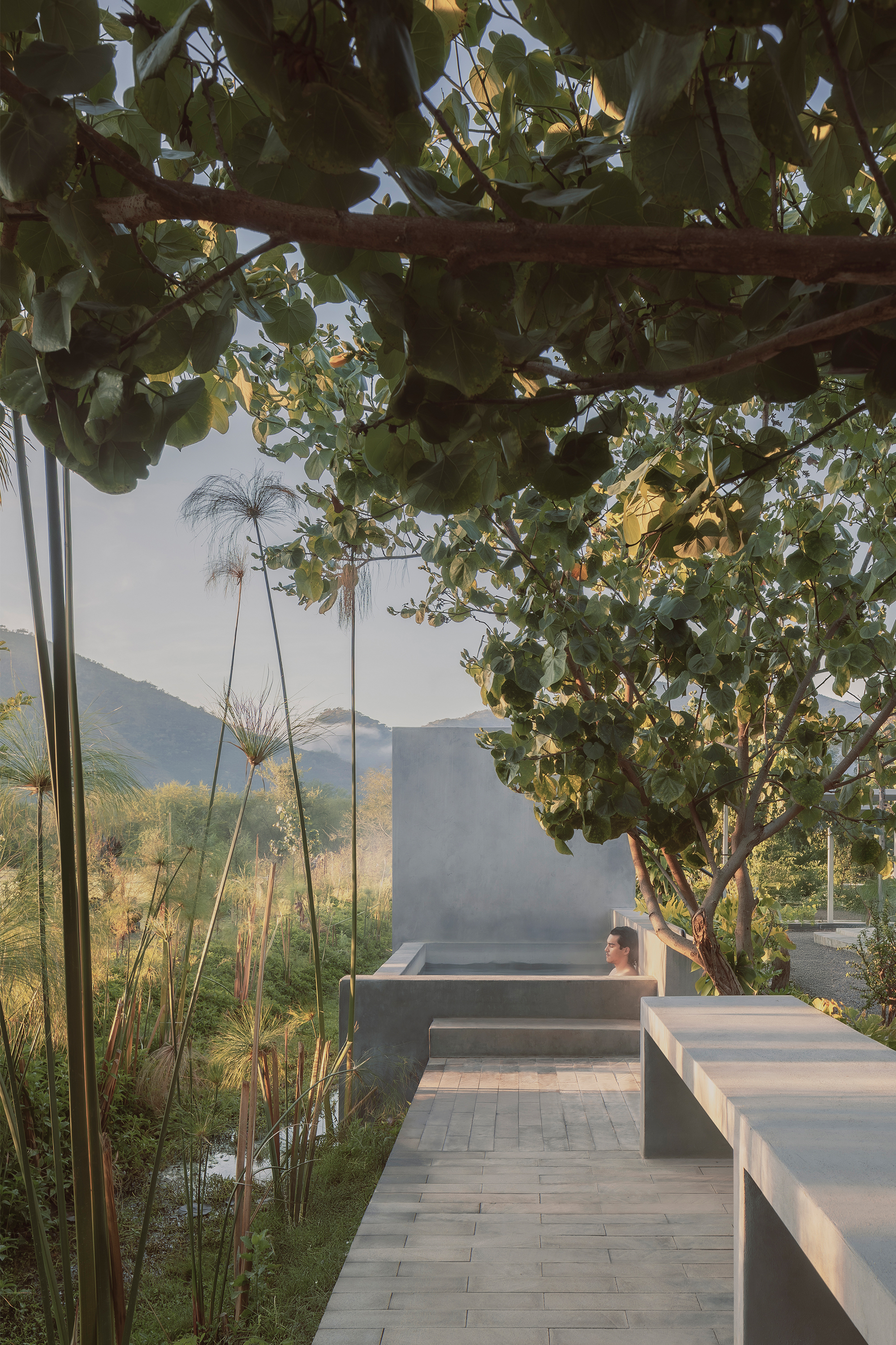 At the southern end of the garden, a group of open-air thermal pools unfolds alongside the path of a natural rainwater channel. These lower-temperature pools are in direct contact with the site’s endemic vegetation, allowing for a visual and sensory immersion in the landscape. The experience here is more expansive, open to the sky and surroundings.