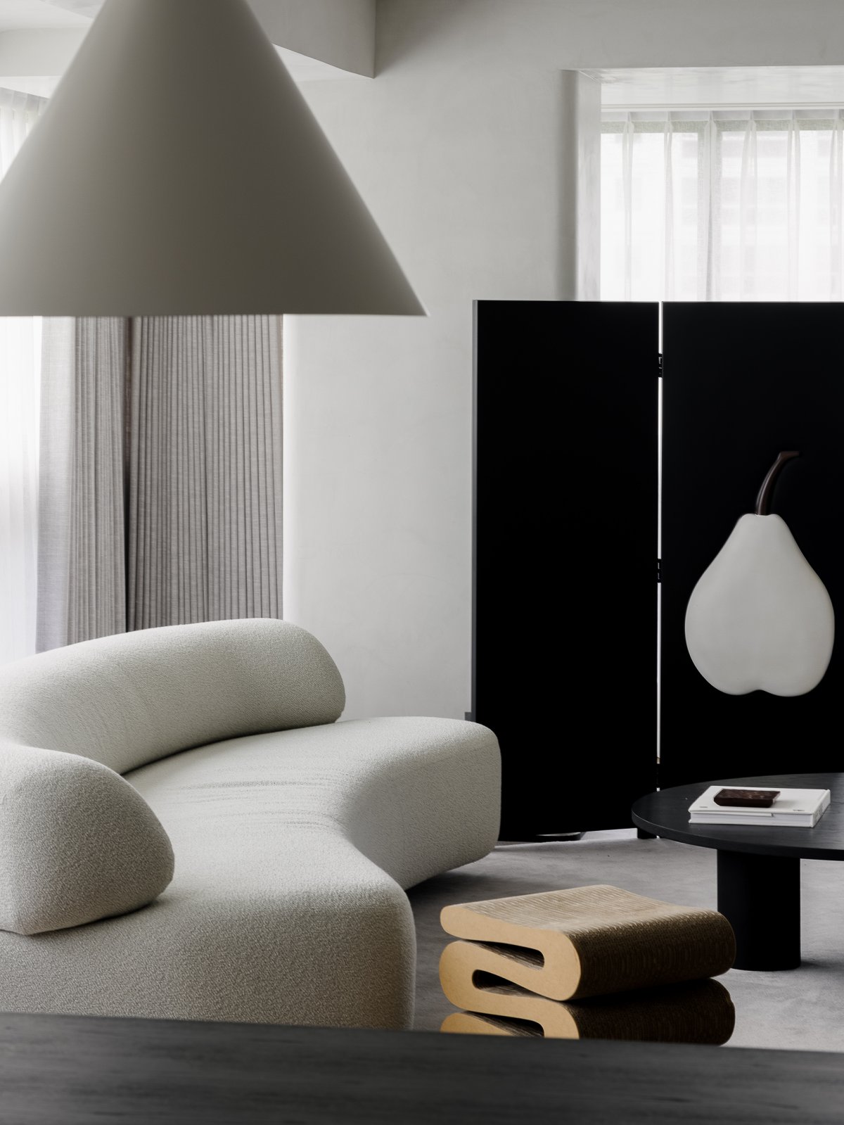 The curved sofa embellishes the minimalist atmosphere of the living room, condensing a light and simple frame in a complex aesthetic, making it an ingenious balance in the visual space.