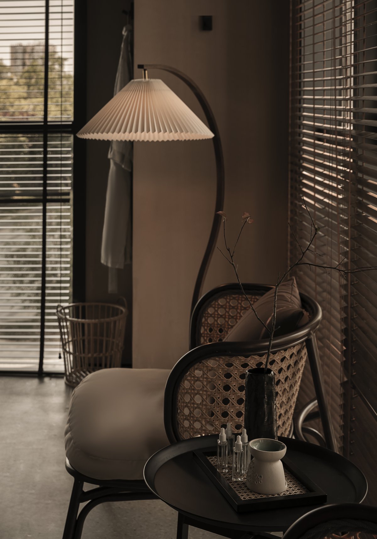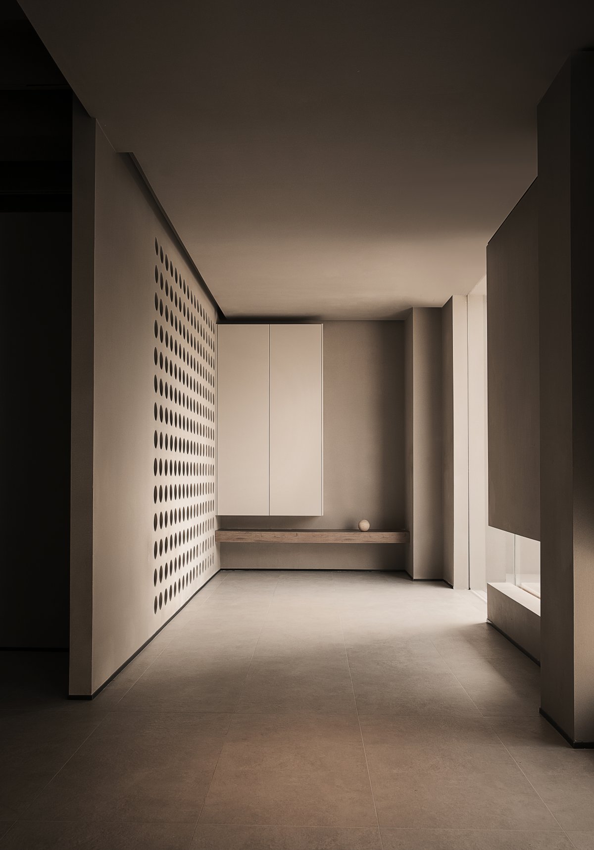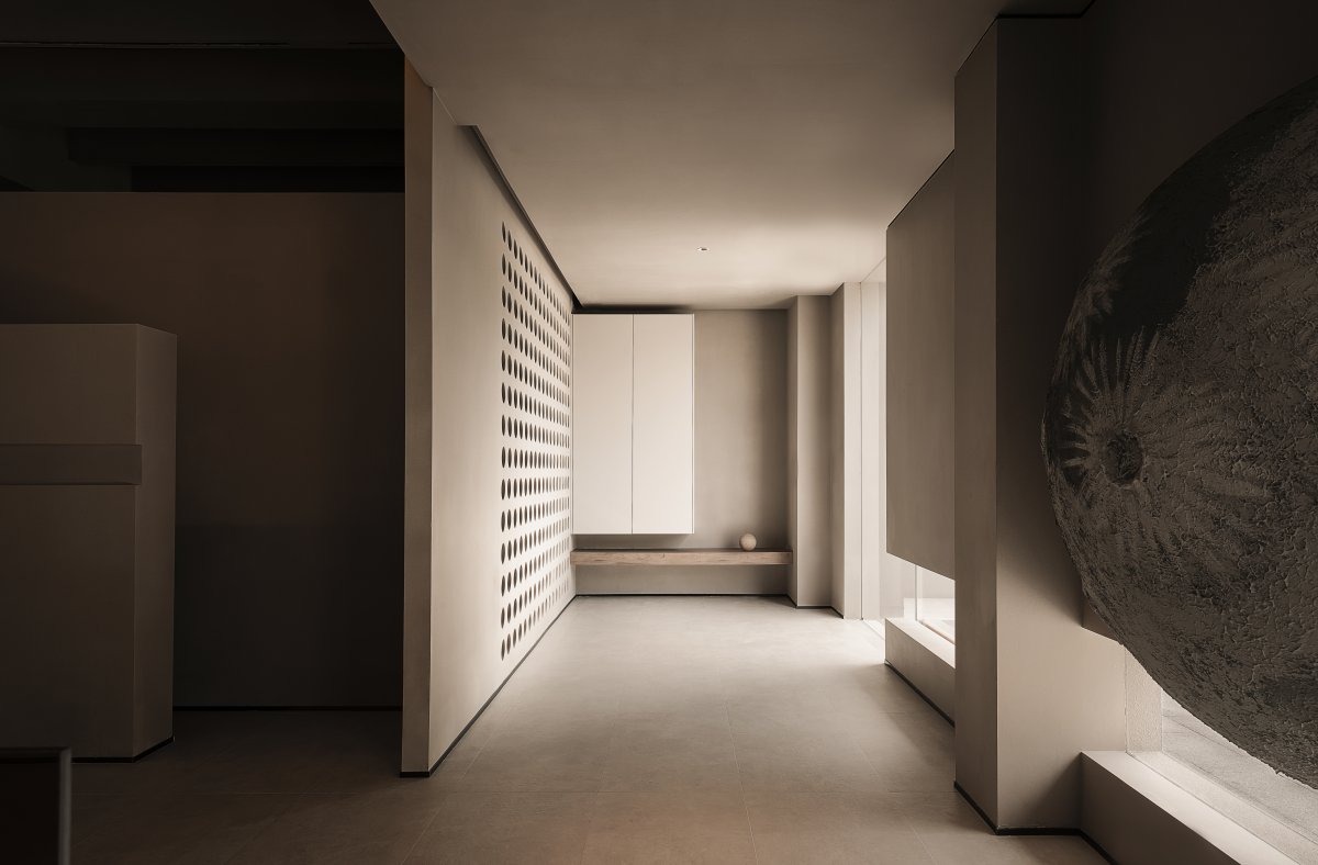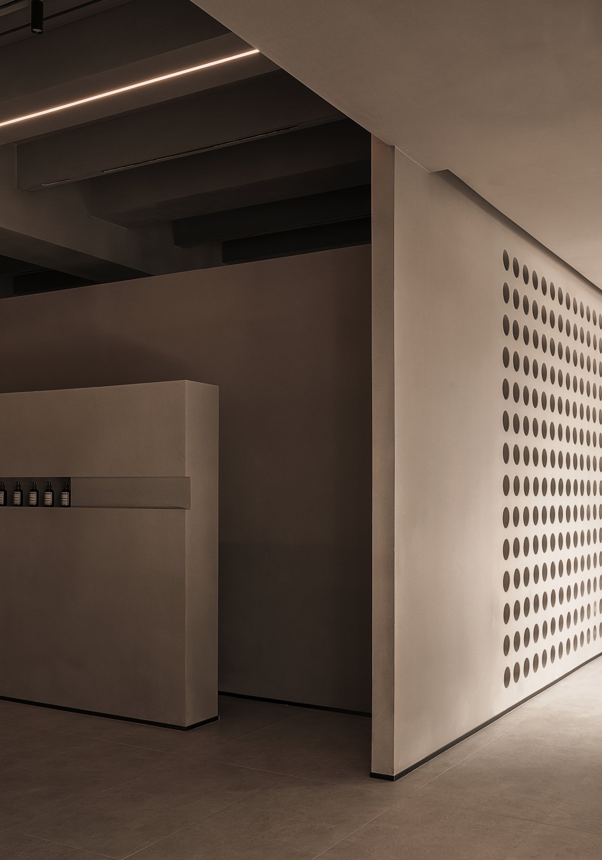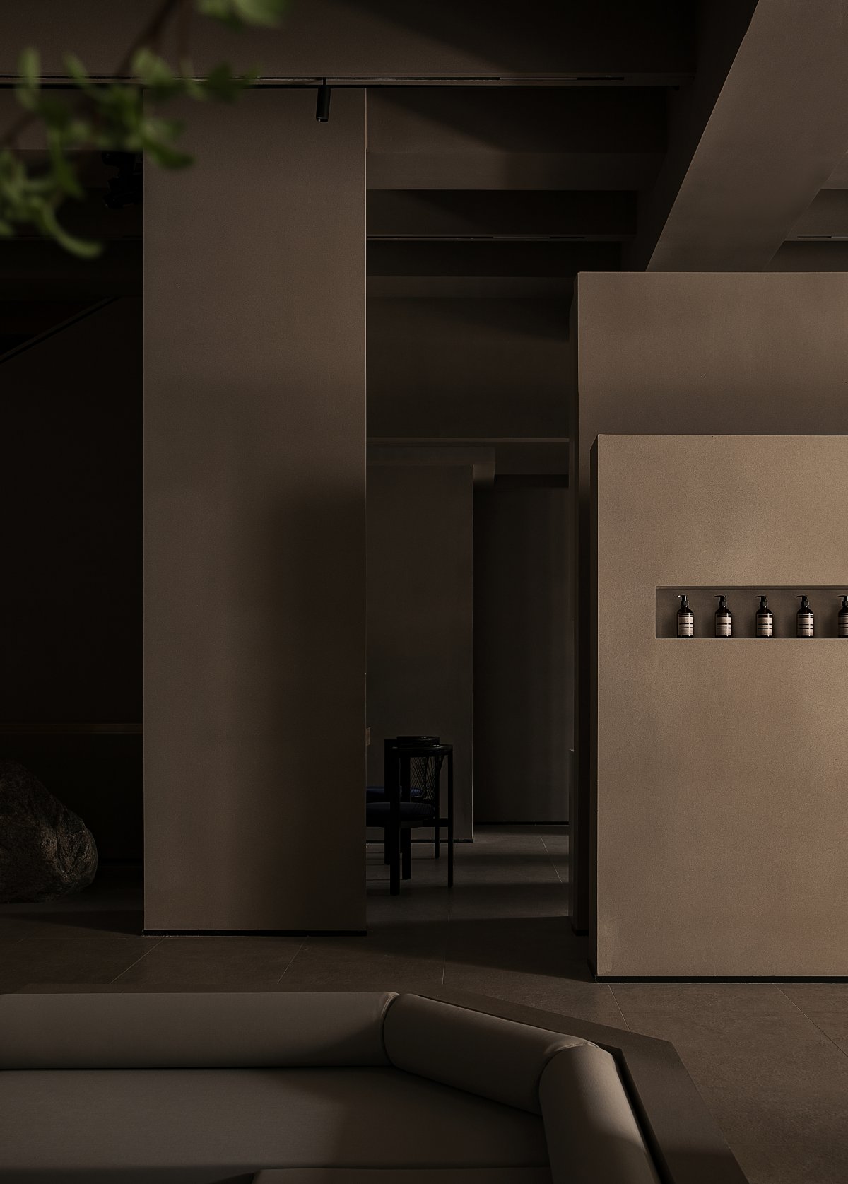 A minimalist design language was used to shape both the structure and form of the space. While maintaining the simple geometric form of the existing space, the design team enriched its diversity through furniture furnishings. At the same time, the careful selection of materials controls all kinds of possible noises and avoids the complexity and pomposity of the space. The overall choice of materials and color palette is based on eco-friendly wood and beige gray color, aiming to bring a comfortable and relaxing experience to customers.