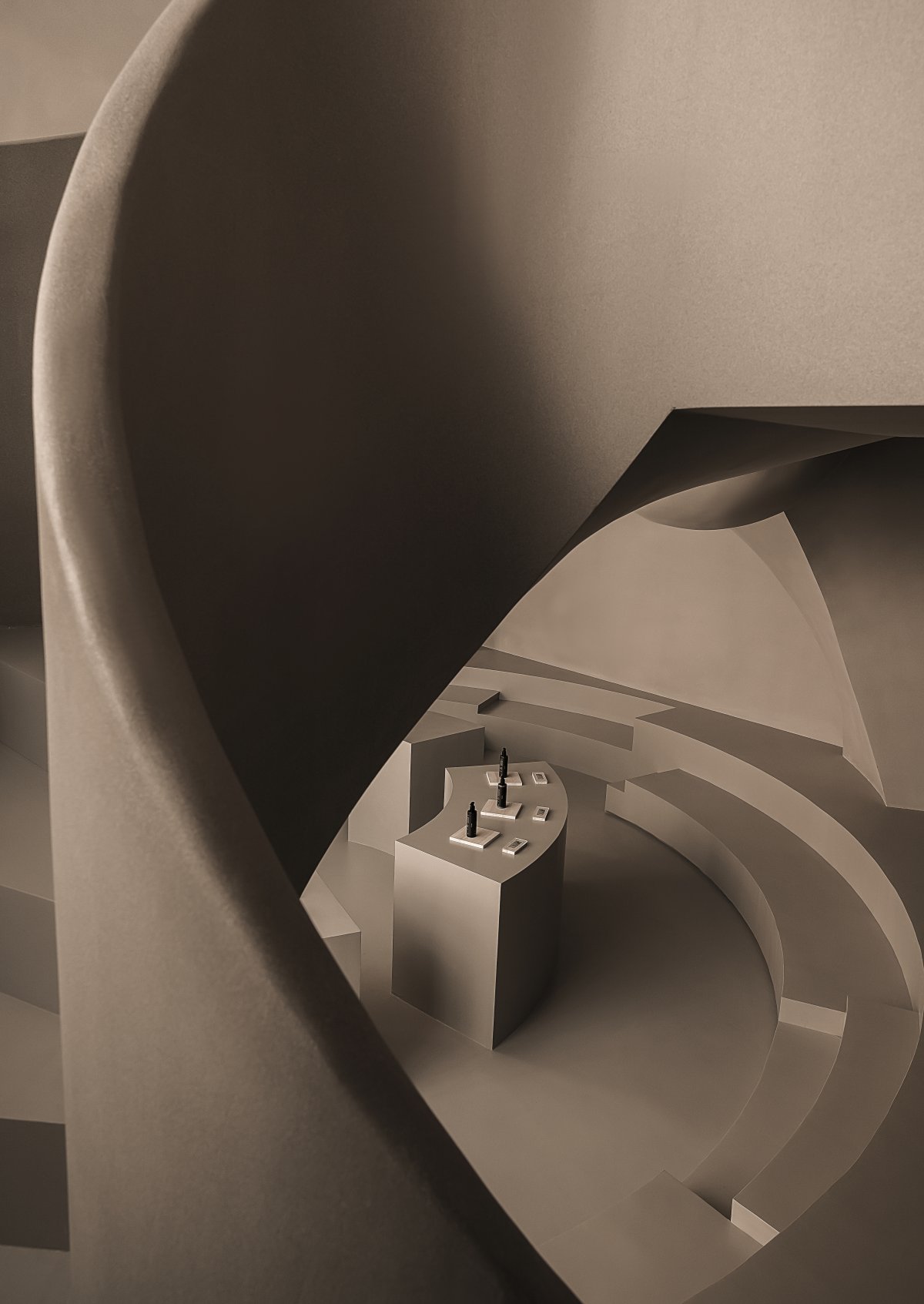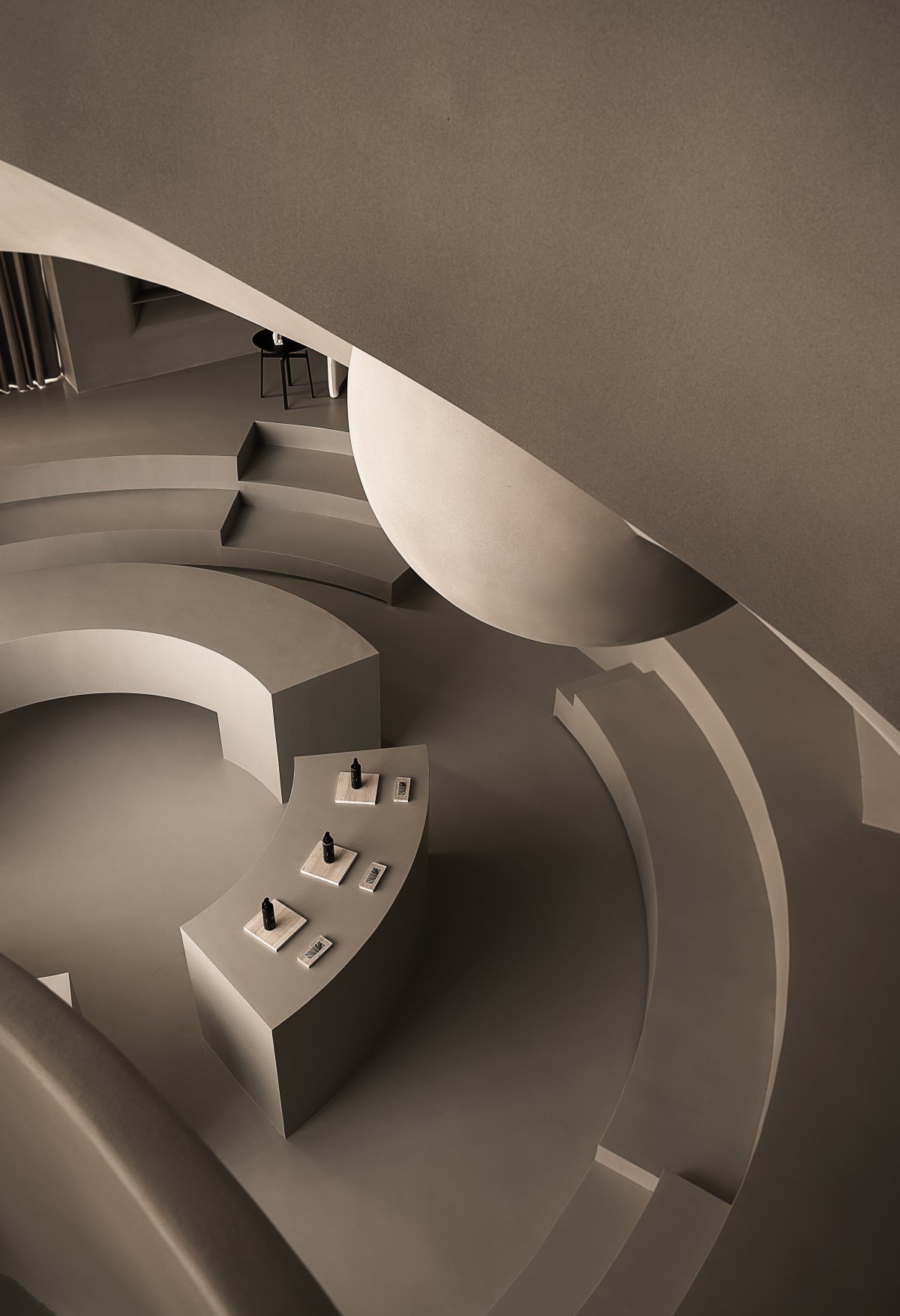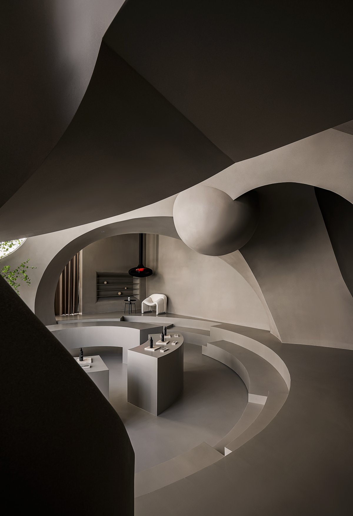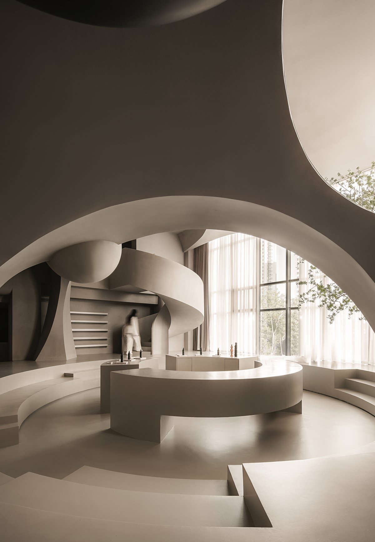 Imagine the space as a box, add or subtract in the box with multiple spheres of deformation, open the originally closed box, introduce multi-level light, and reorganize the functional flow and structural material relationship, so that it visually presents the building itself as a force growing, top to the surrounding walls in a momentary state, and dialogue with the surrounding environment in a harmonious conflict, providing a comfortable place for communication, display and rest.