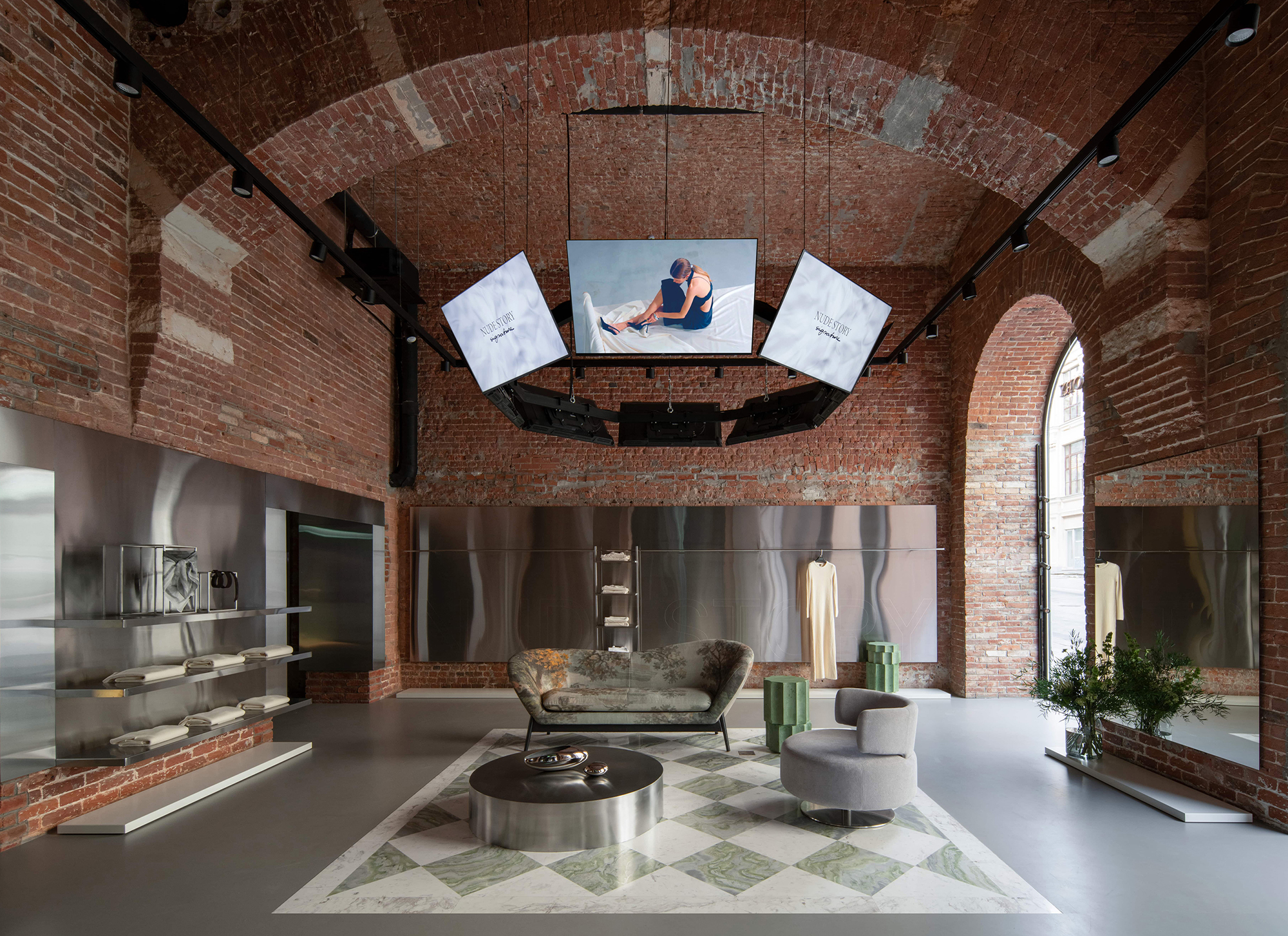 Nude Story flagship boutique on Kuznetsky Most in Moscow For the shop the brand has chosen a building from 1899 - the profitable house of A.S.Khomyakov at the intersection of Kuznetsky Most and Petrovka. A fashion house, a digital gallery or a palazzo from Italian furniture catalogues? We wanted to unite all three themes in the new flagship Nude Story on Kuznetsky Most. All these 3 trends are united by grand and inspiring architecture, airy layouts and high ceilings.