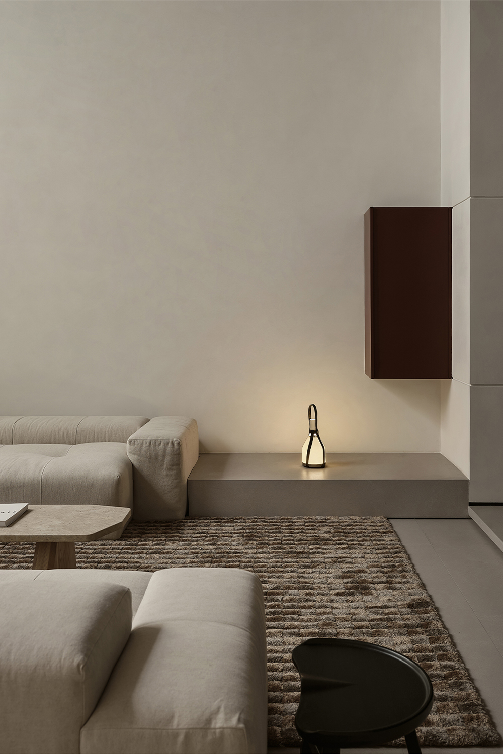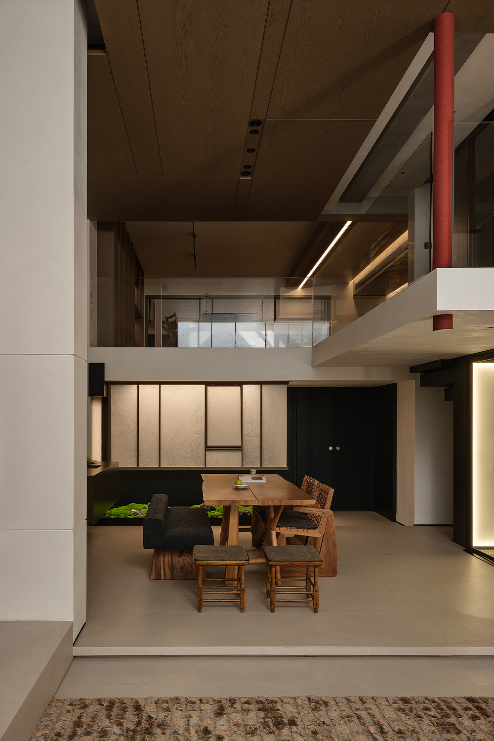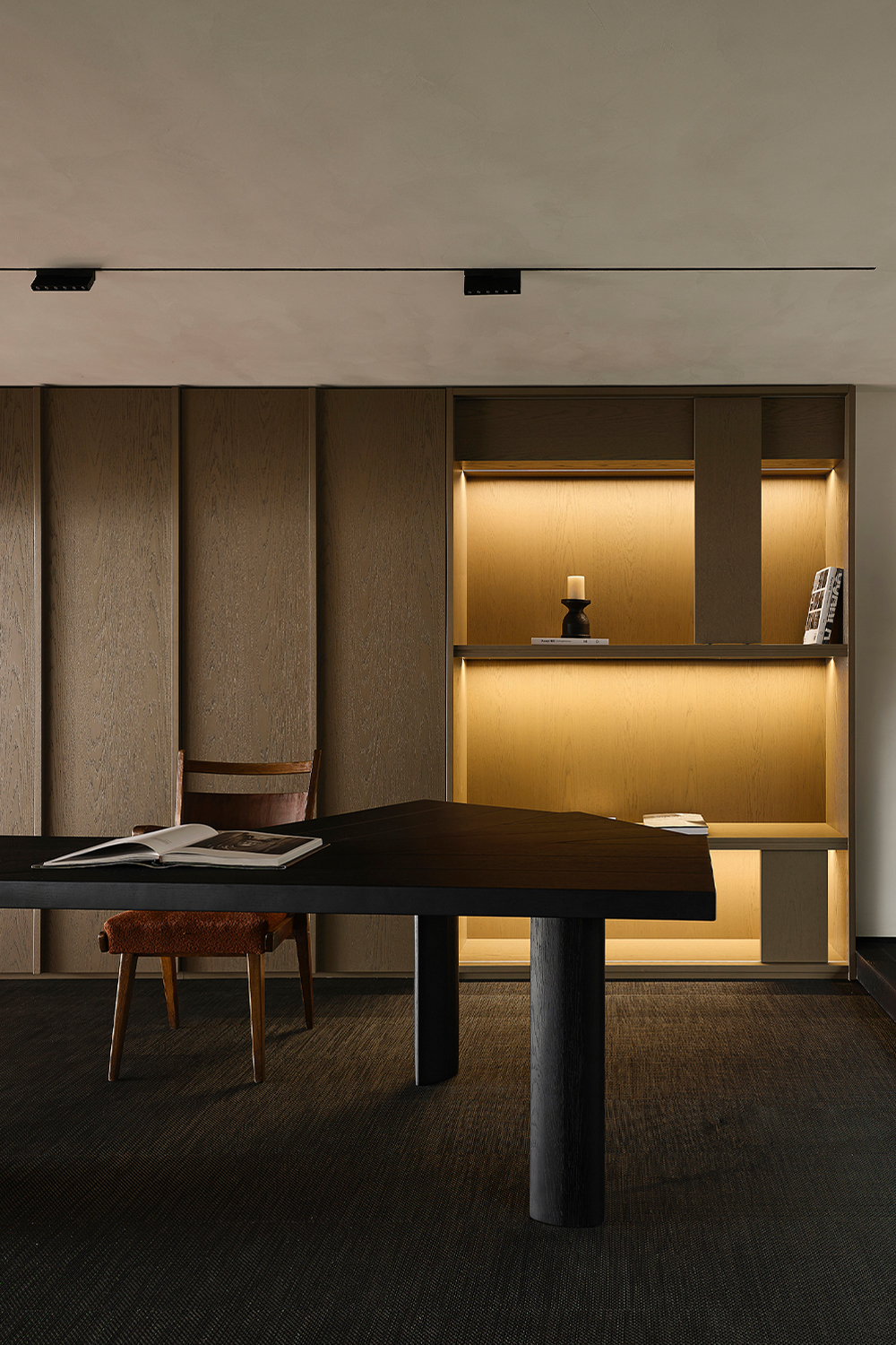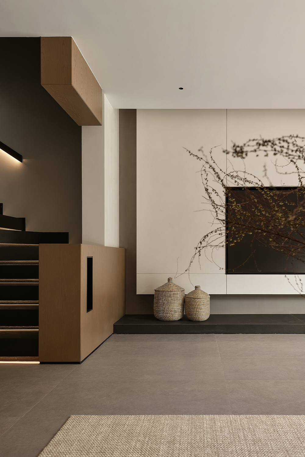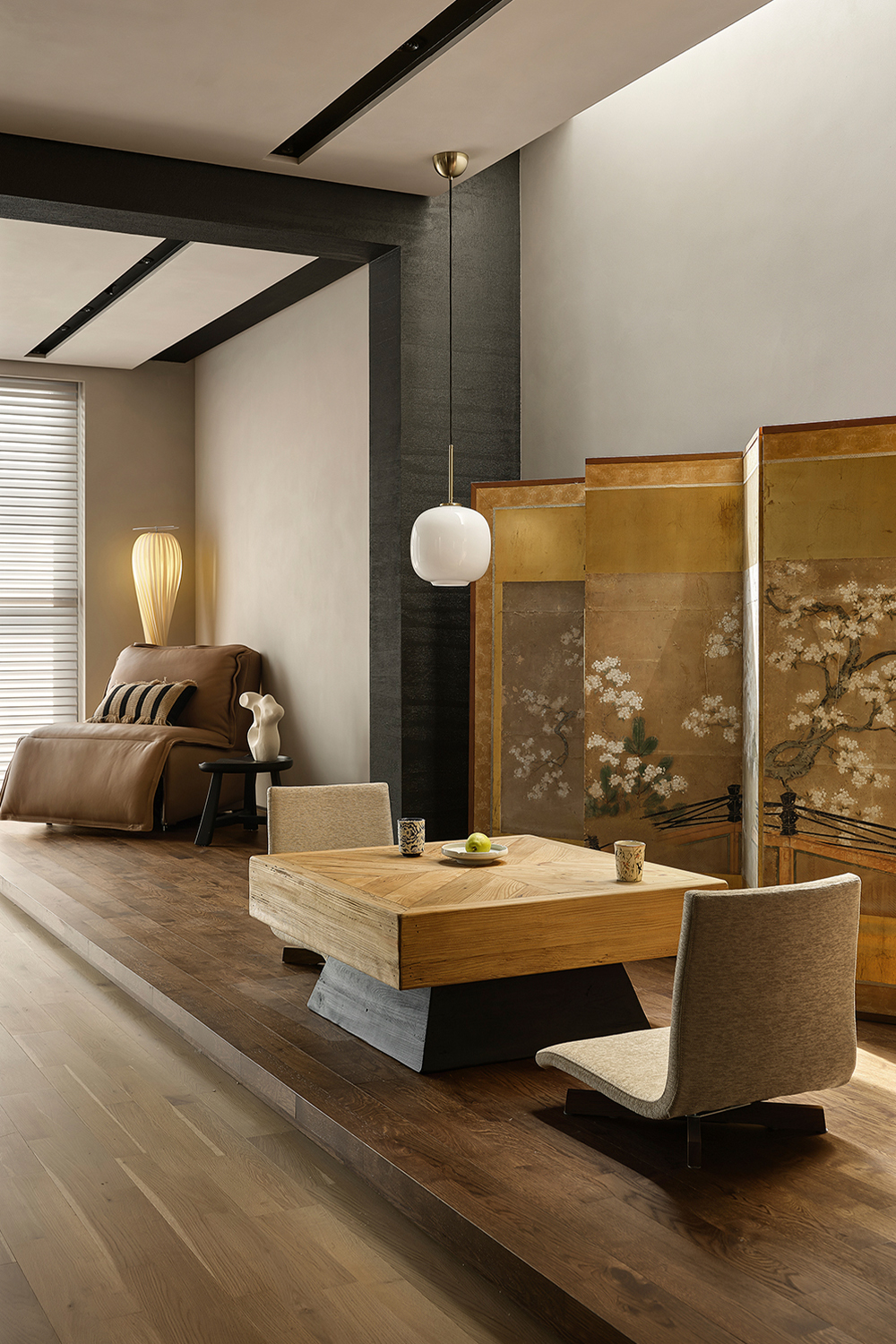 In handling the basement space, we retained its 4.7-meter ceiling height and added a mezzanine covering only one-third of the area. The design aims for the light from the south-facing light well to illuminate the entire basement and mezzanine to the greatest extent possible. The mezzanine design cleverly utilizes the vertical height to create a semi-open reading or working area. At the same time, the glass railing preserves a transparent visual corridor below, allowing light and sightlines to penetrate the space and creating an interwoven vertical layering. Beneath the mezzanine, modular sofas enclose a sunken, multifunctional lounge area. Together with the wooden tea table on the side, they create a serene tea corner, establishing an intimate sense of scale. The red tea cabinet is built into the wall, and combined with the warm lighting strips, it creates a calm and serene atmosphere. Living here is no longer just an accumulation of functions; it is a serene narrative woven from light, shadow, materials, and memories. Day after day, it settles into the deepest, most genuine warmth of the home. The home thus becomes no longer a mere container, but a living entity that grows alongside the passage of time, silently witnessing the beauty of everyday life.