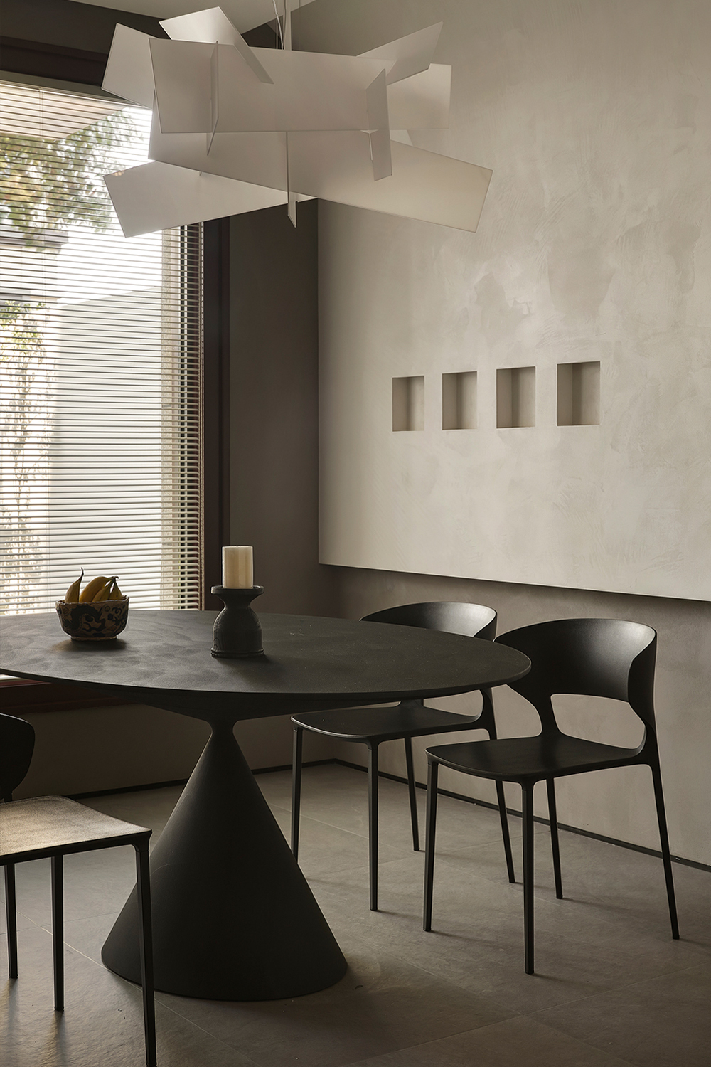 The first floor serves as the core area for daily living, integrating the living room, dining room, and open kitchen to facilitate more natural and fluid interaction among family members. After removing the original partitions, the space opens up. A full-height south-facing window brings in ample light, while the greenery of the courtyard outside subtly permeates the interior. The floor is laid with light gray textured tiles, with seams hidden within the flowing patterns, as if the footsteps of daily life glide softly across the surface. The walls retain the natural color of microcement, whose unadorned texture harmonizes with the warmth of the furniture.
