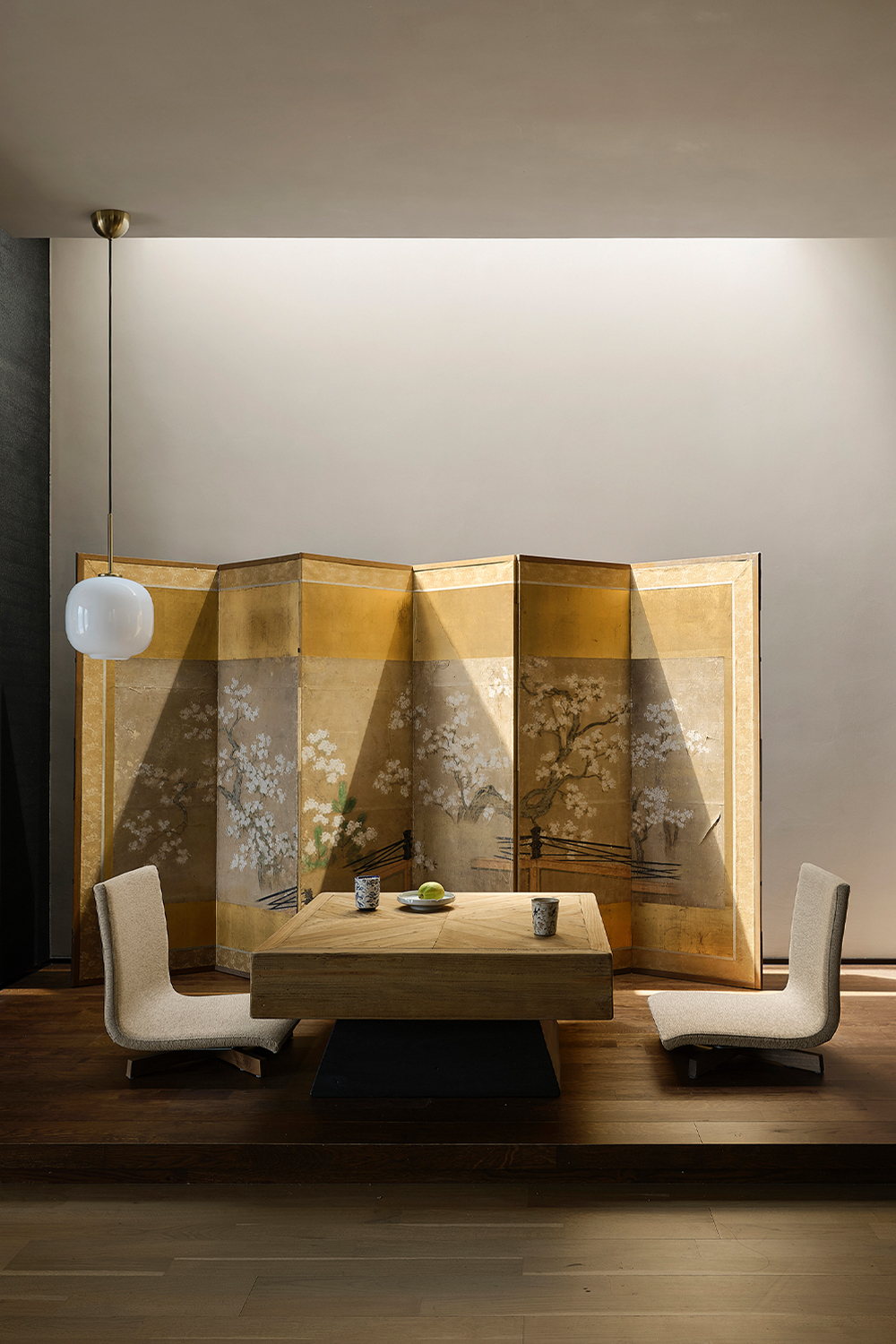 The third floor functions as a complete suite, emphasizing a sense of ritual in daily life right from the entrance. During the structural renovation, the floor above the tatami area was deliberately opened, allowing light to leave traces of time on the walls every afternoon. Large expanses of paint are no longer cold gray or white; instead, they become the textured surface through which the walls seem to breathe. Texture extends along the play of light and shadow, gradually unfolding within the rustic screens, subtly revealing the layers of the space.