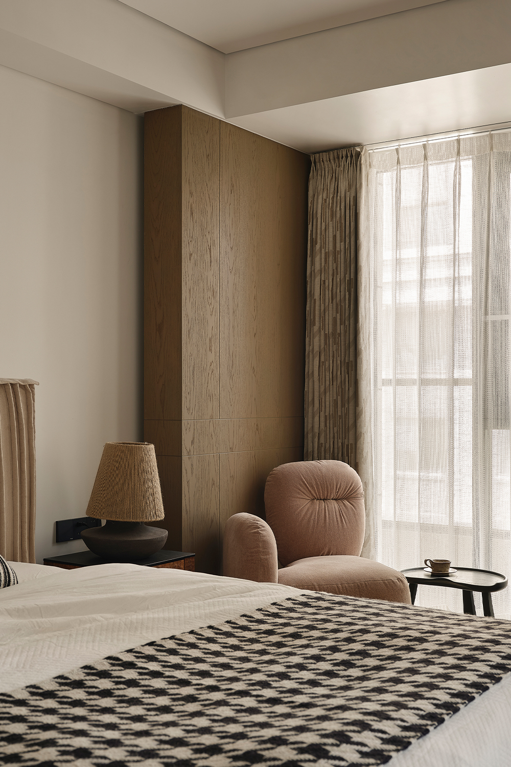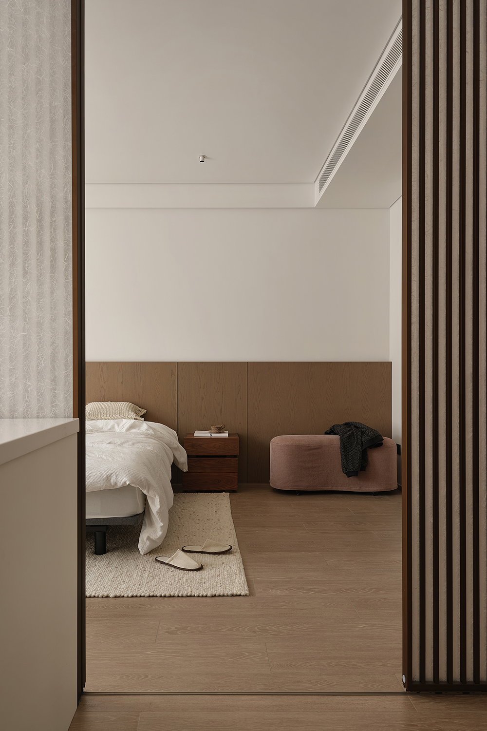 The south-facing bedroom on the second floor is integrated with the laundry area according to the owner's lifestyle. An acrylic screen diffuses soft light and shadow, blurring the boundary between the laundry and the resting area—maintaining privacy while preserving a subtle connection. The space achieves a balance between function and emotion, with every detail responding to the genuine needs of its occupants. The north-facing bedroom on the second floor is designed as an independent suite. By leaving material transitions understated, the space flows into a tranquil atmosphere. The wood paneling seamlessly connects with the wooden floor tiles, creating a warm and restrained private space. The window frames lightly carve the shifting light of the seasons, and when the setting sun shines at an angle, the wooden floor glows with a warm amber hue.