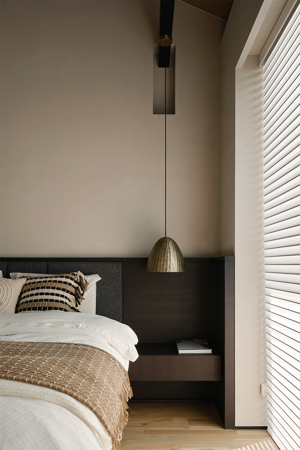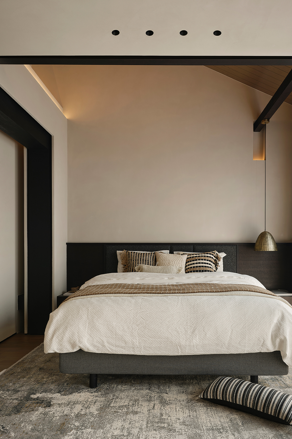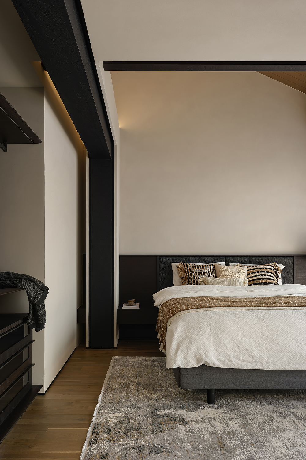 The black beams and columns beside the master bed are not for show; through structural renovation, they create a more comfortable scale in what was originally a cramped bedroom. Additionally, by opening the floor above the sleeping area, the building's originally sloped roof can interact with the beams and columns, creating a unique spatial experience. The wall between the master bathroom and the walk-in closet is made of rippled glass bricks, which not only allow more light to pass through but also add a playful touch to daily life.