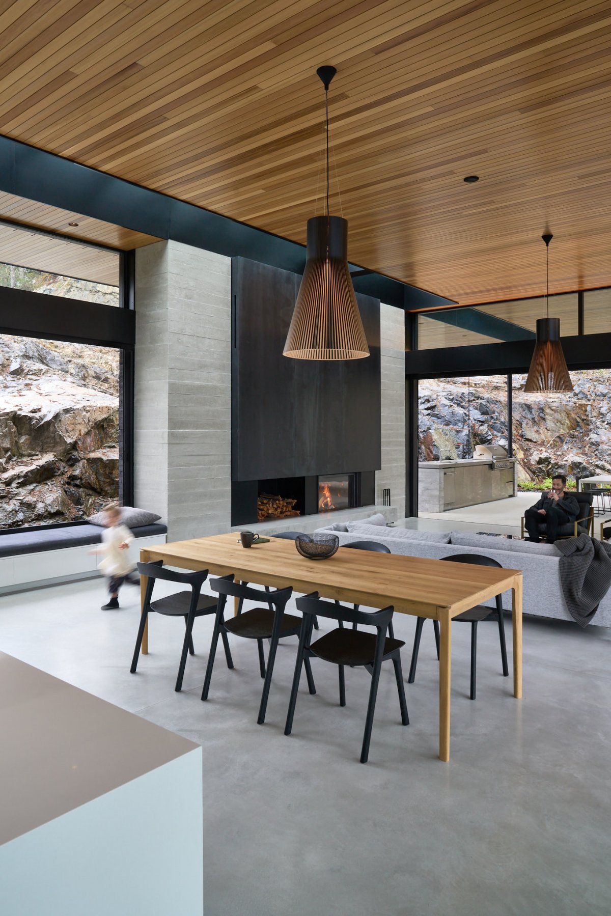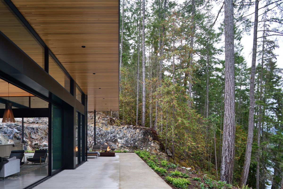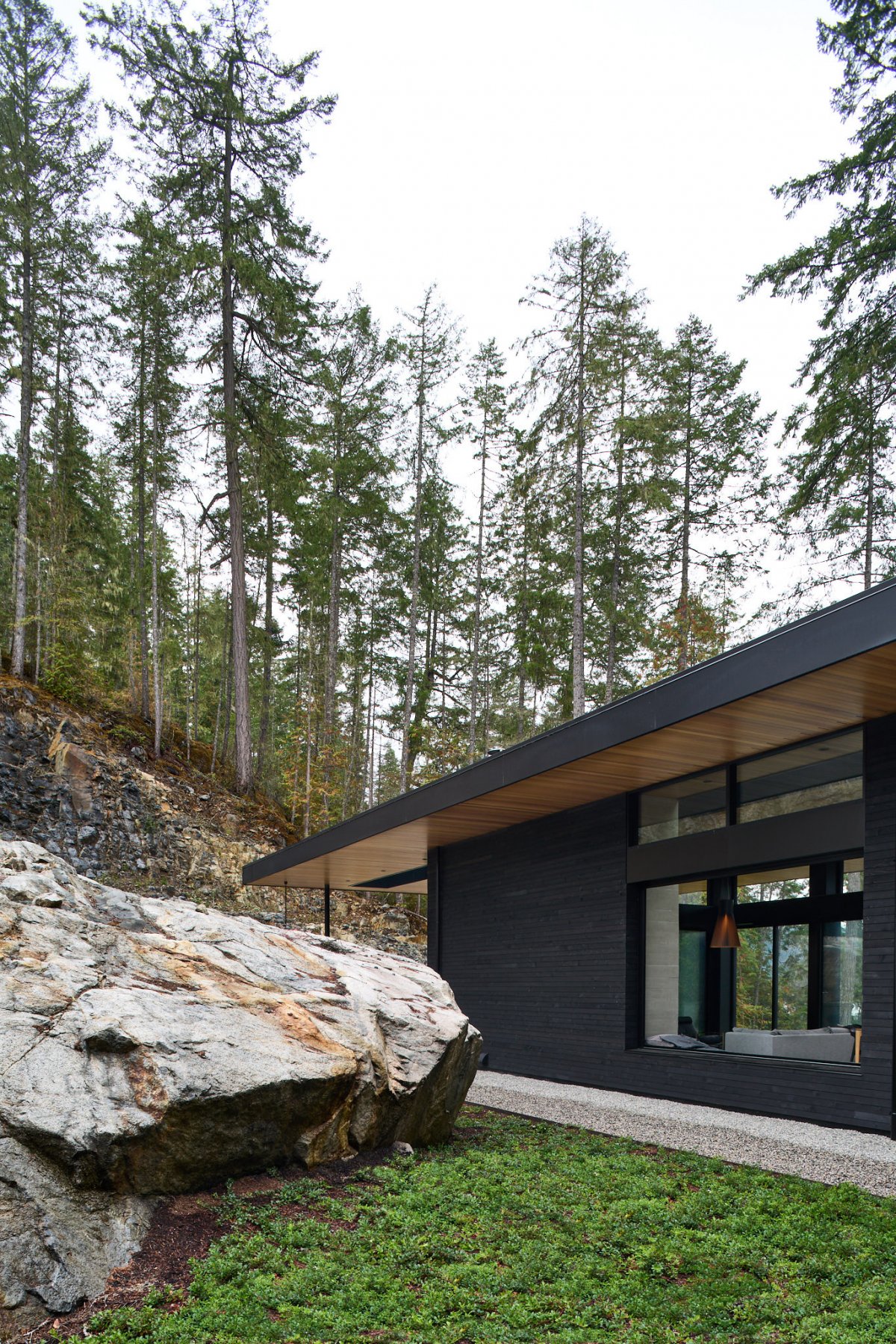 In Sunshine Coast, BC, Canada, Vertes Retrea is a vacation home that WOVEN Architecture and Design designed for a family of four. The house sits on an L-shaped plan above a pristine lake, surrounded by an existing rocky landscape.