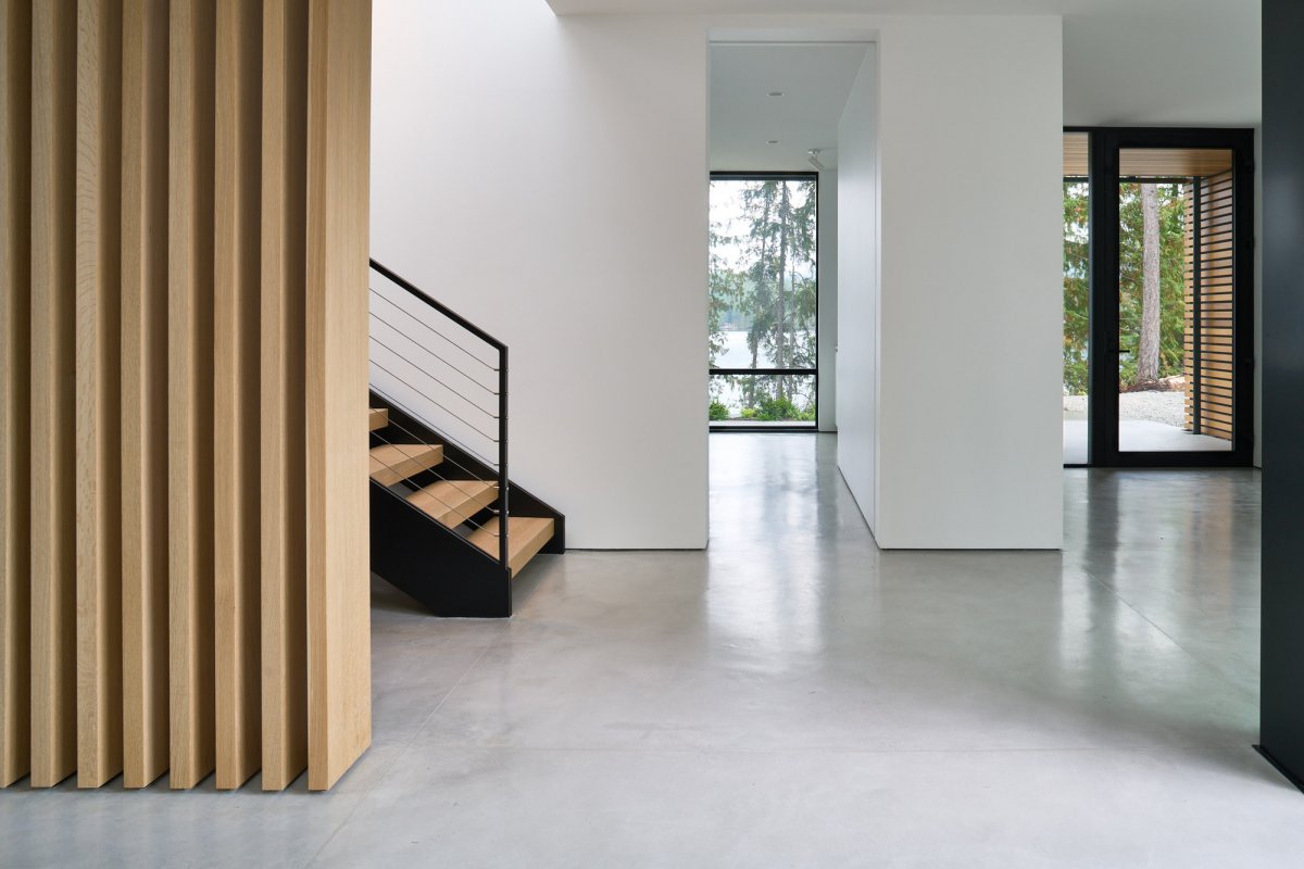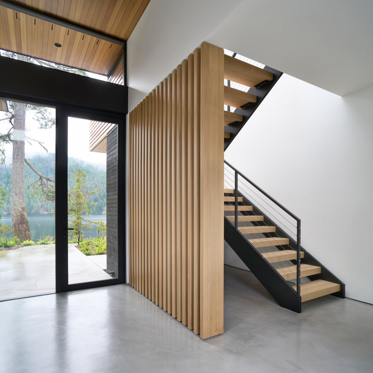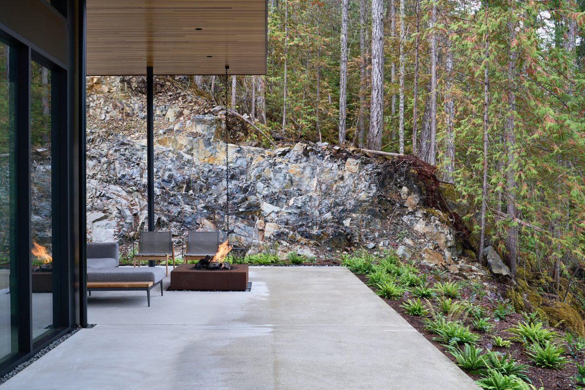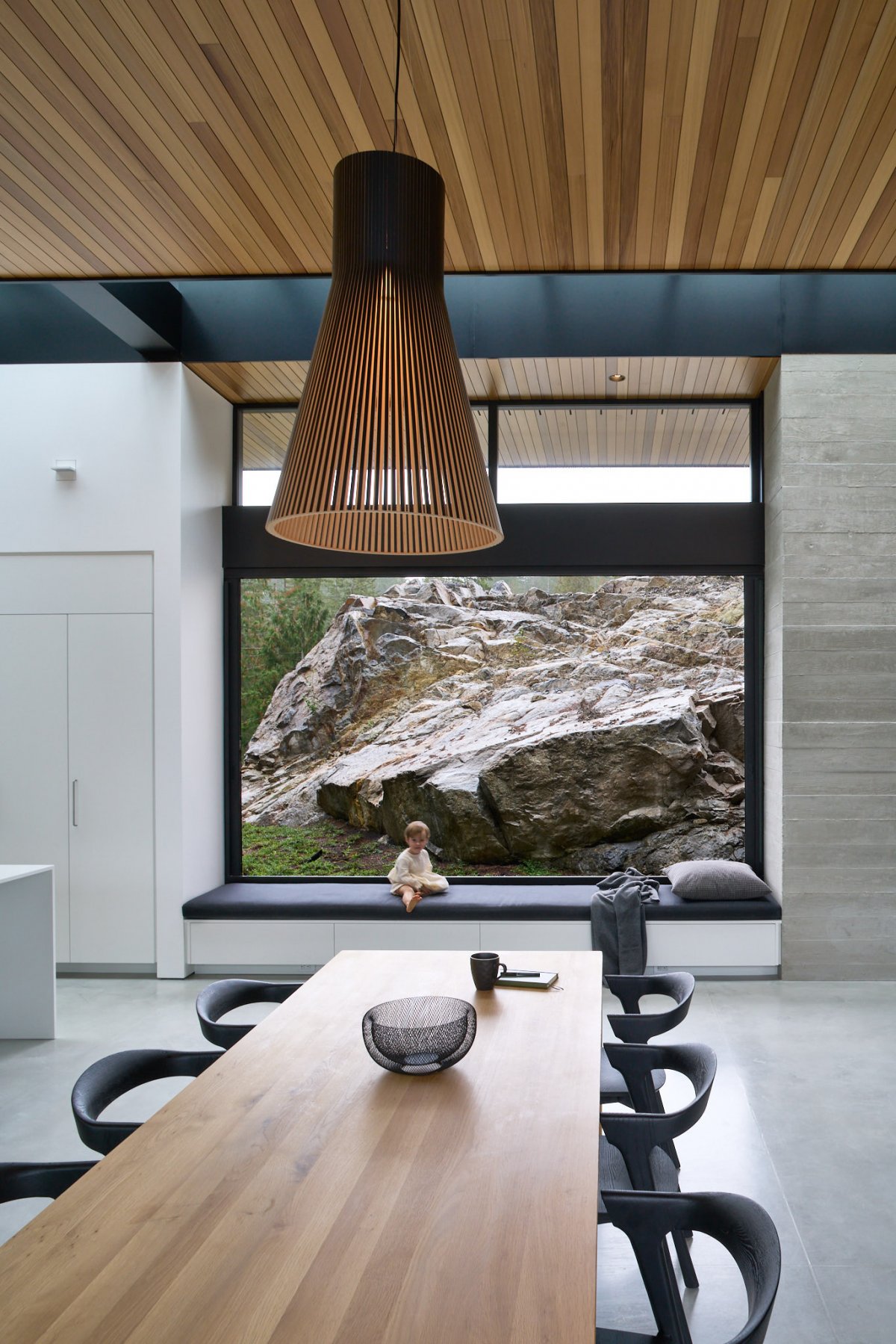 In Sunshine Coast, BC, Canada, Vertes Retrea is a vacation home that WOVEN Architecture and Design designed for a family of four. The house sits on an L-shaped plan above a pristine lake, surrounded by an existing rocky landscape.