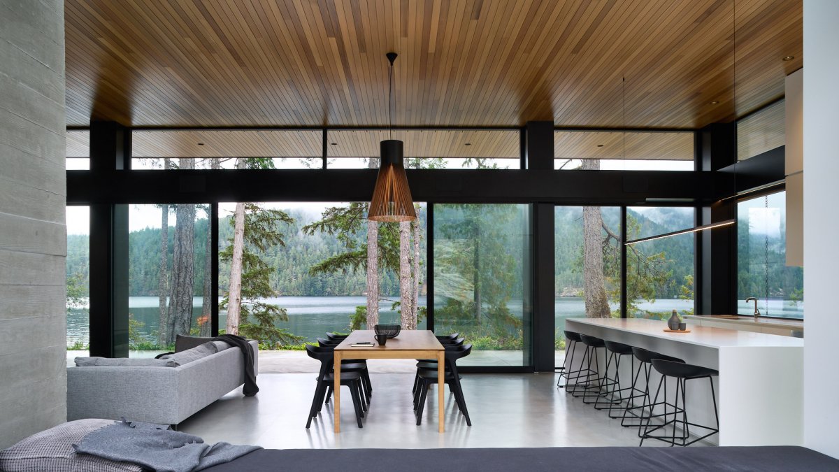 Large glazing runs through the home's frame, carefully framing the stunning views of the lake and the rocky landscape behind it. The minimal exterior material panels, made up of cedar siding and cedar cornice, provide warmth and texture that connect the building to the surrounding cedar forest.