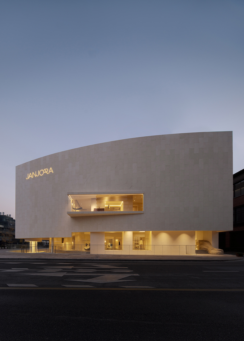 The entire building deeply embeds the core philosophical essence of JANJORA's brand concept "Complexity and Simplicity". Taking "sail" as the design prologue and "stone" to echo the marine imagery, it awakens contemporary women's profound resonance with minimalist architectural aesthetics. The design delves deeply into the brand genes and the cultural heritage of Ningbo, adopting a material language that returns to nature, thus enabling the building to form a deep integration and spiritual consensus with the natural texture of Ningbo, a coastal city.