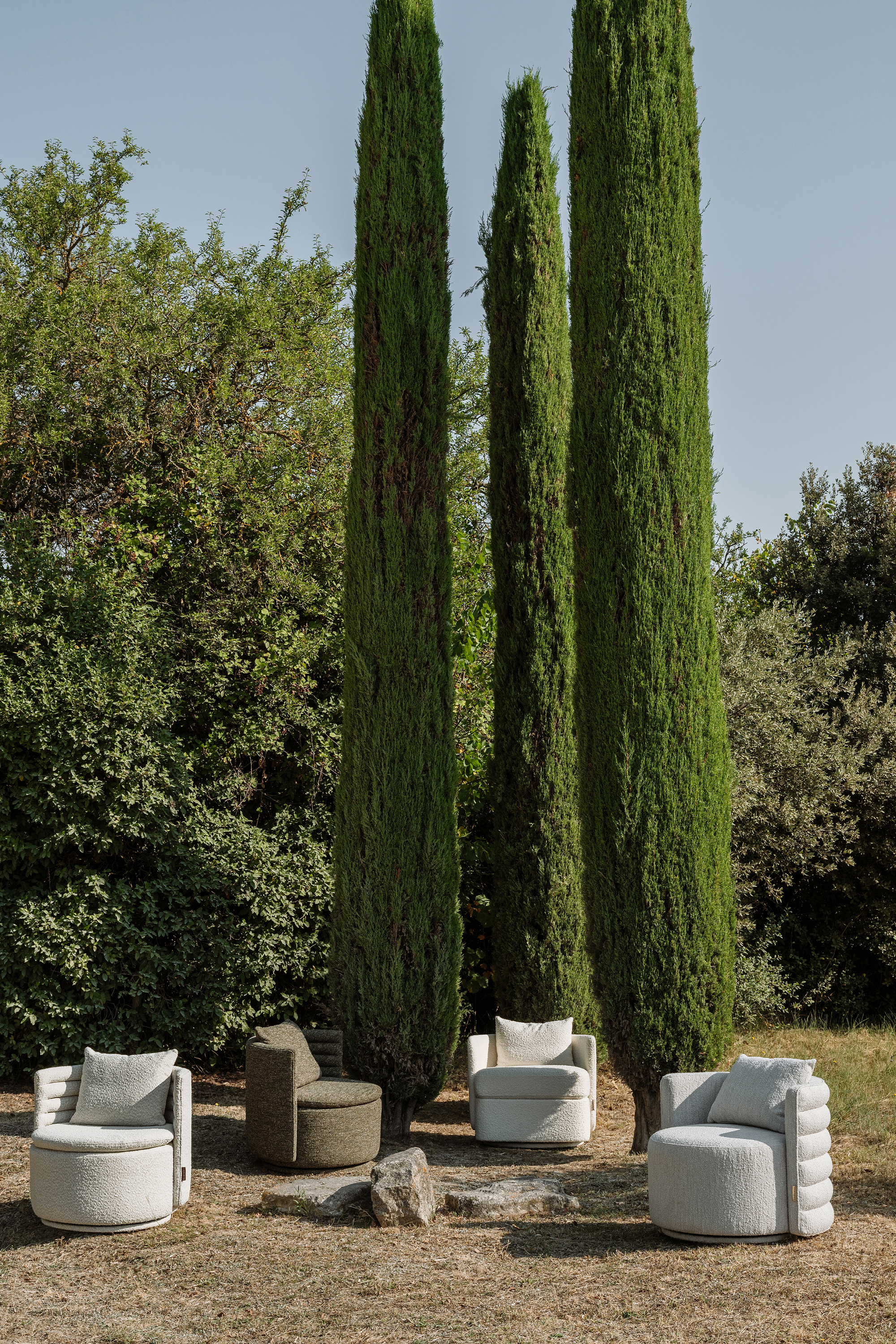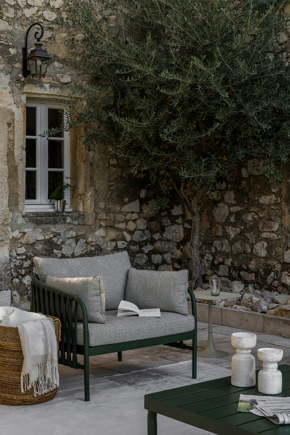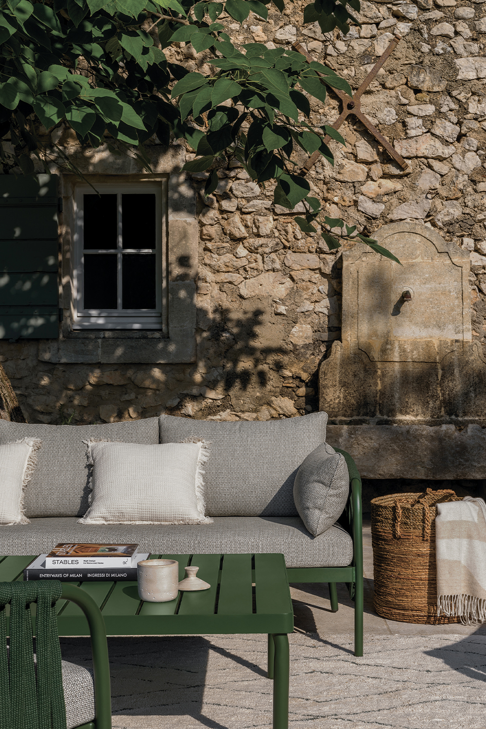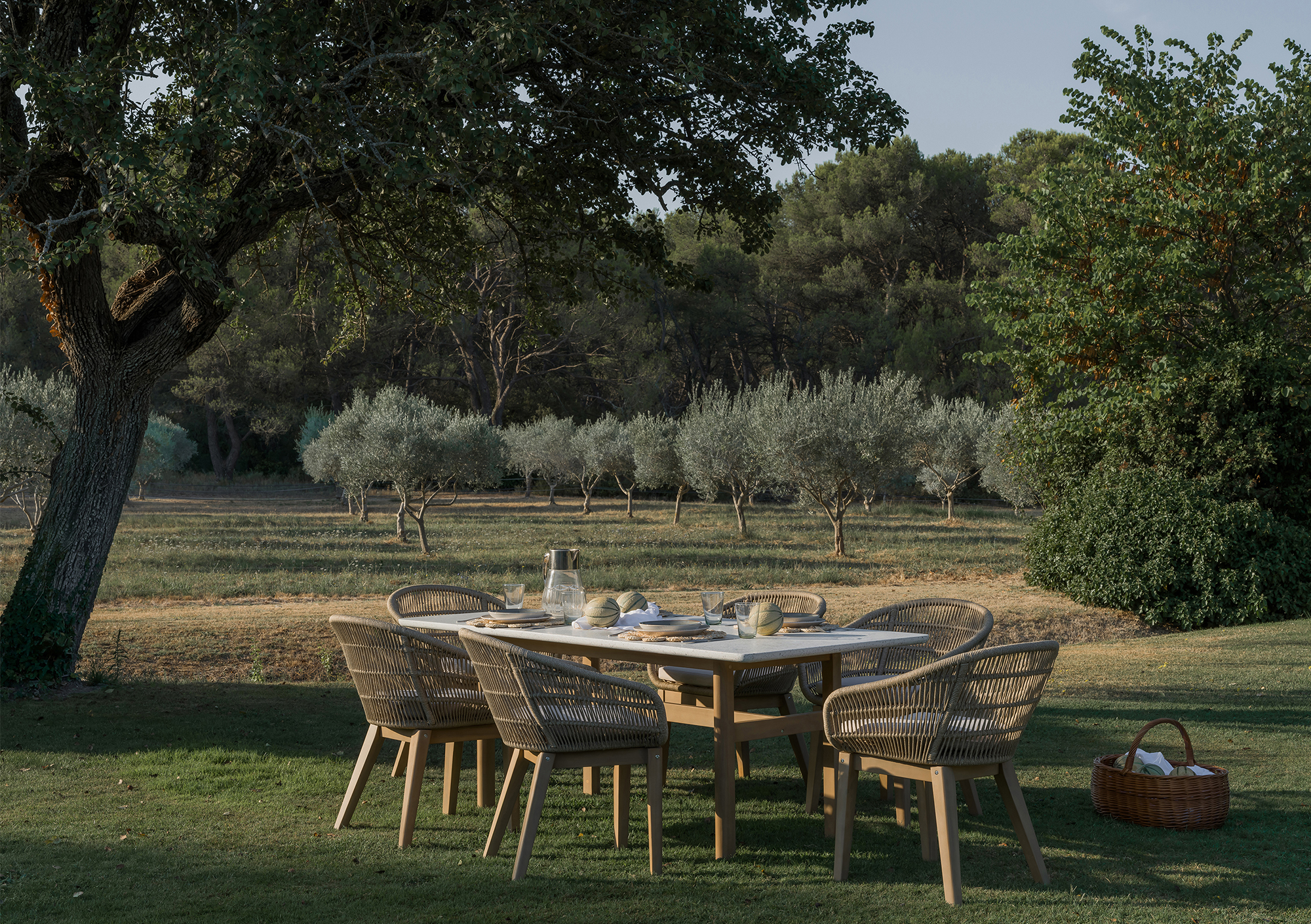 The Taormina outdoor furniture collection echoes the olive trees and metal shutters of the historic building. Bathed in the Provençal sunlight and amidst lush flowers, the series looks utterly poetic, as if created for this very setting, becoming an integral part of it.