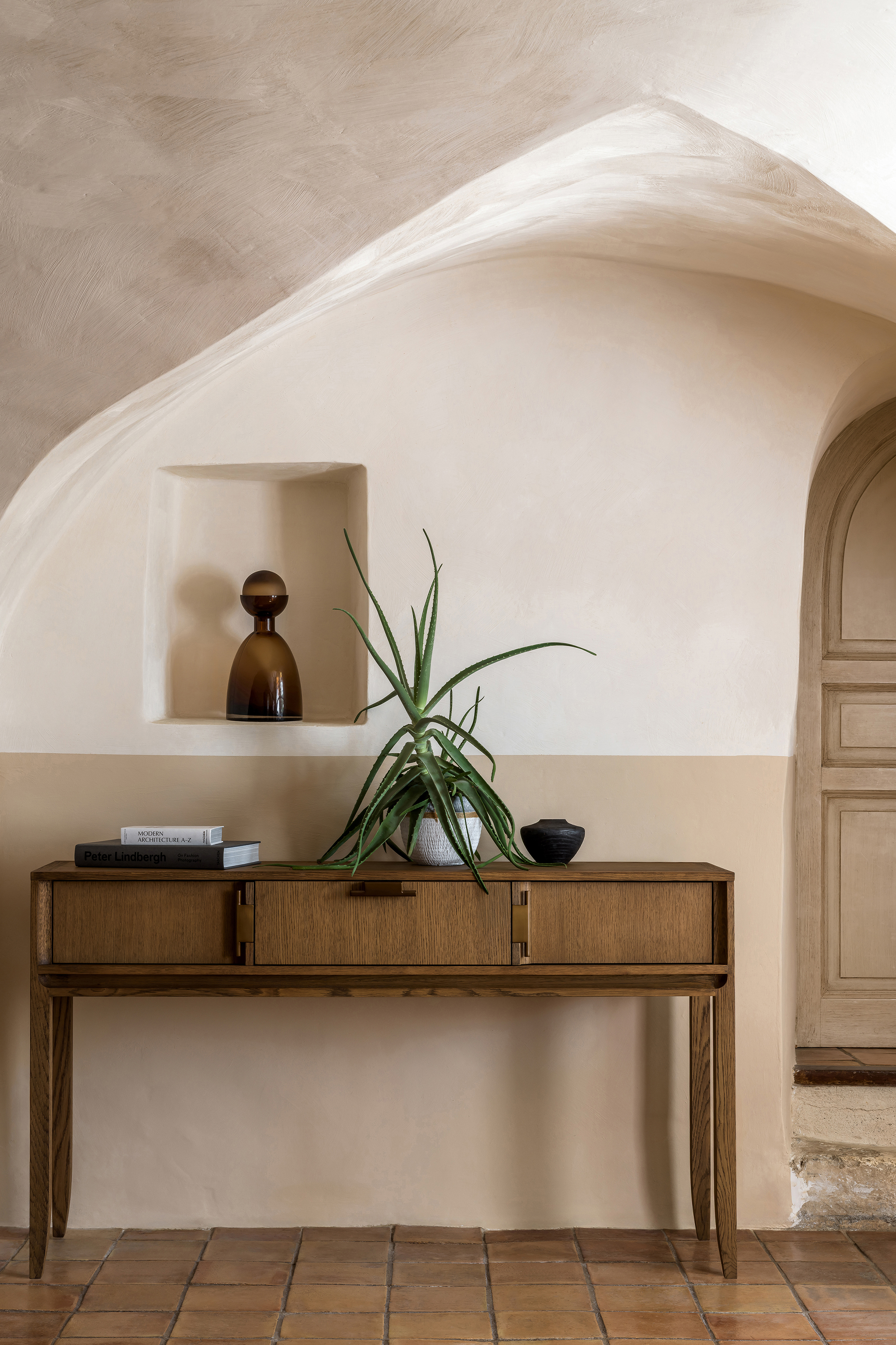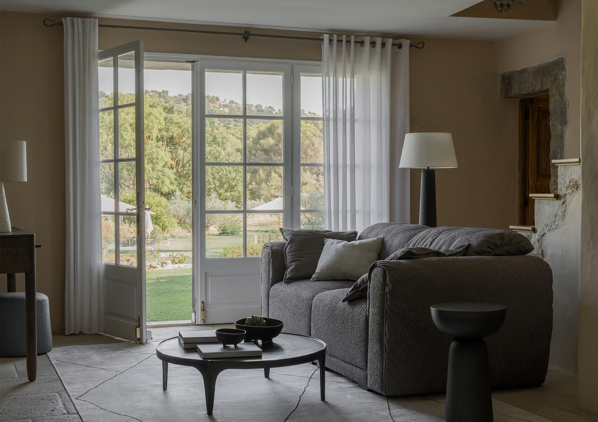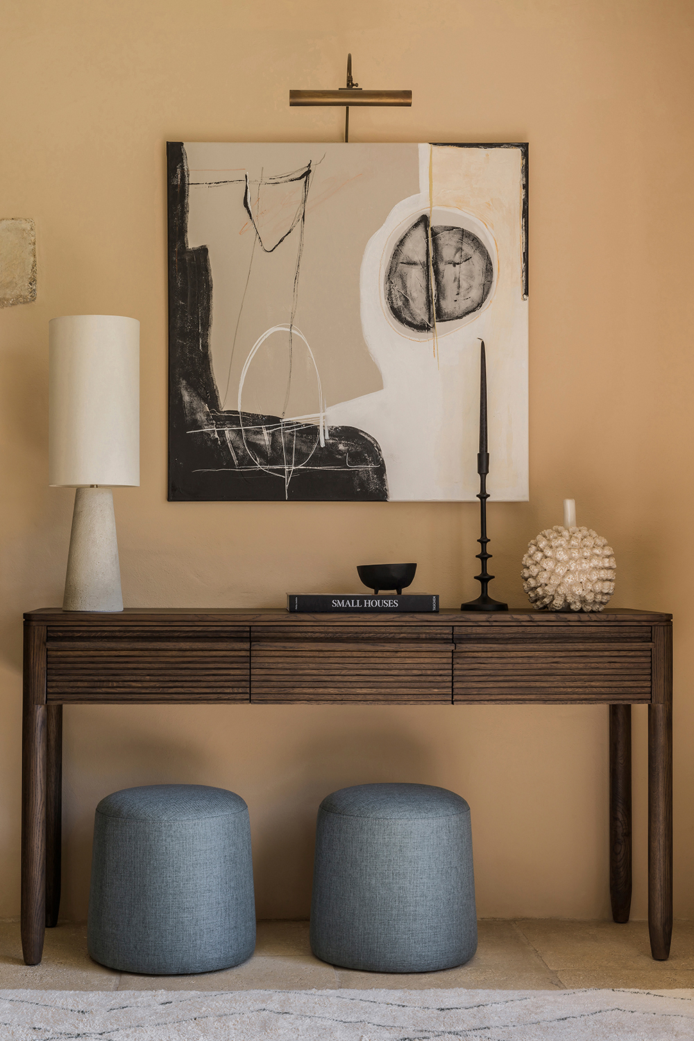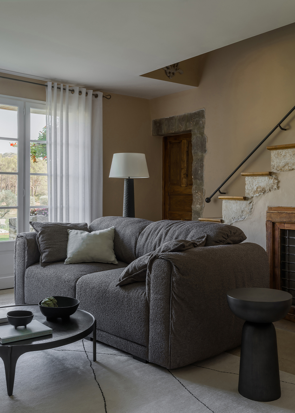 The atmosphere is refined yet unpretentious, Provençal yet not folkloric. The hall is greeted with a voluminous sofa that, like a soft, tangible cloud, envelops you, offering instant relaxation and setting a contemplative mood. An abstract wall panel, elegant candlesticks, and the textured Lines console designed by James Patterson blend organically into the villa's 400-year-old ambiance.