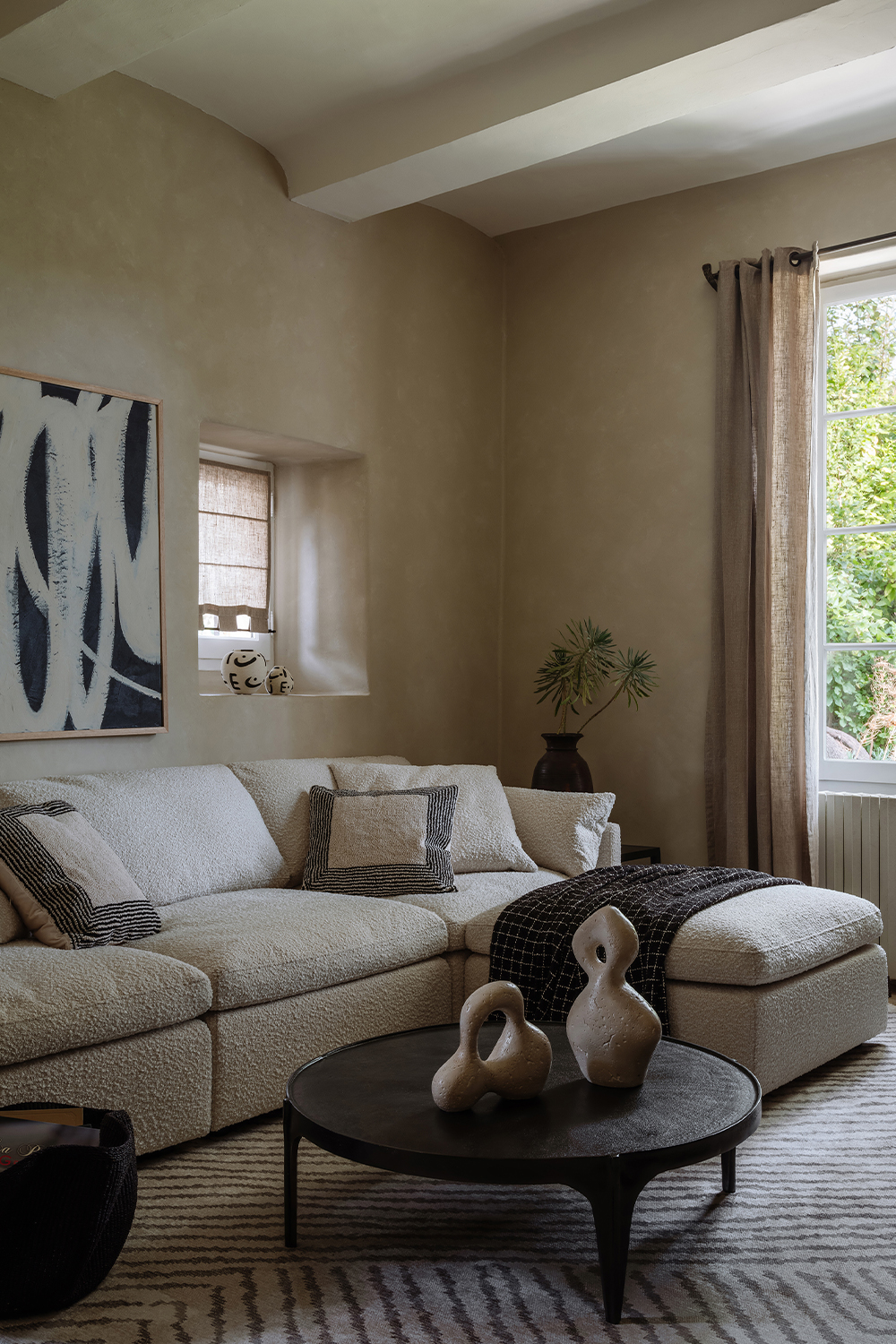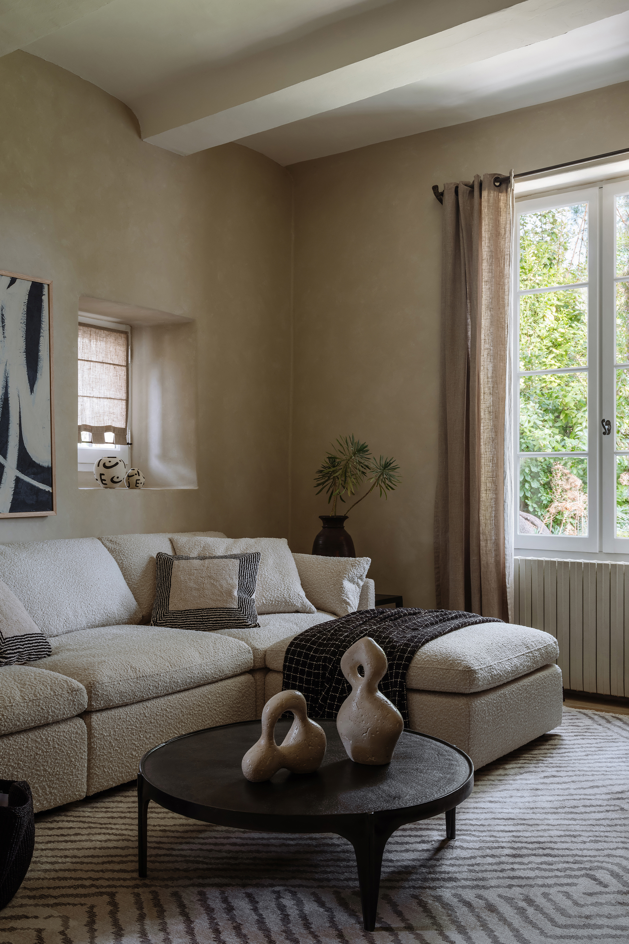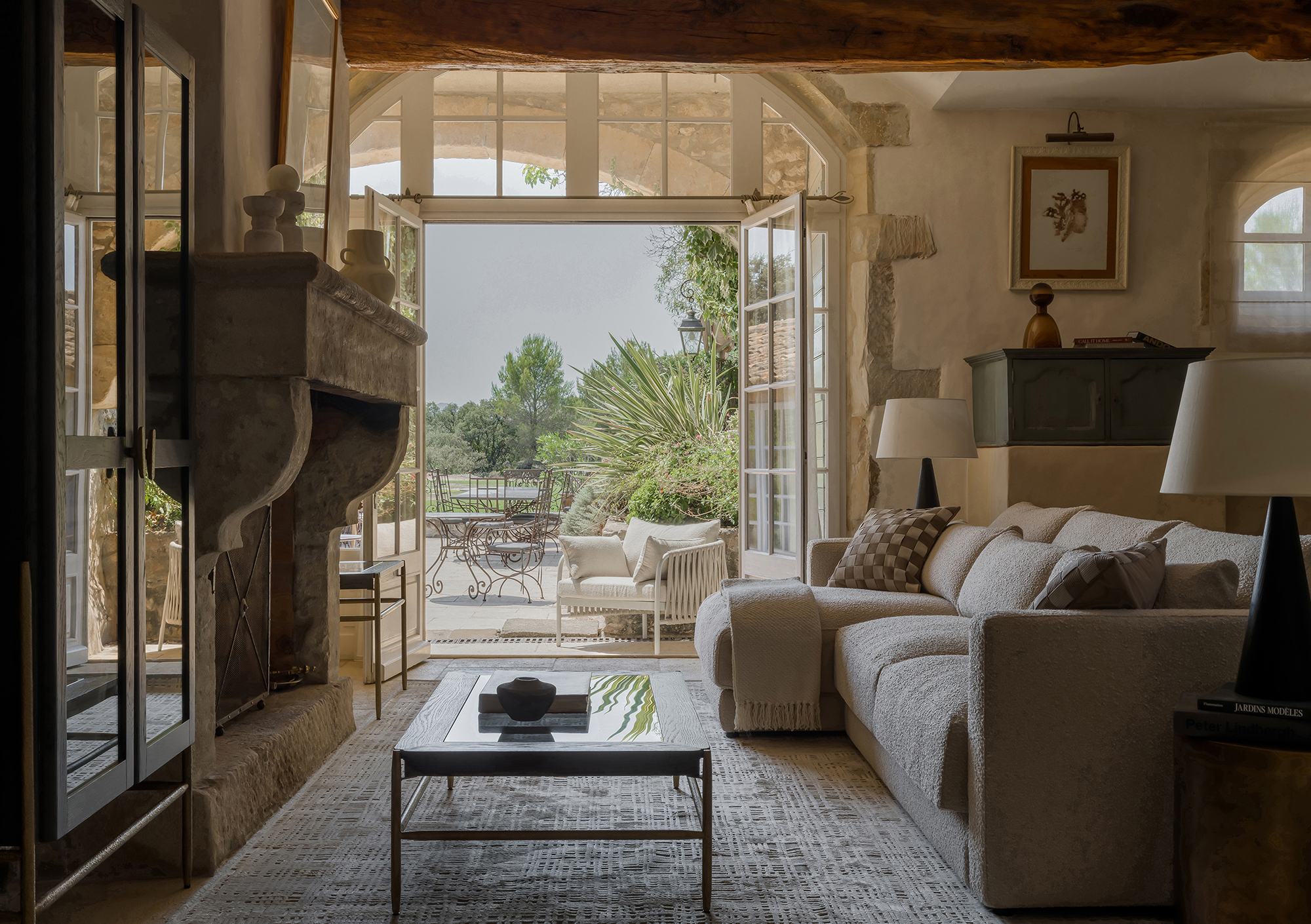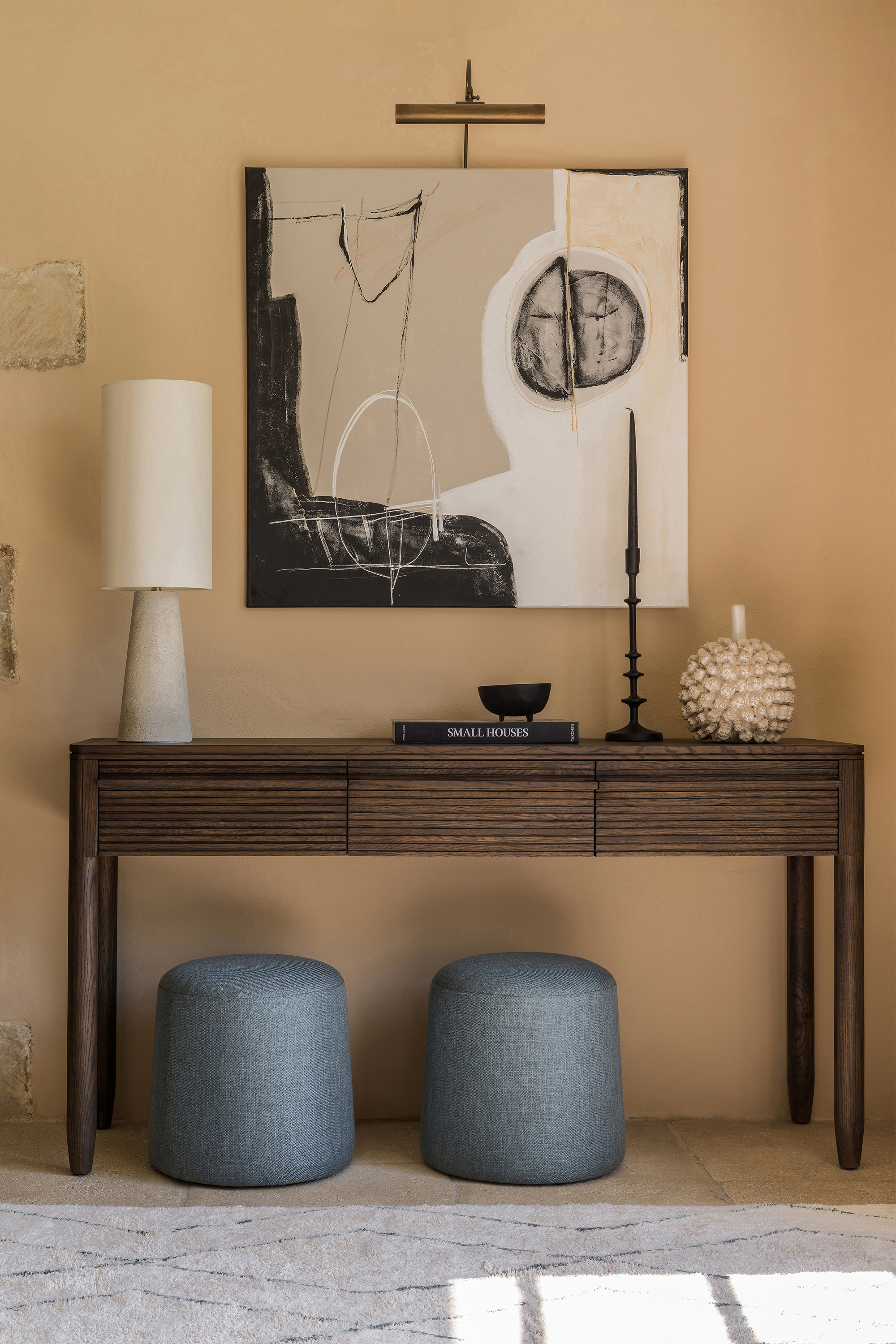The atmosphere is refined yet unpretentious, Provençal yet not folkloric. The hall is greeted with a voluminous sofa that, like a soft, tangible cloud, envelops you, offering instant relaxation and setting a contemplative mood. An abstract wall panel, elegant candlesticks, and the textured Lines console designed by James Patterson blend organically into the villa's 400-year-old ambiance.