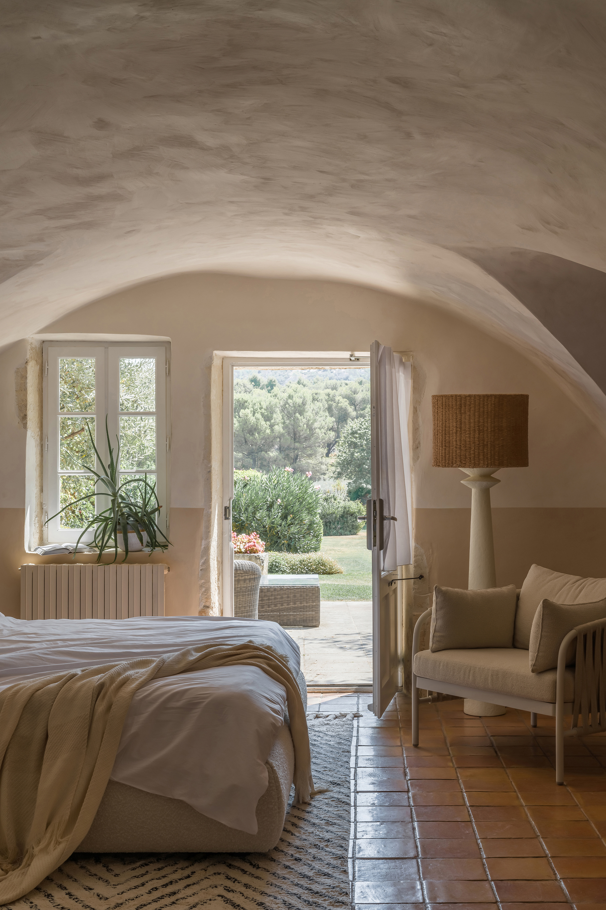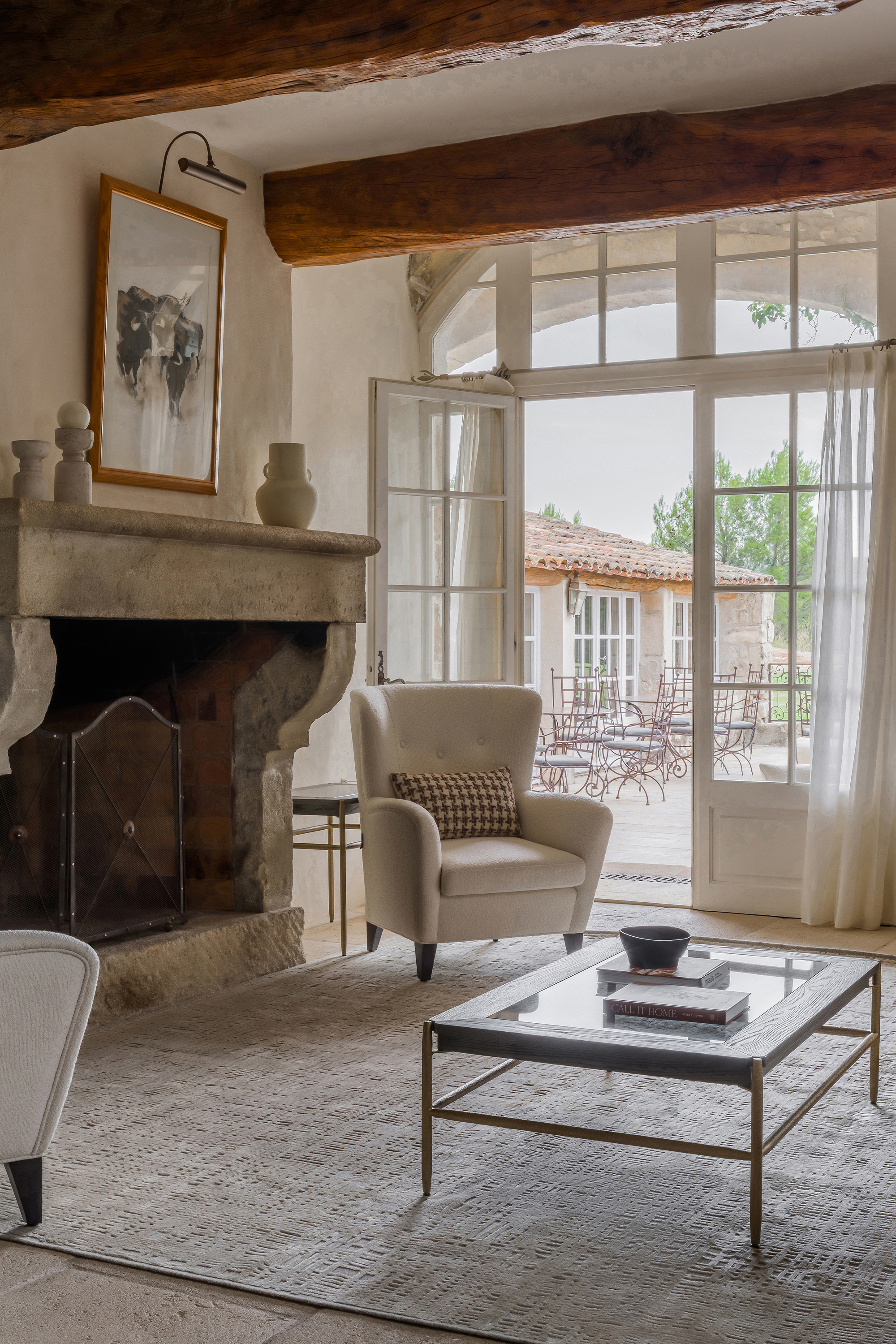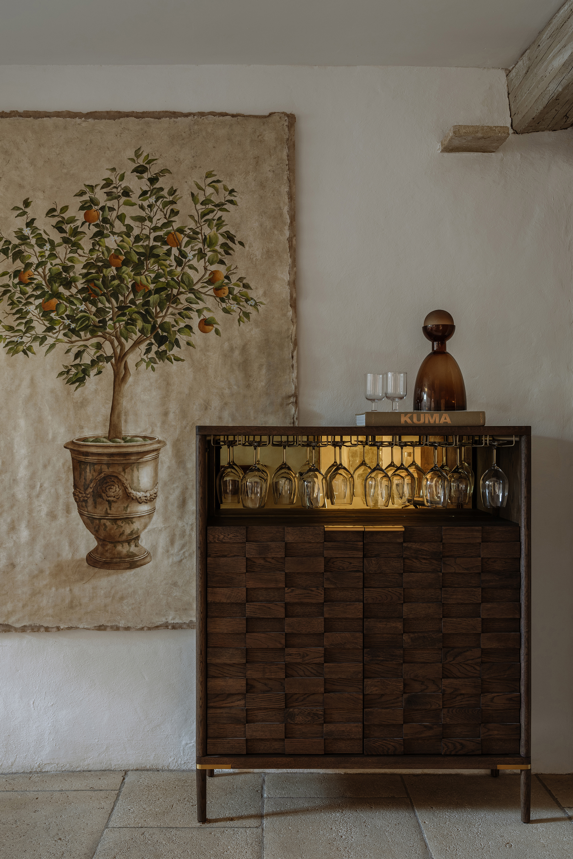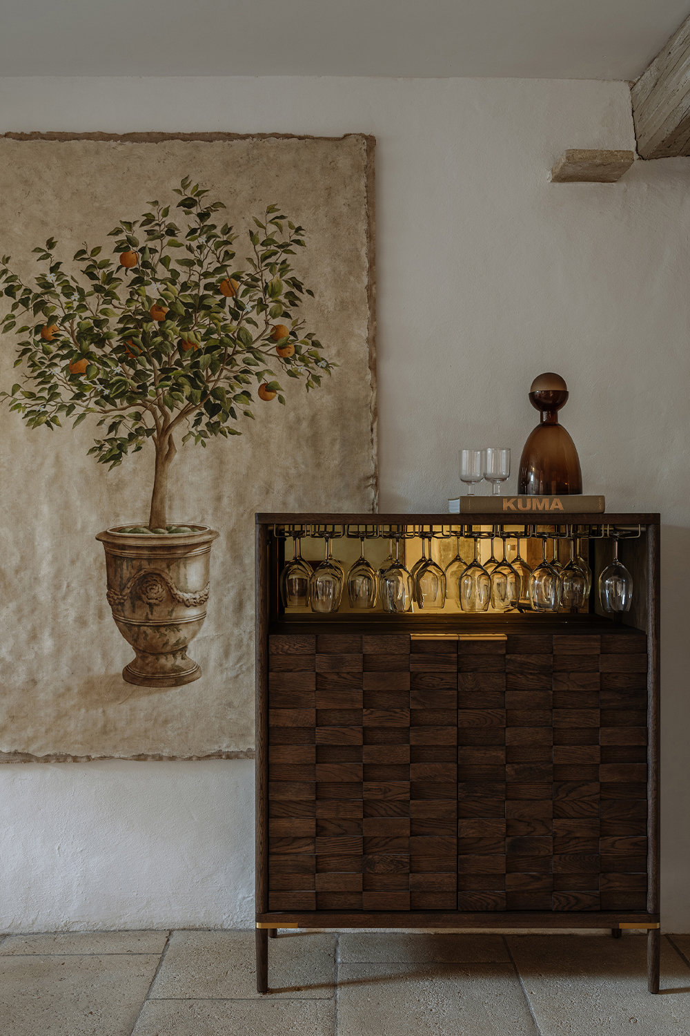 The atmosphere is refined yet unpretentious, Provençal yet not folkloric. The hall is greeted with a voluminous sofa that, like a soft, tangible cloud, envelops you, offering instant relaxation and setting a contemplative mood. An abstract wall panel, elegant candlesticks, and the textured Lines console designed by James Patterson blend organically into the villa's 400-year-old ambiance.