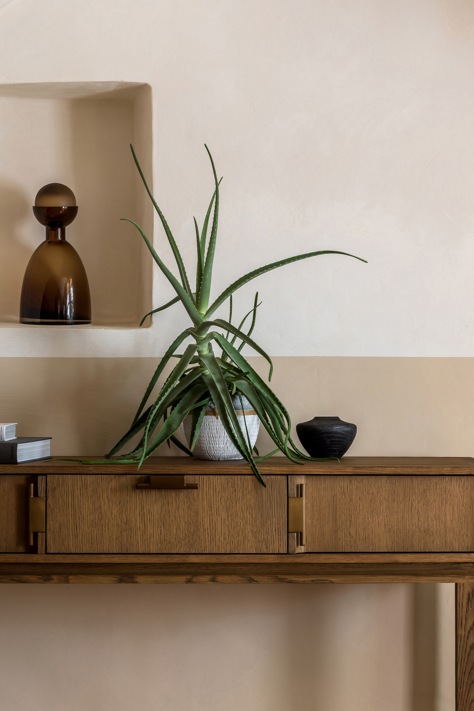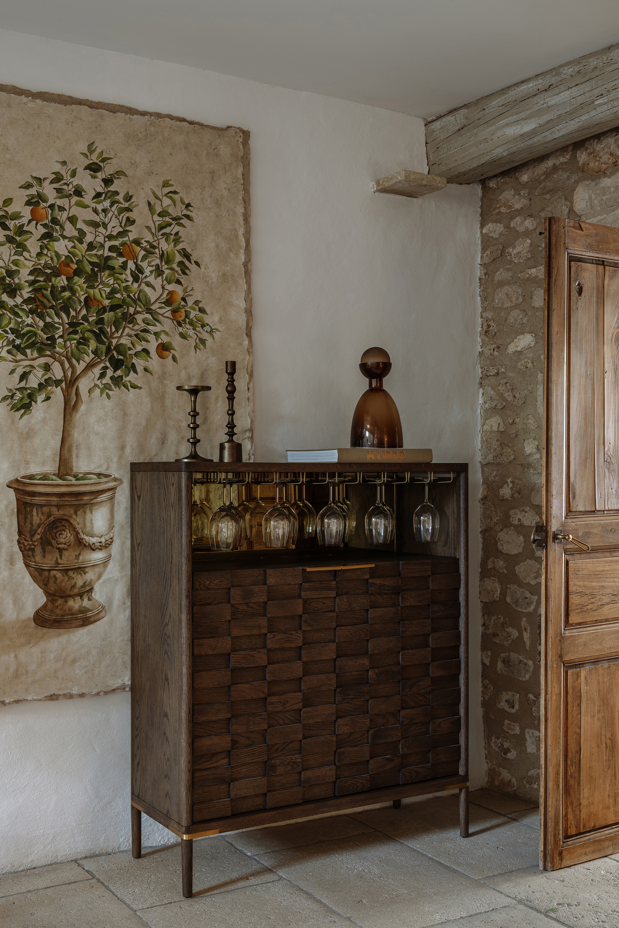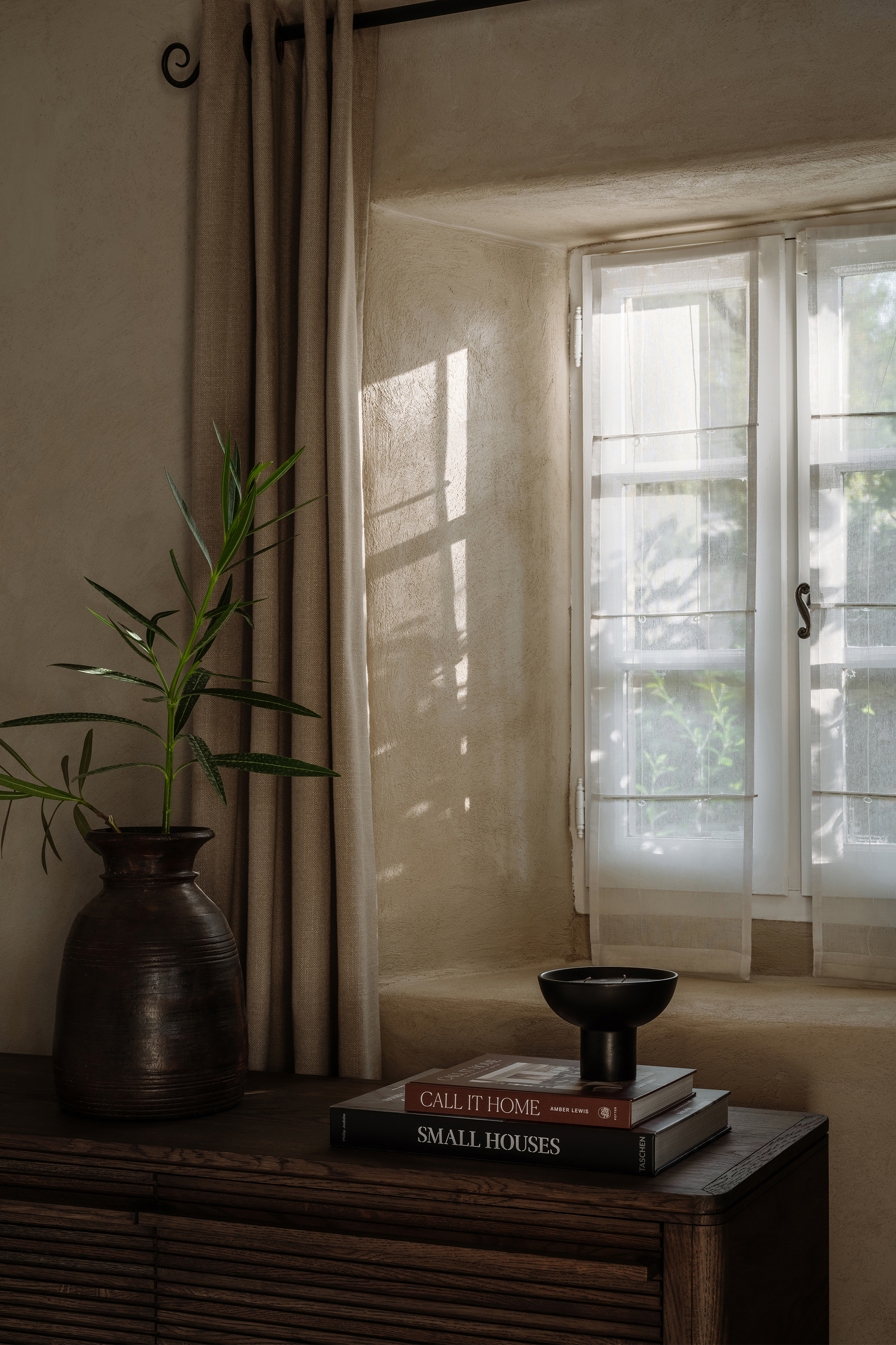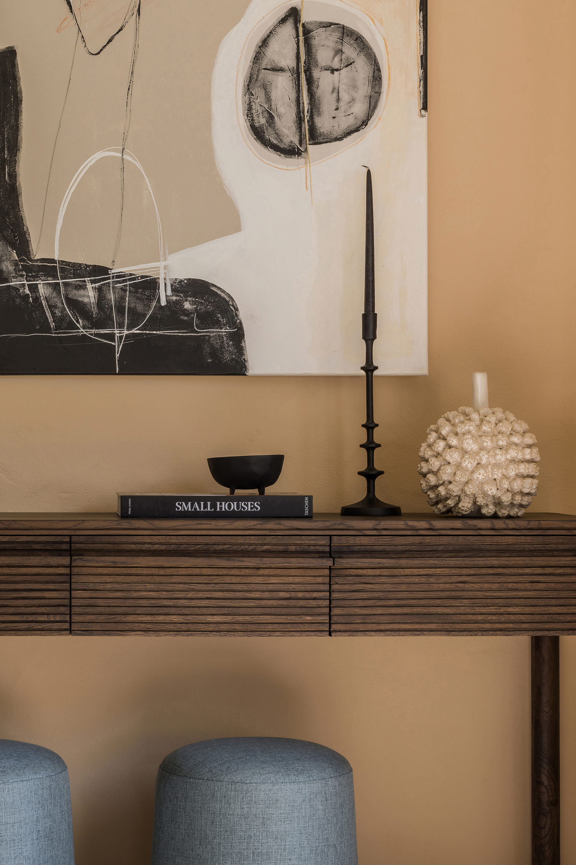 The atmosphere is refined yet unpretentious, Provençal yet not folkloric. The hall is greeted with a voluminous sofa that, like a soft, tangible cloud, envelops you, offering instant relaxation and setting a contemplative mood. An abstract wall panel, elegant candlesticks, and the textured Lines console designed by James Patterson blend organically into the villa's 400-year-old ambiance.