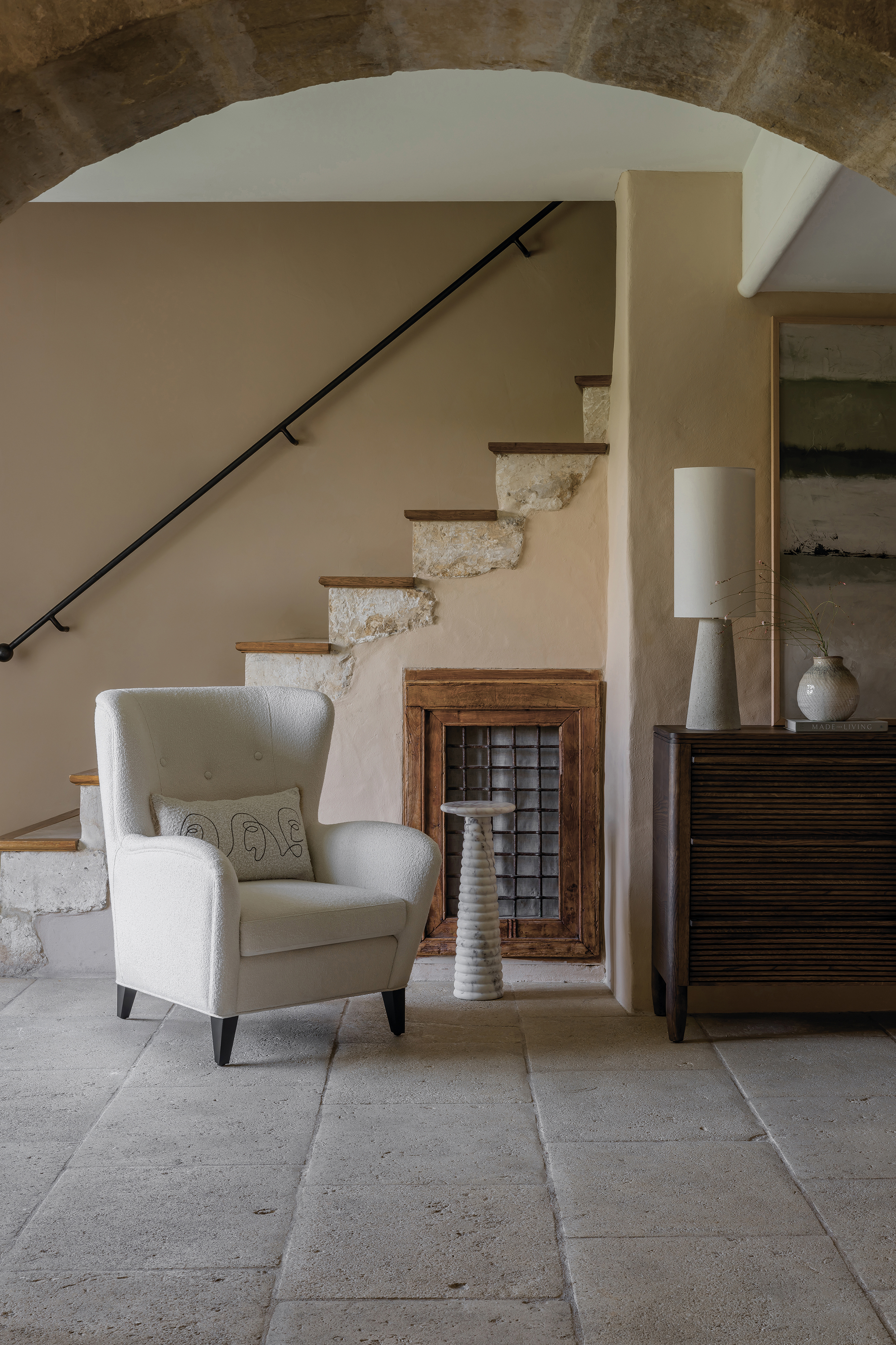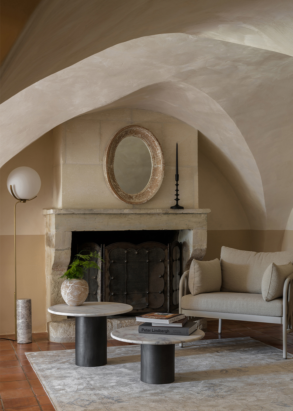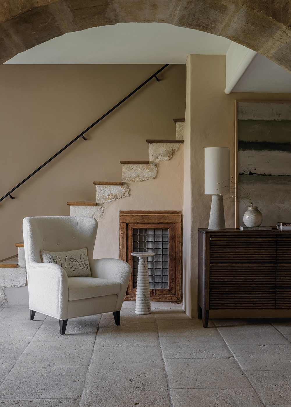 It was here that the curatorial project was born, in which the international furniture brand Dantone Home acted as a mediator in a dialogue between the 17th-century genius loci and contemporary design, between rural charm and timeless elegance. Step inside to discover historic interiors in a remarkable state of preservation: vaulted ceilings, arches, stone steps, spiral staircases, surfaces bearing the patina of time, antique floor tiles, and centuries-old beams.