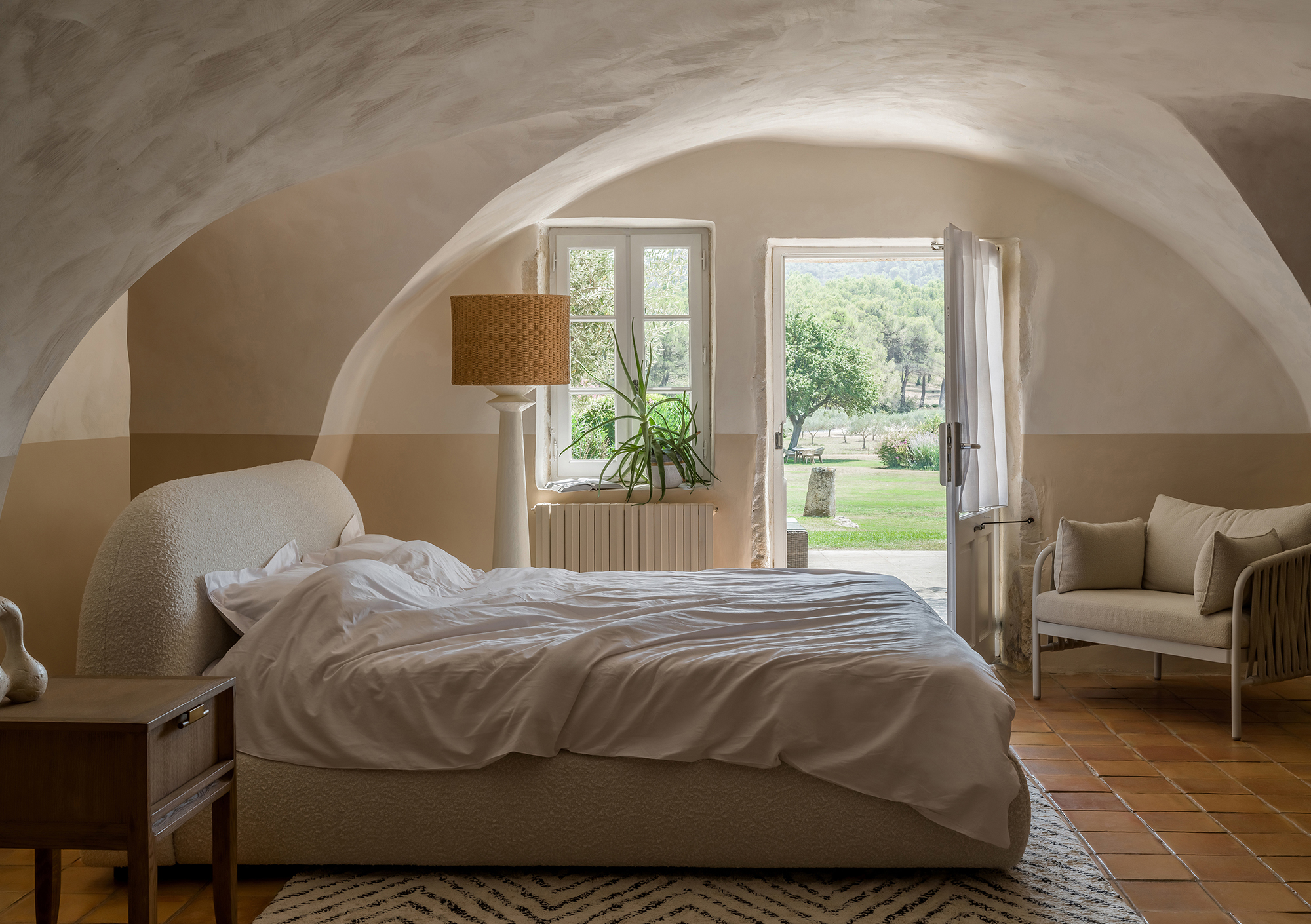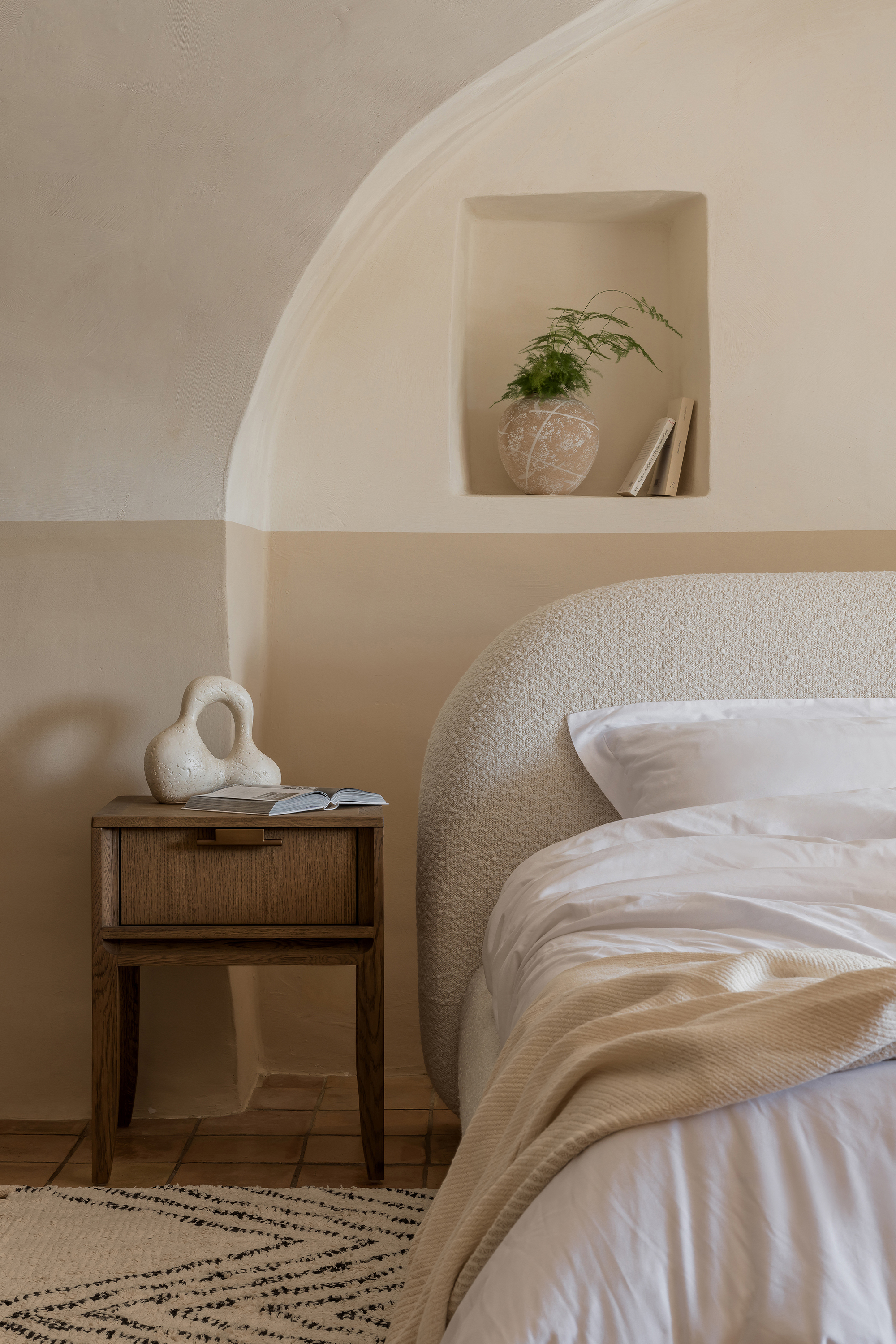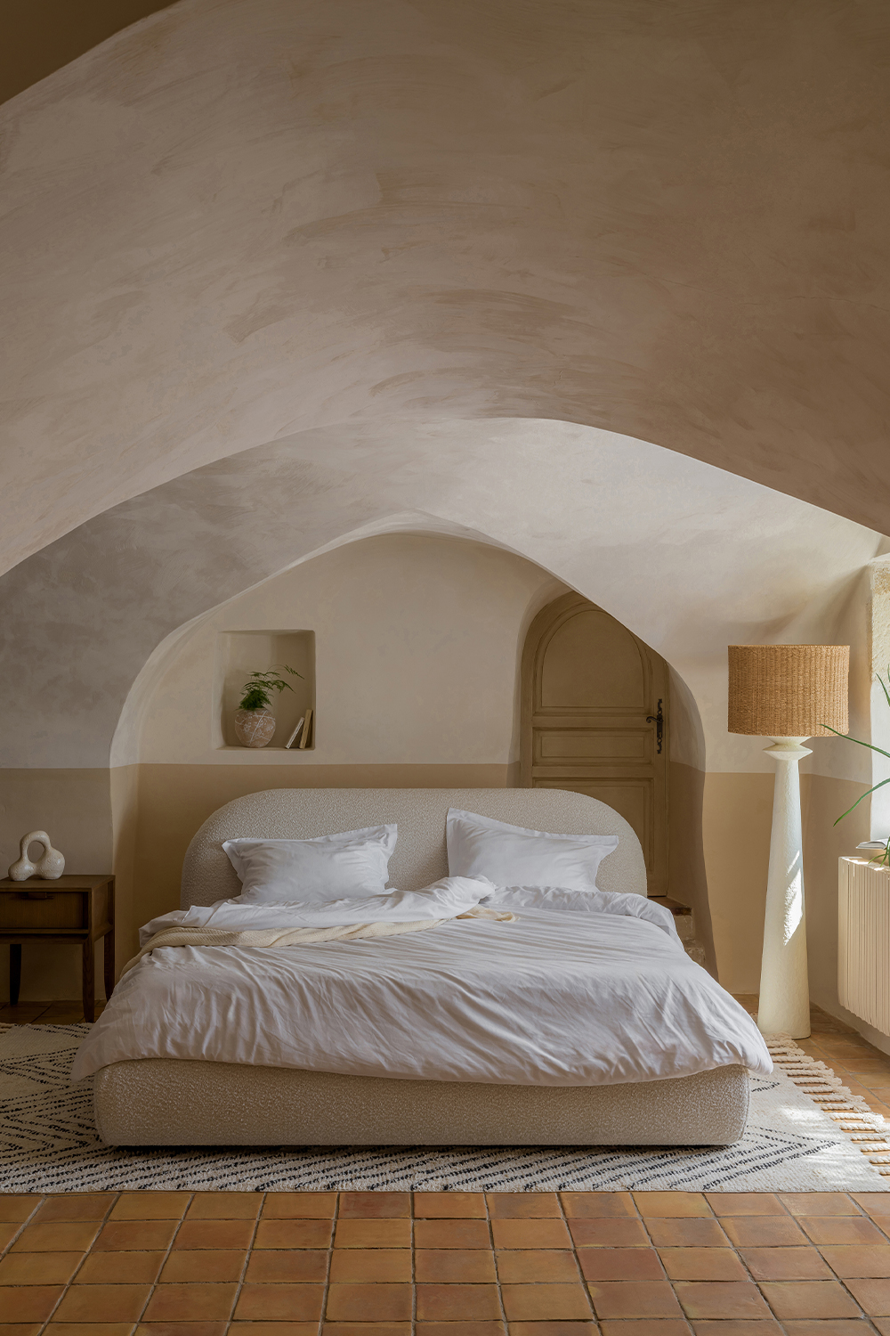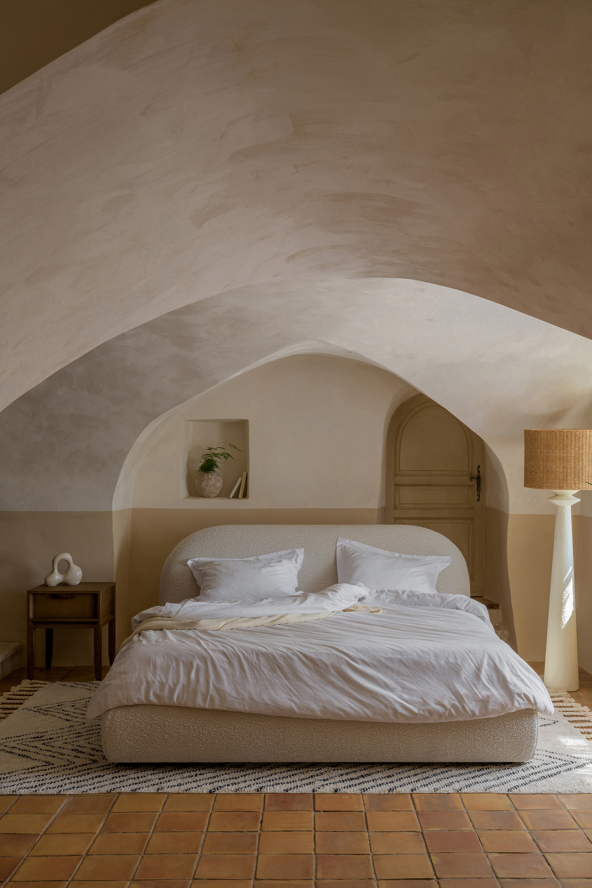 The first rays of sunlight touch the bed's rounded headboard, mirroring the shape of the alcove. The Sonoma floor lamp with its woven shade maintains the space's authenticity, while the sleek City bedside table by James Patterson introduces a sense of order.