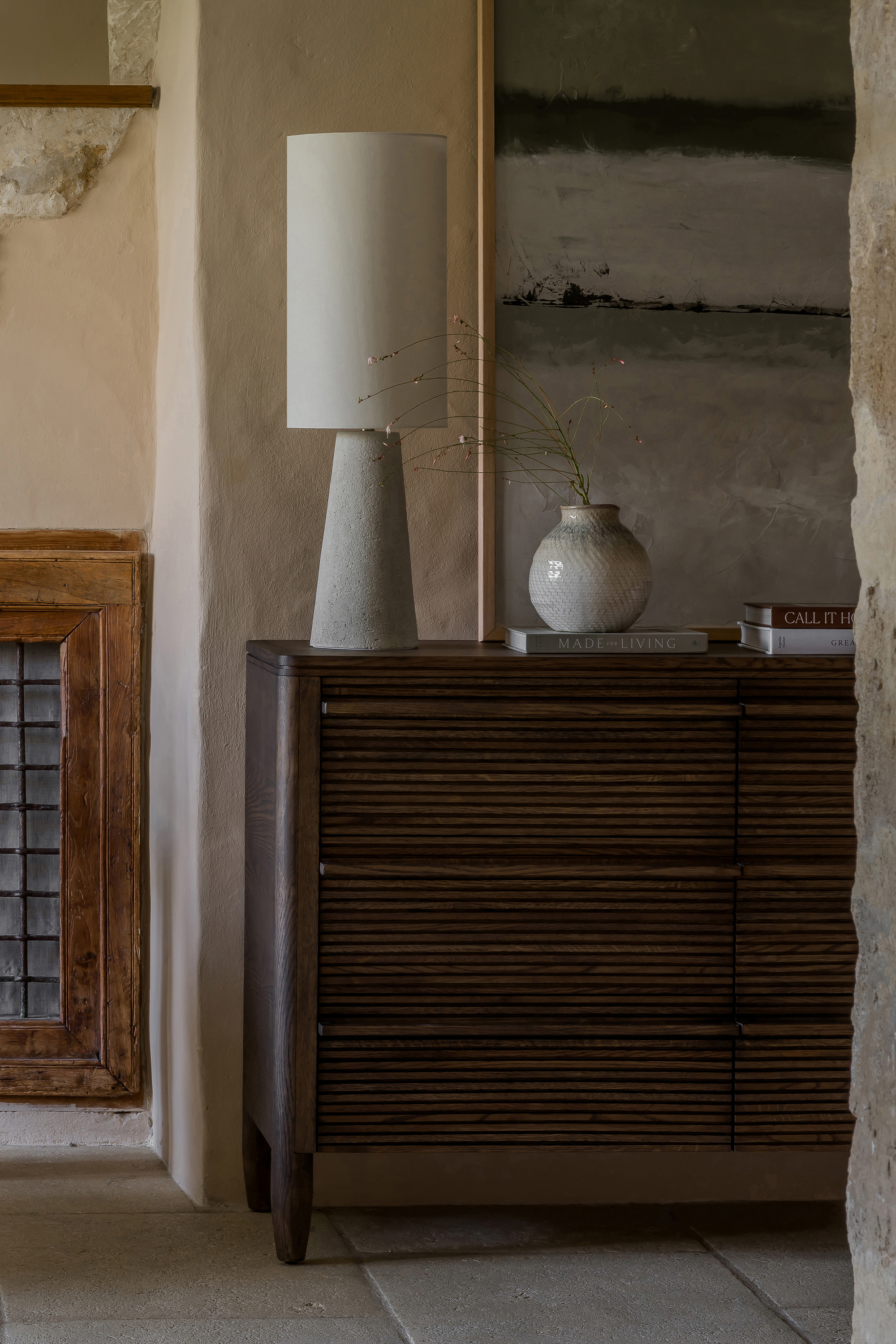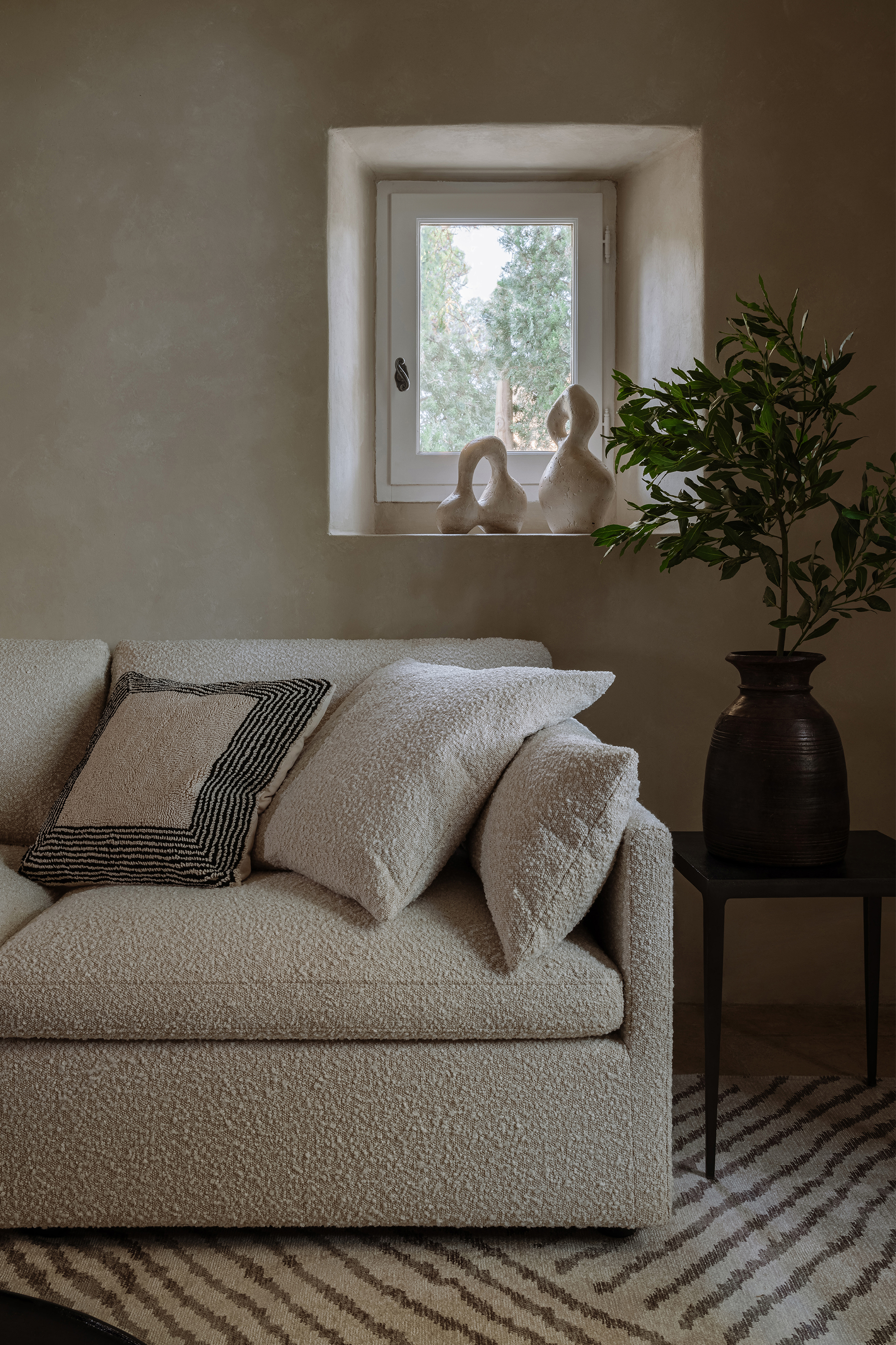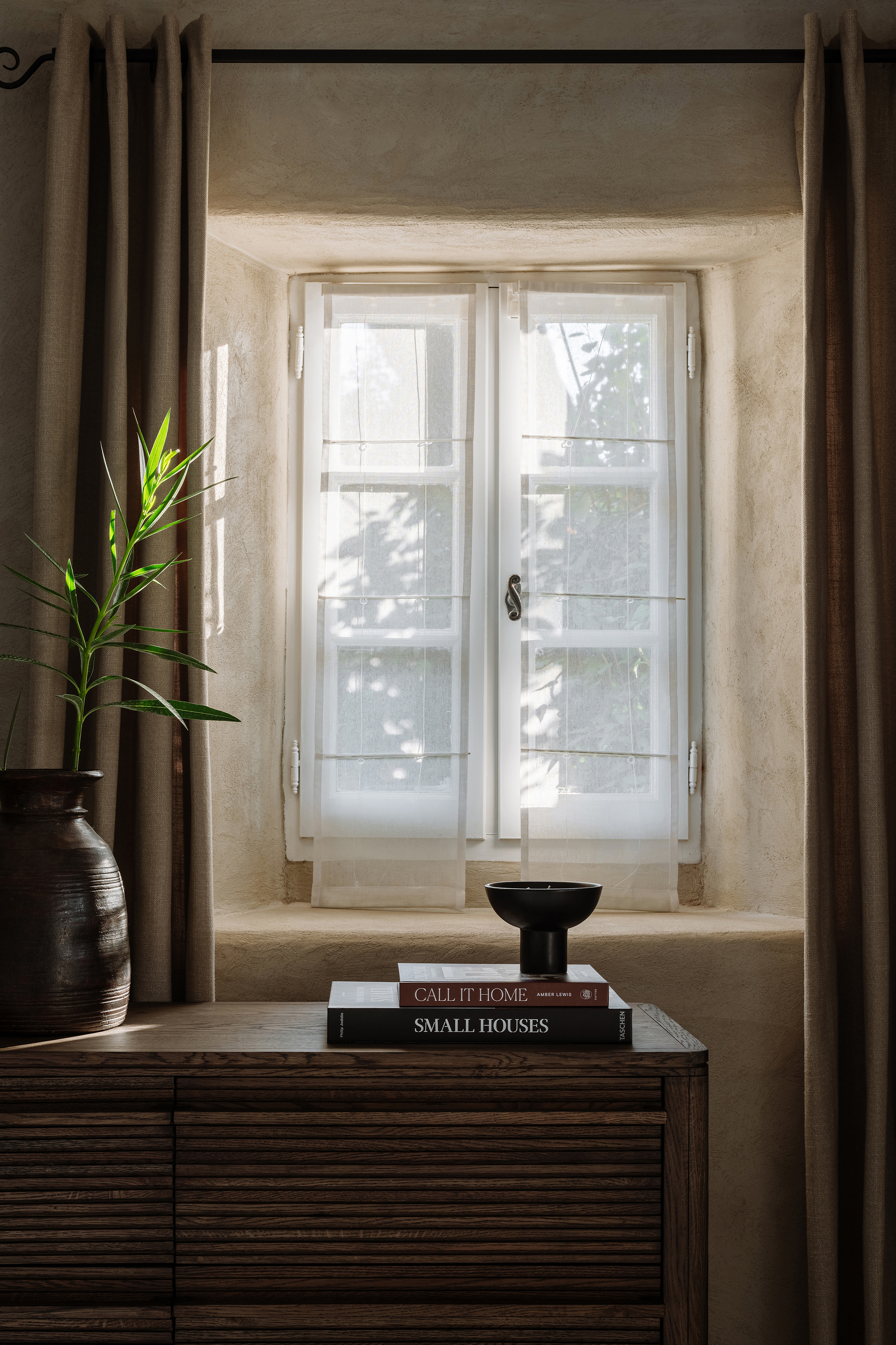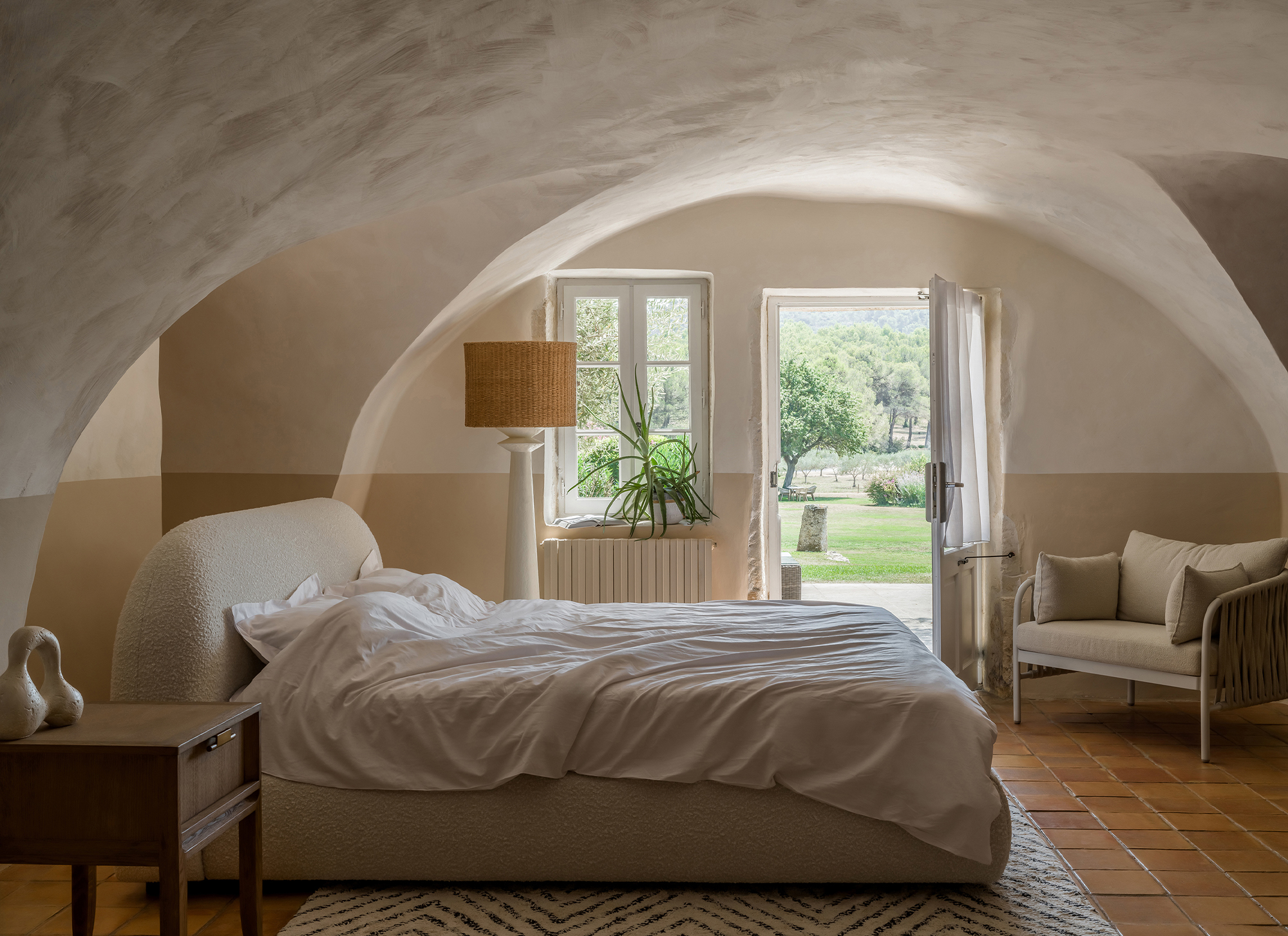 The first rays of sunlight touch the bed's rounded headboard, mirroring the shape of the alcove. The Sonoma floor lamp with its woven shade maintains the space's authenticity, while the sleek City bedside table by James Patterson introduces a sense of order.