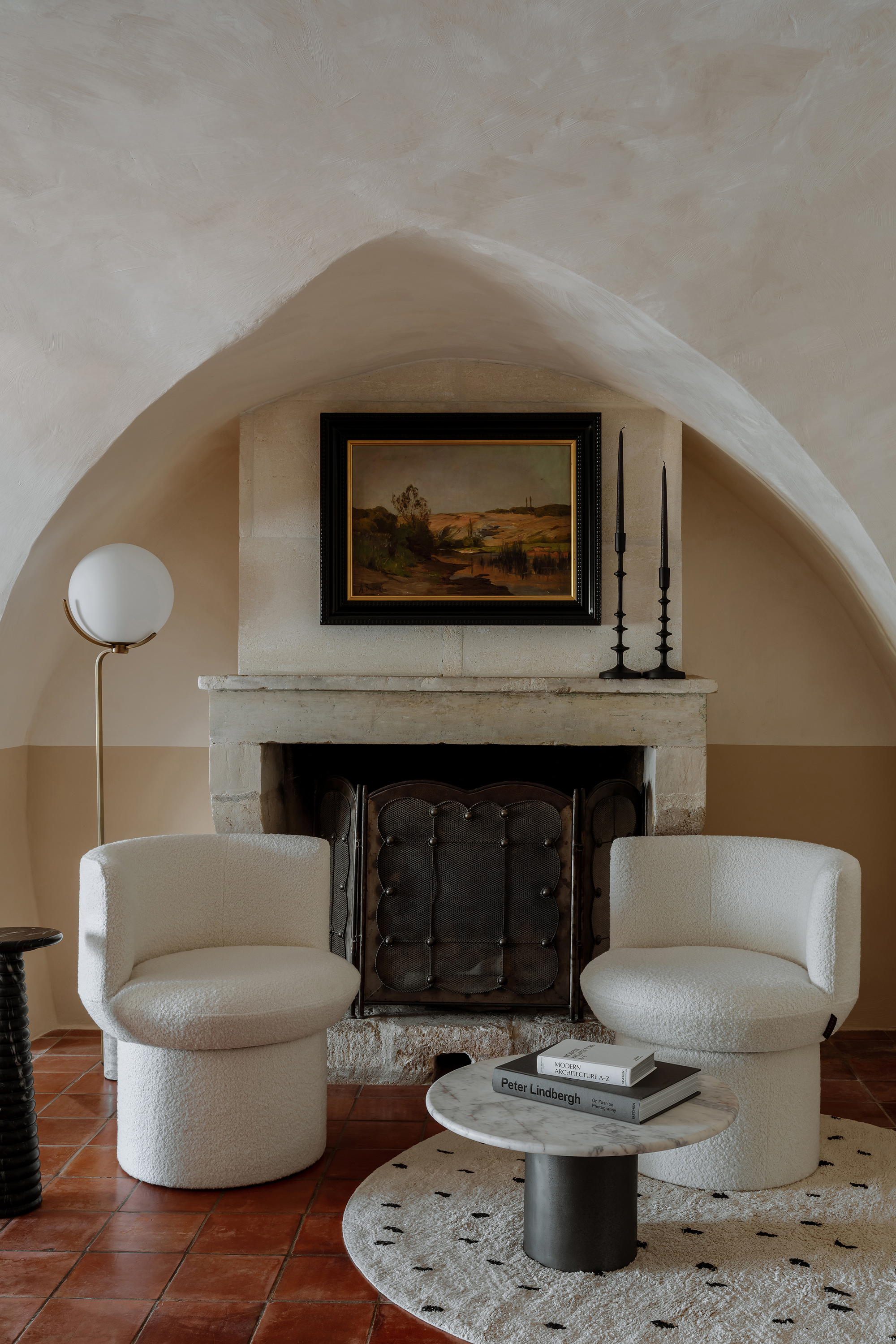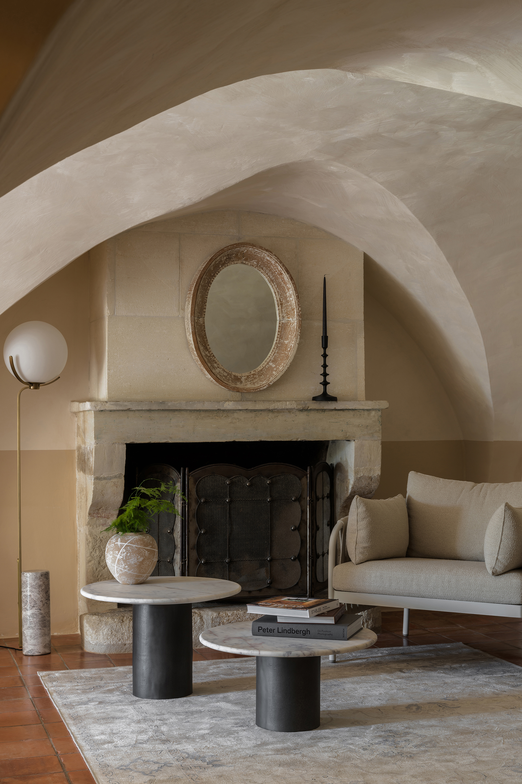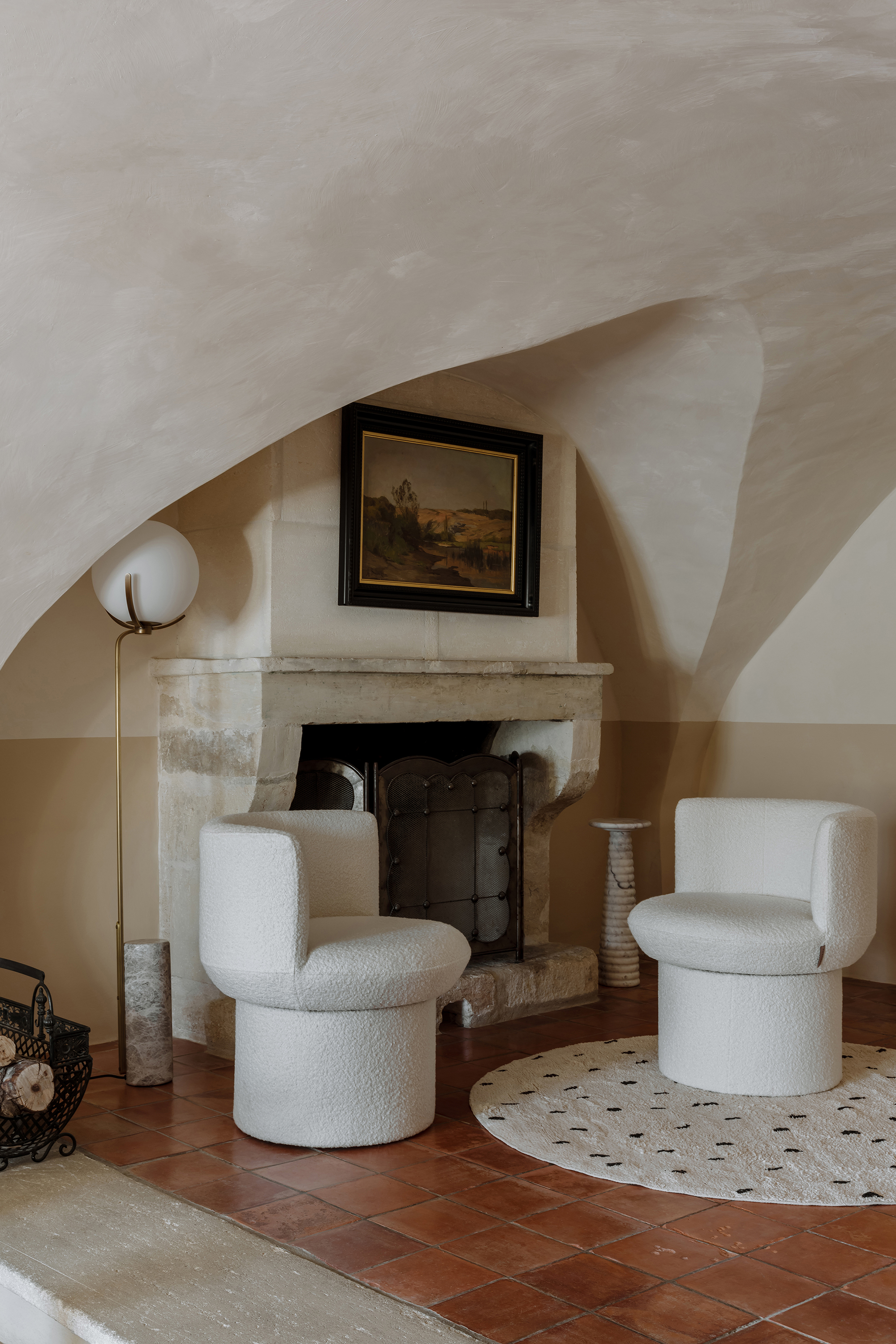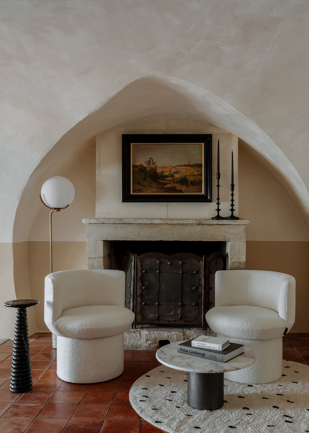 Reading the works of French philosophers becomes even more insightful in the lounge area by the fireplace under the vaulted ceiling. Here, the space itself tells a story, gathering diverse perspectives on form, material, and function from designers across the globe. The voices of the contemporary era — French designer Laura Grézard, creator of the Taormina armchair, and Swiss designer David Girelli, author of the Scoop floor lamp. This is an exploration of how works by international designers resonate with the genius loci without conceding to it in historical value.
