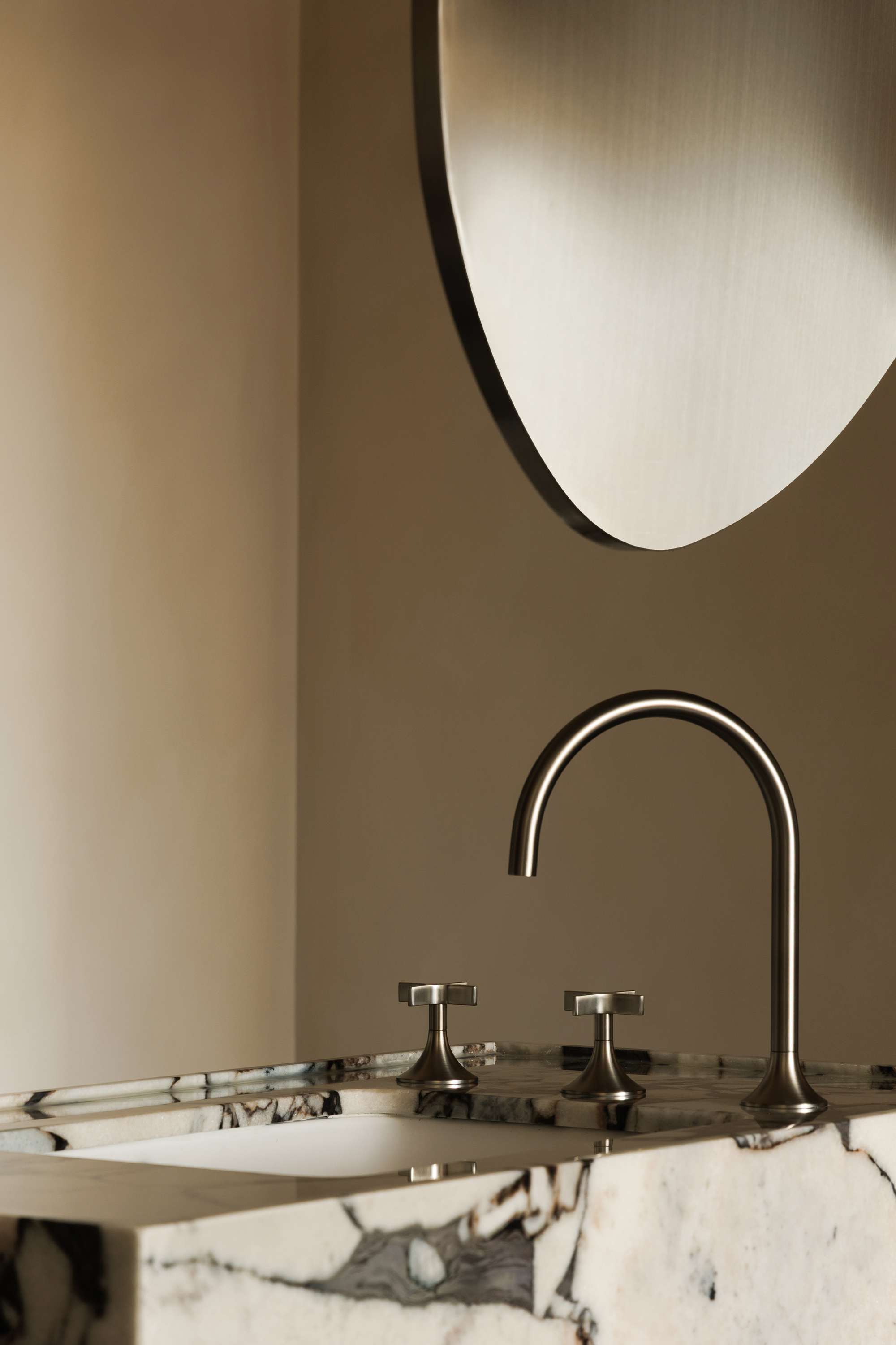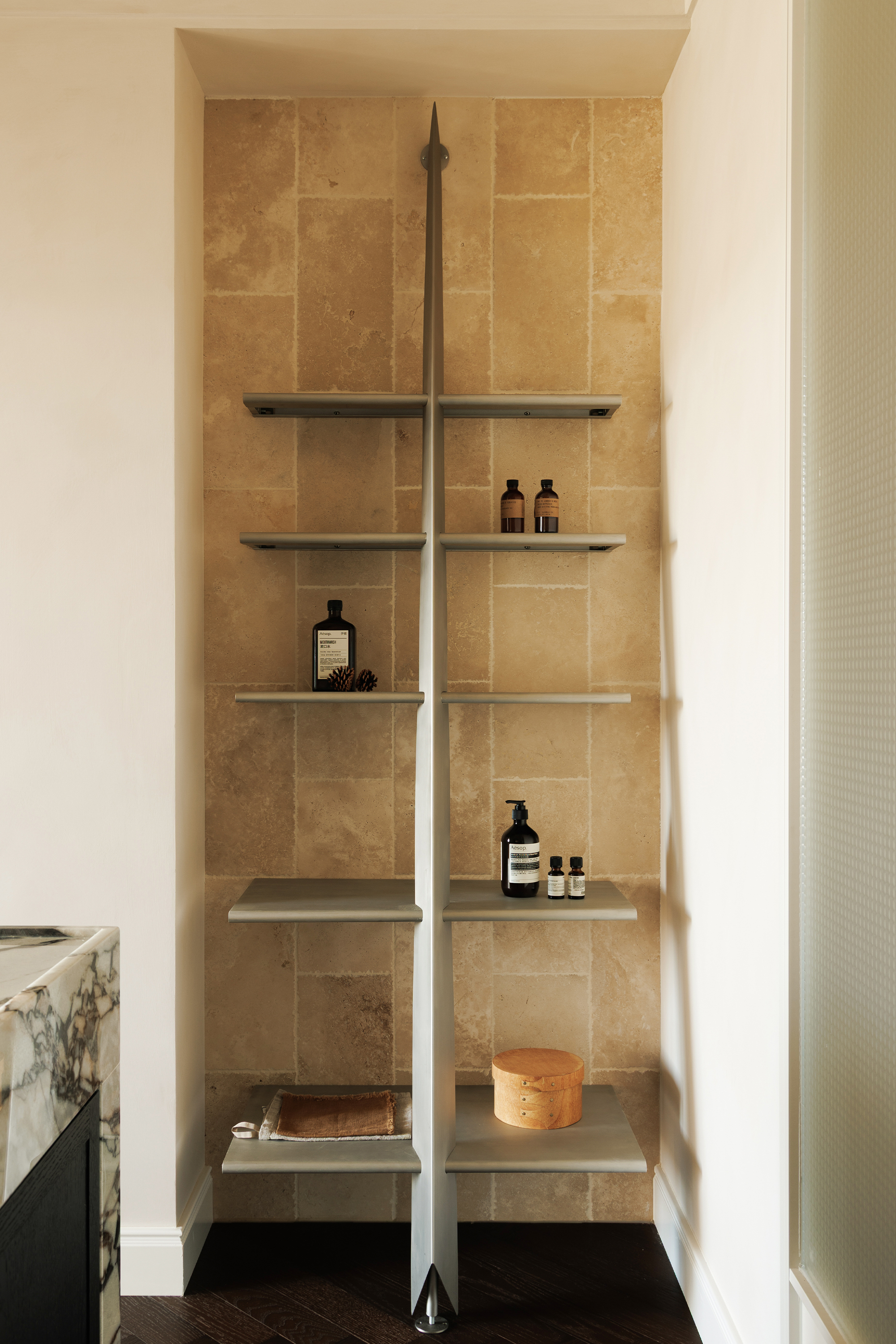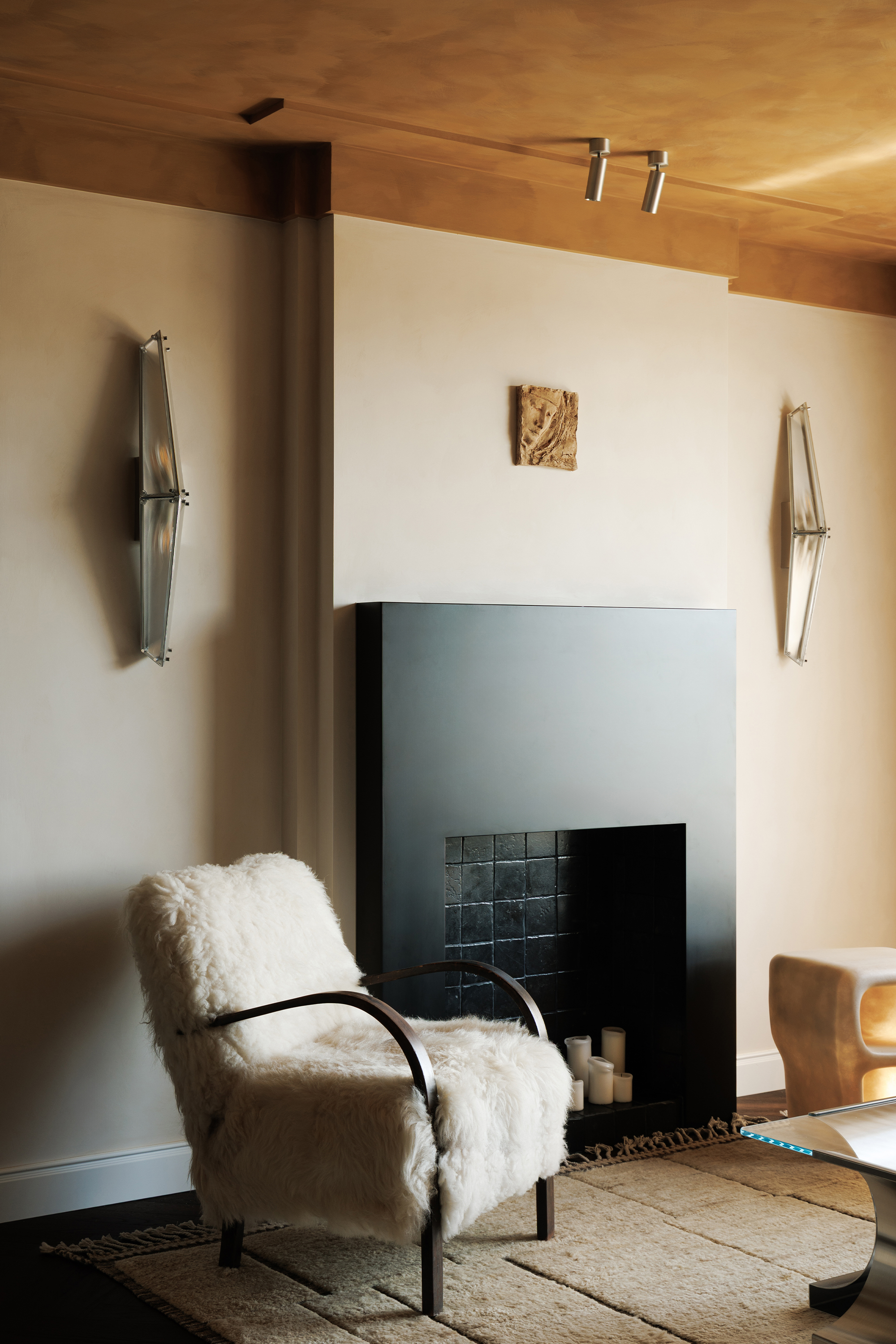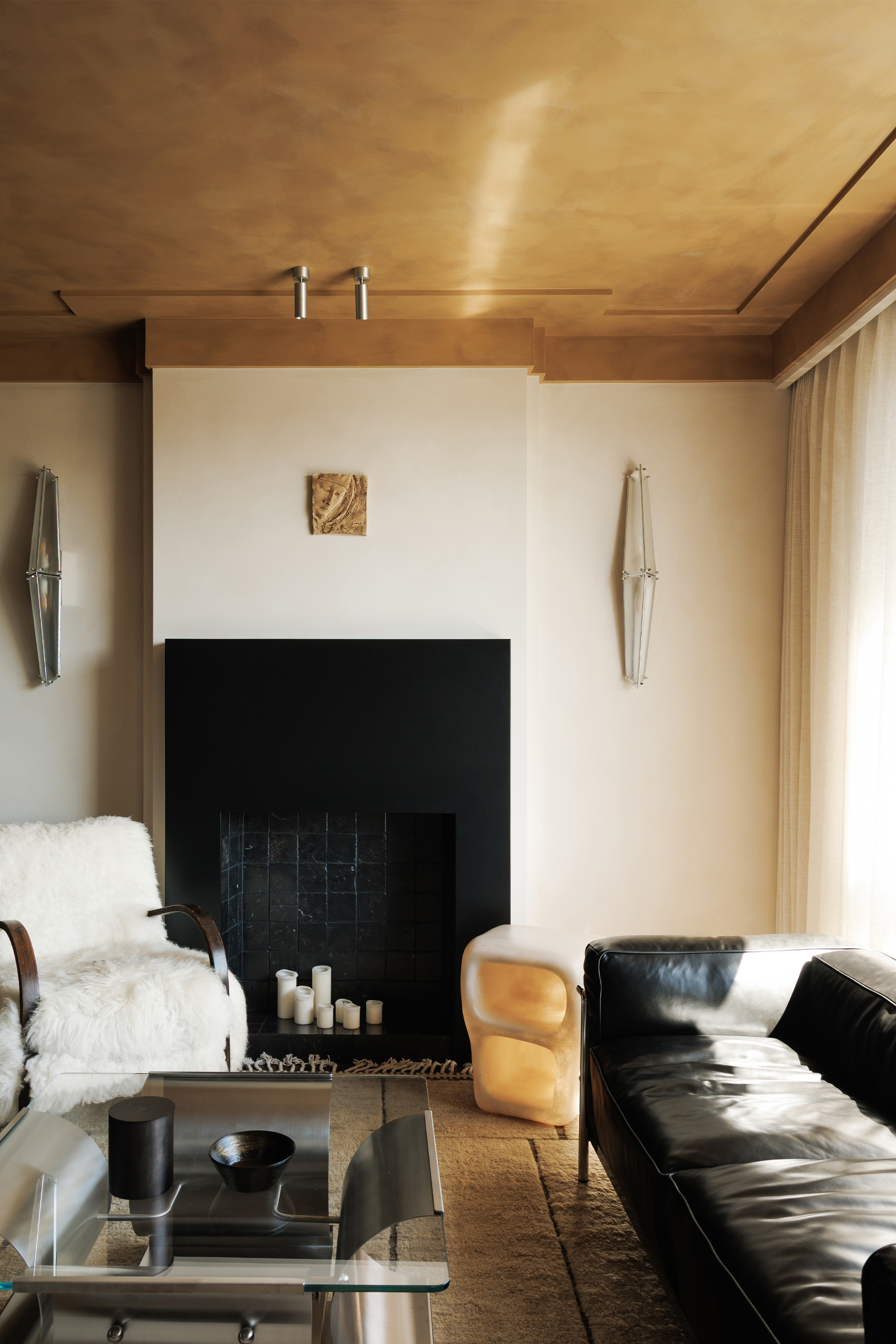 After discussing our ideas, we defined this new home as "new money," defining the space through personal experience, the quality and tactile feel of life, rather than using a single brand to showcase status. In terms of materials, we chose to inlay natural elements with metals, using wood, stone, metal, leather, and other materials to form the material system of this new home. The house is naturally divided into active and quiet areas by load-bearing walls. The living room, dining room, and kitchen are completely open, reconnecting the spaces in an orderly manner. The functional areas are reconstructed symmetrically, from the axis of the fireplace in the living room to the placement of the dining room furniture, and the symmetrical layout of the kitchen centered around the island dining table. This creates a sense of balance and order through the variation of materials, adding a touch of ritual to everyday life.