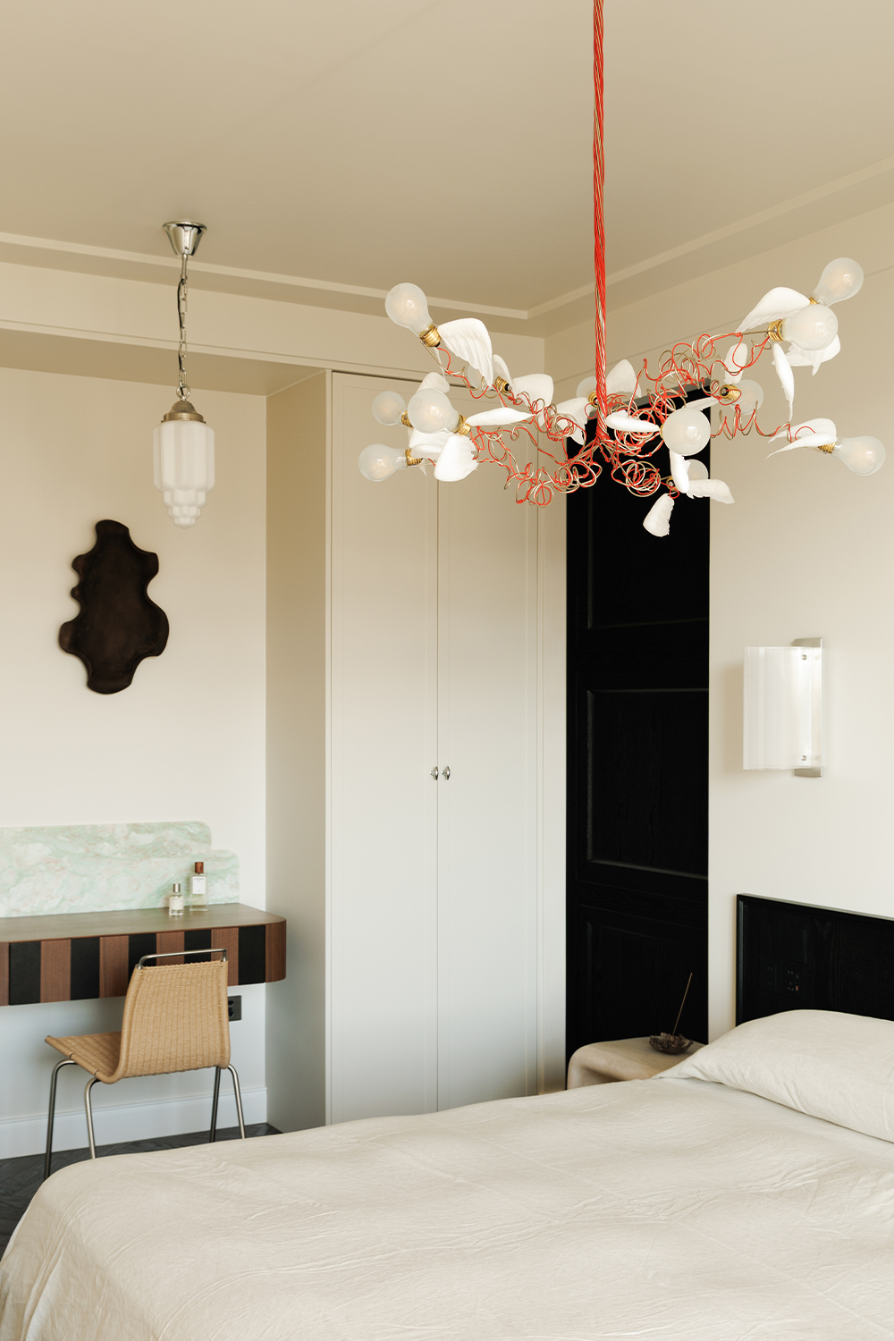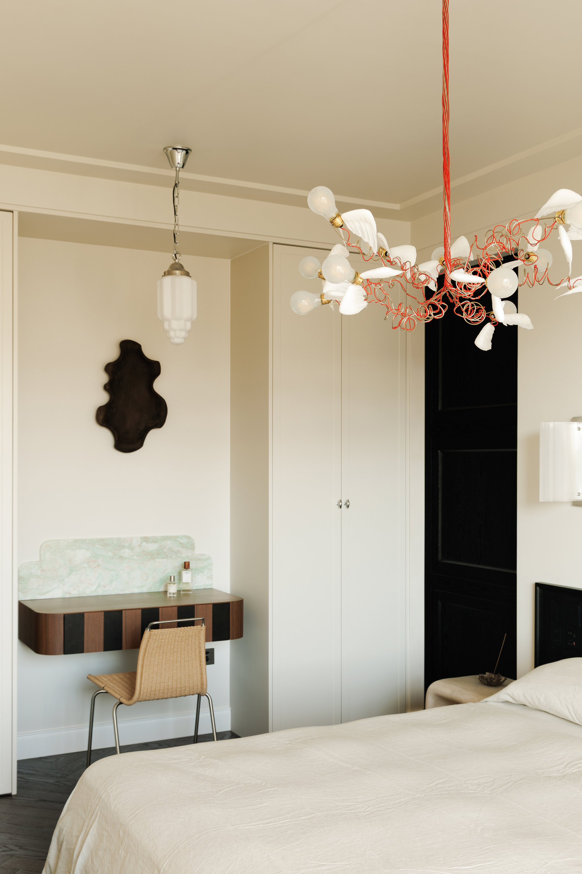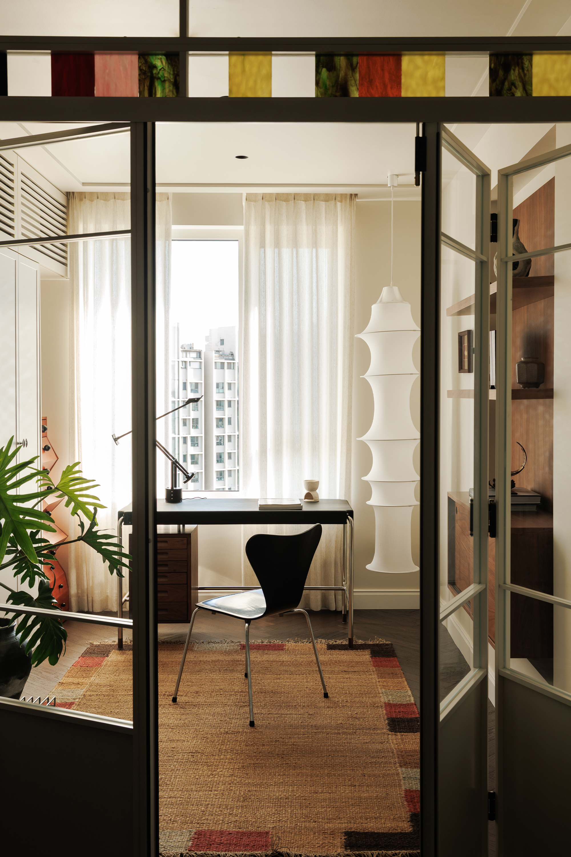 One room was retained as the master bedroom, and the other as a study. Two fully opening doors alter the flow of the living areas, maximizing the sense of openness. To allow better natural light into the study, glass doors were installed, with different colored handcrafted glass accents on the door beams. The handcrafted details create variations in the light. This space is where the girls work overtime and do photoshoots and editing. We specifically placed the desk under the window, using this seemingly casual layout to add a sense of relaxation to the work environment.