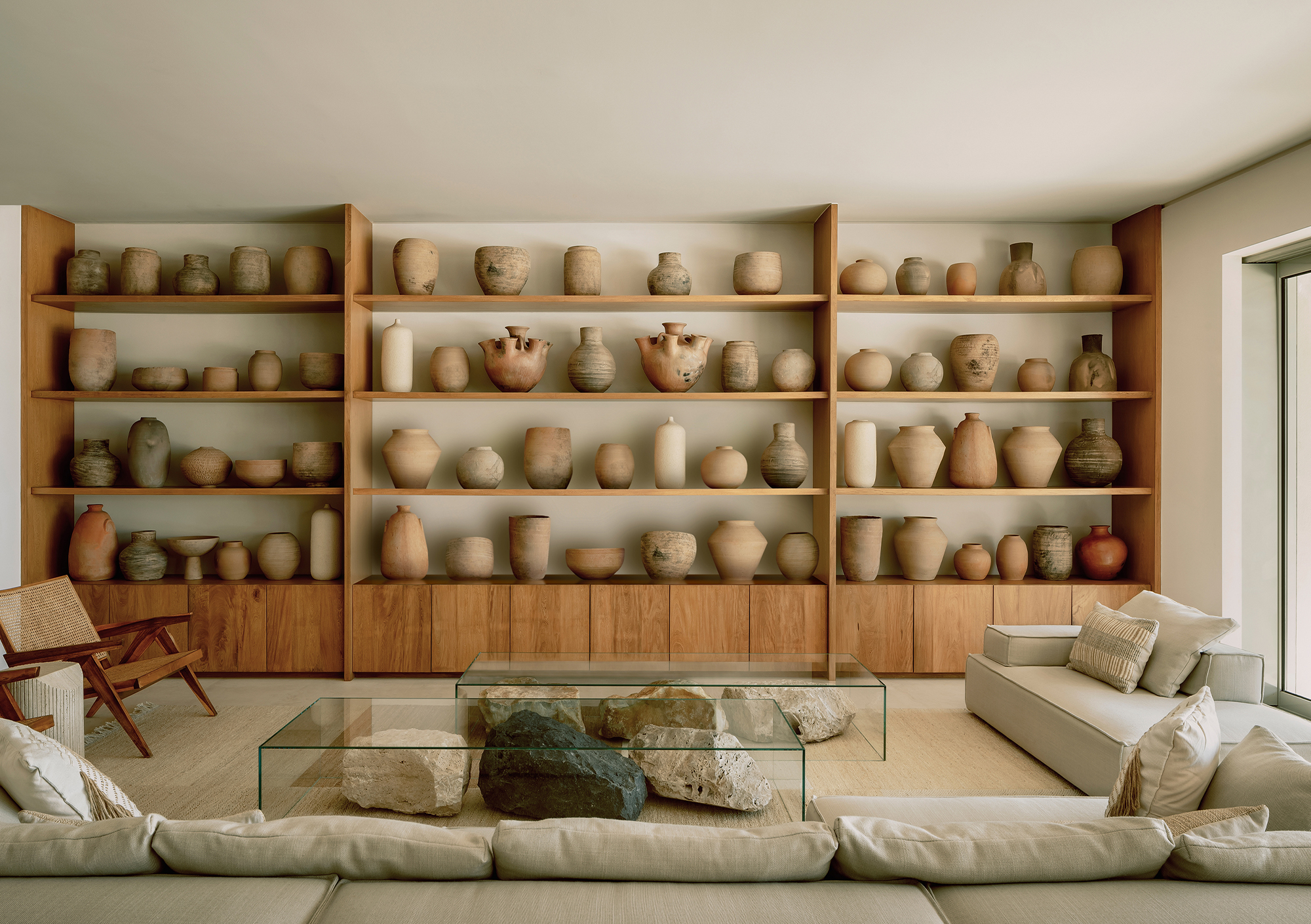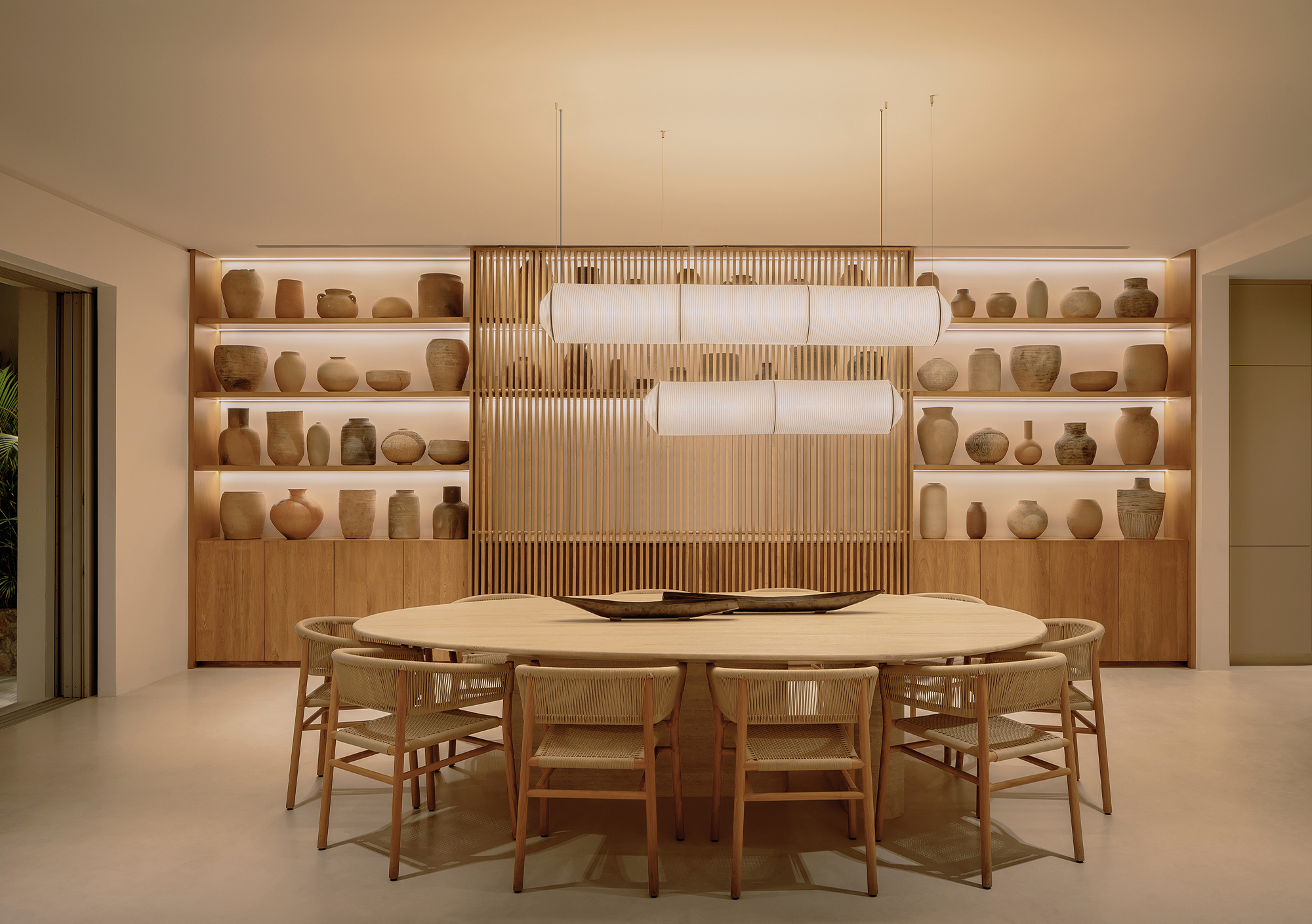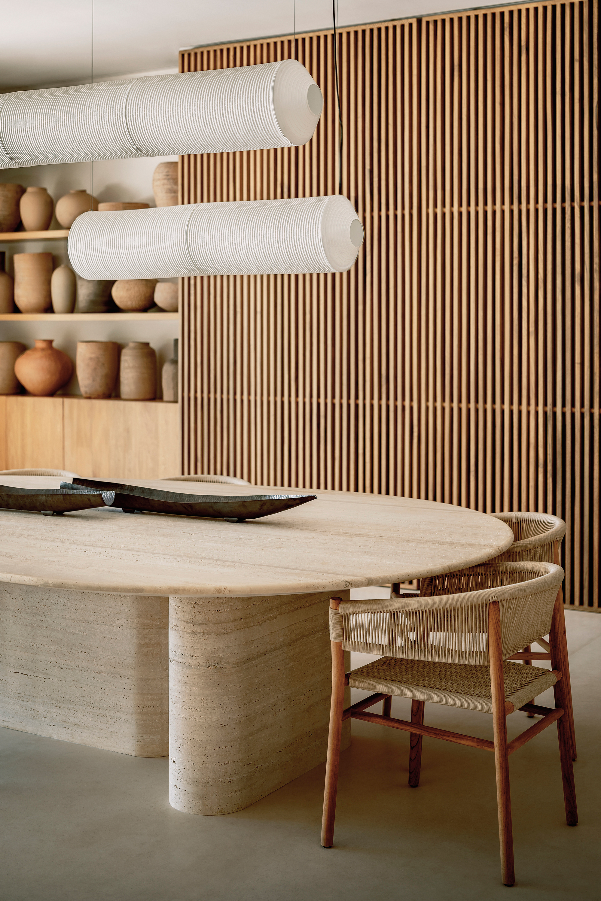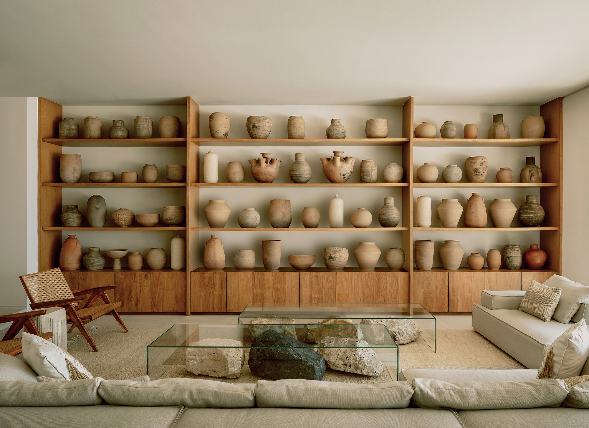 The neat design is complemented by an exquisite curation of jute, henequen, clay, copper and stone pieces from different parts of Mexico and the result of collaborations between Mexican artisans and artists.