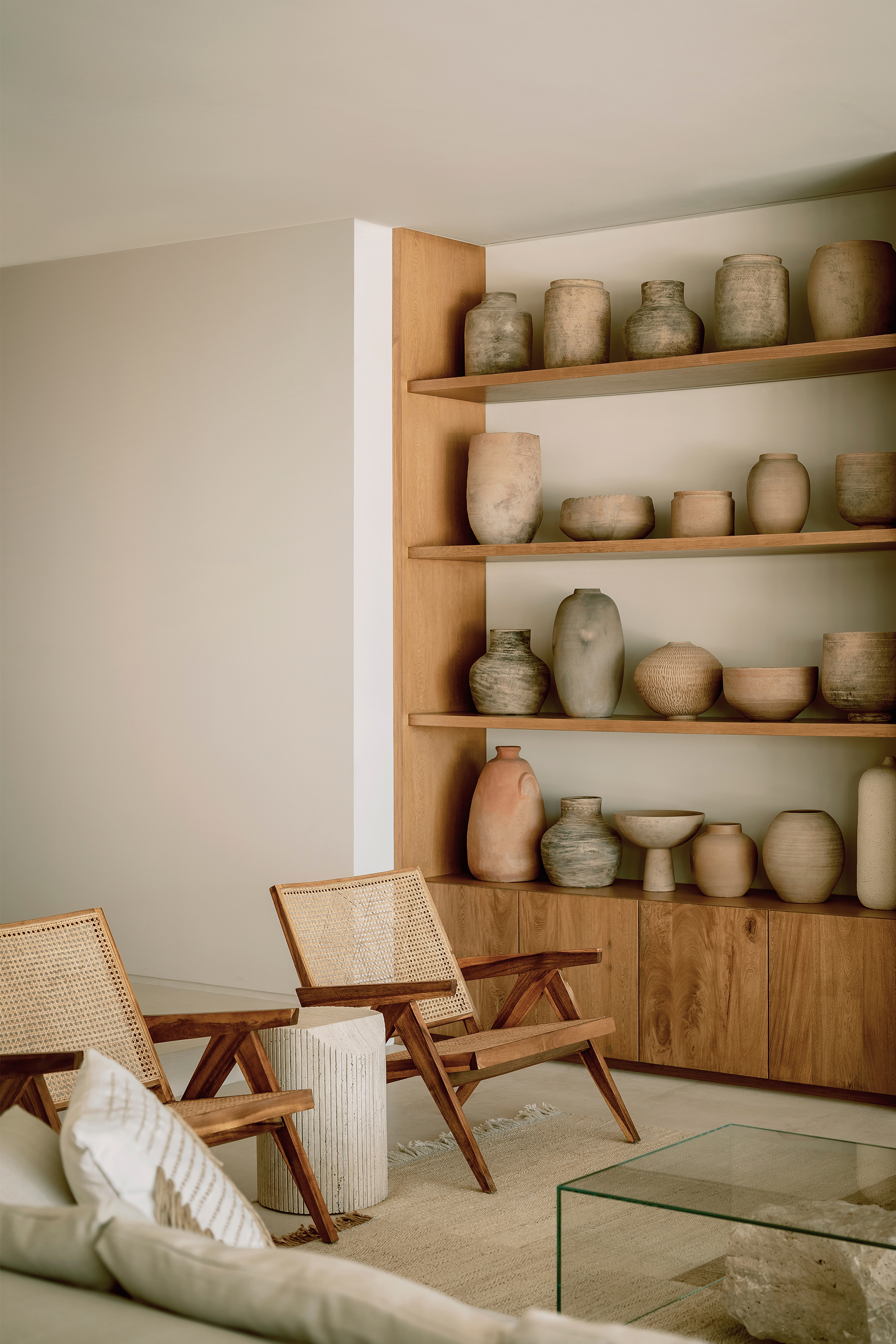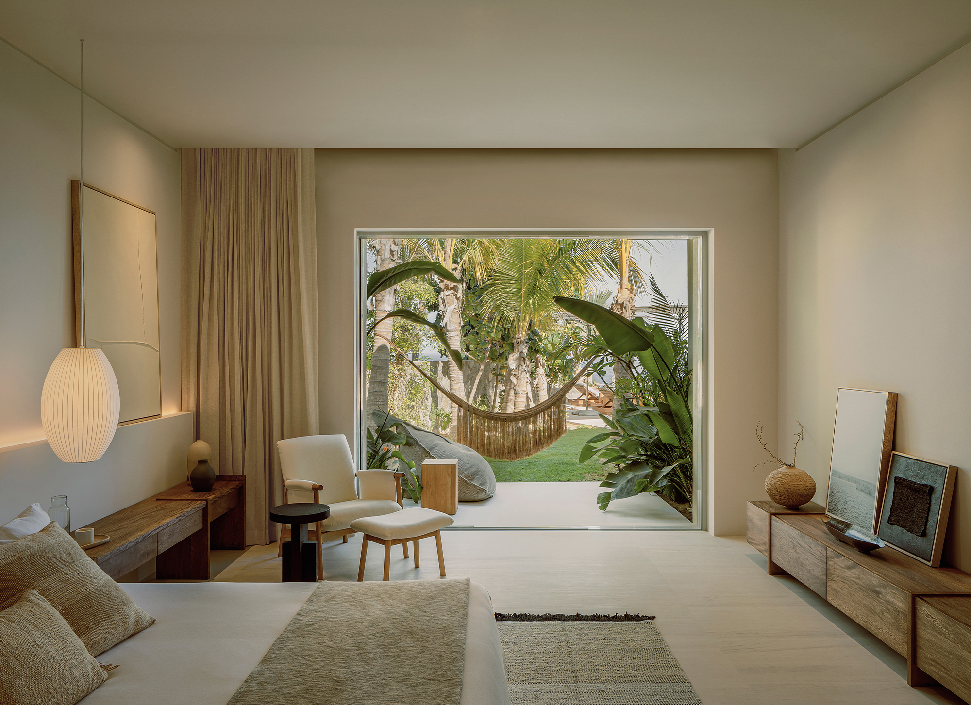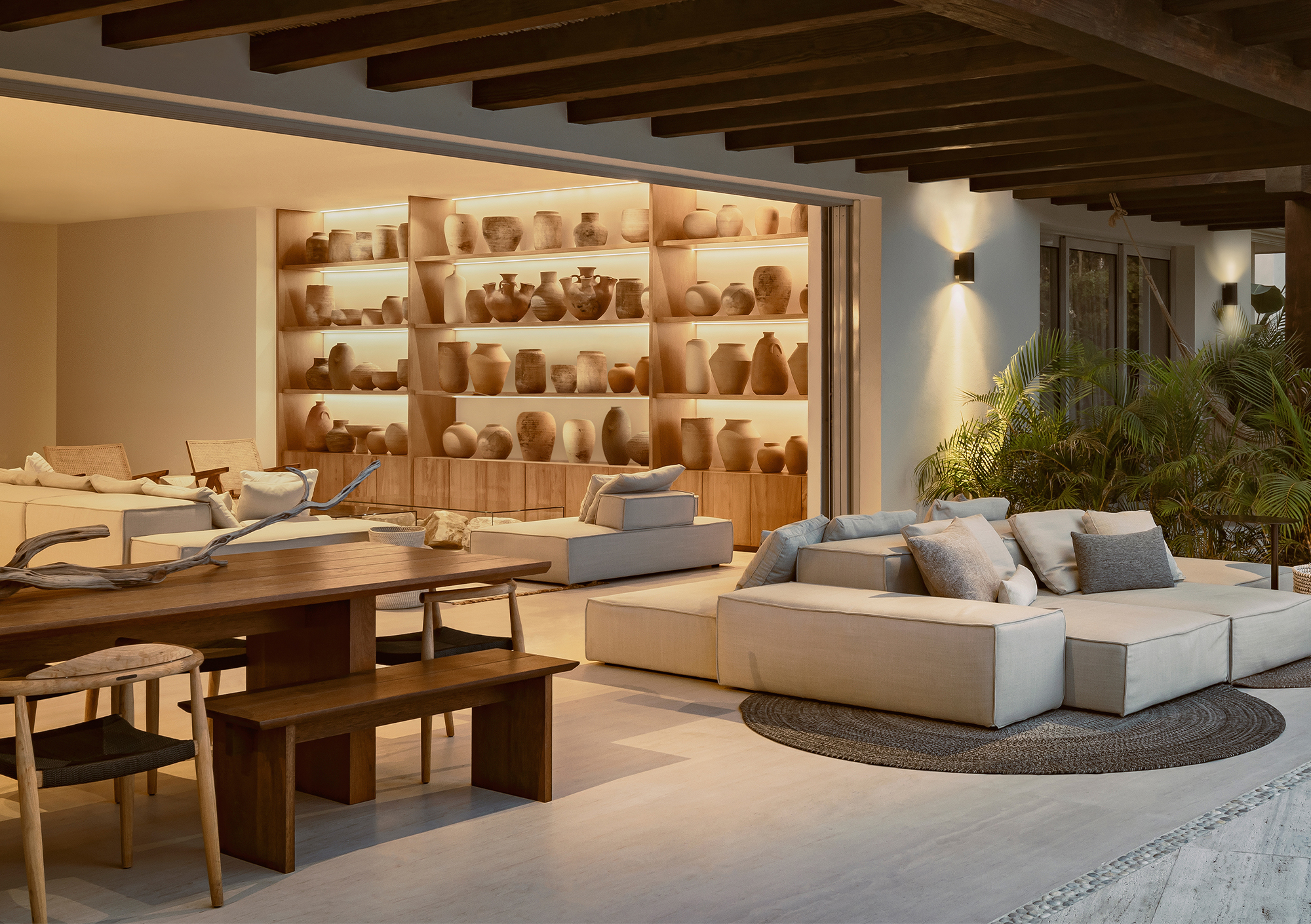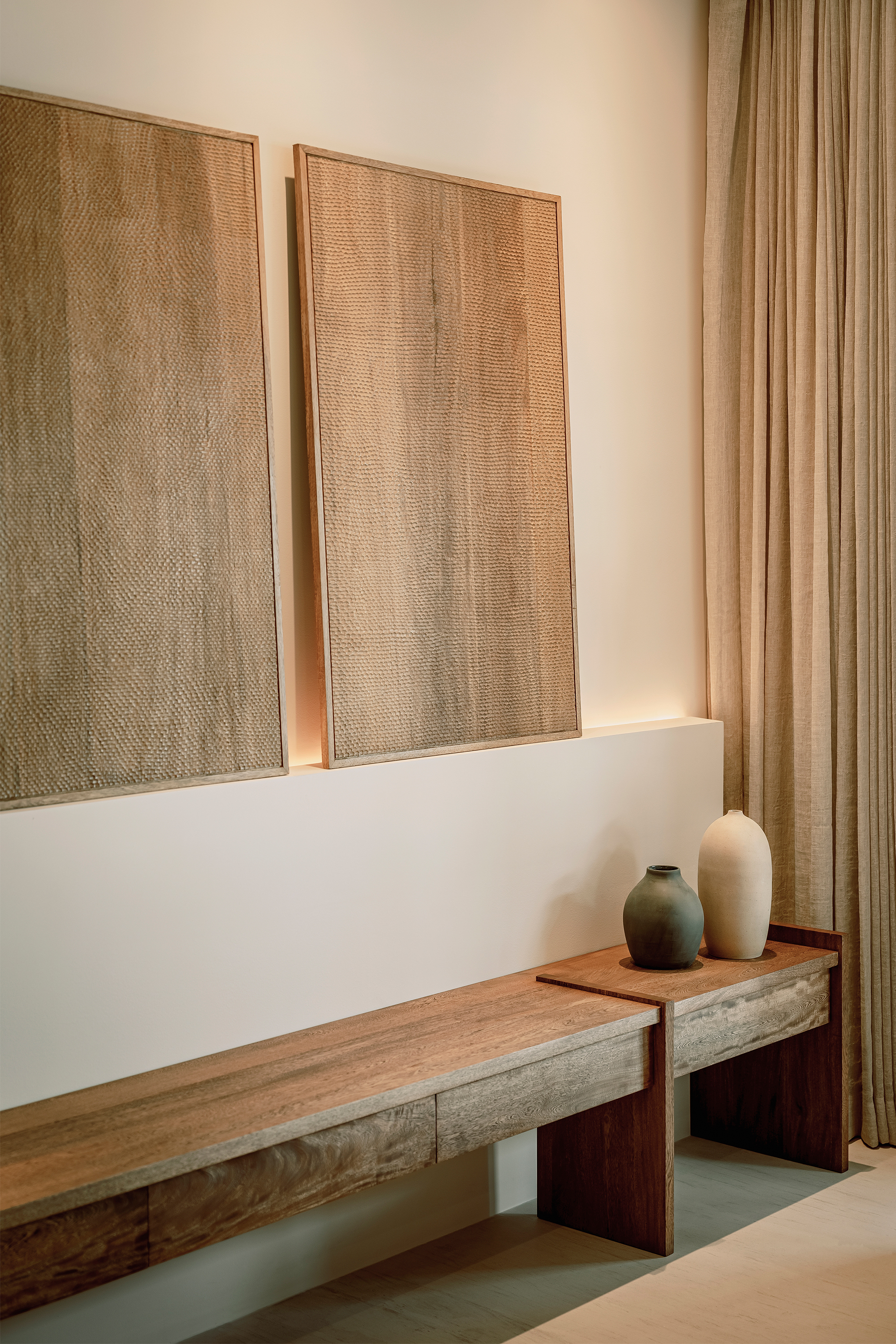 The neat design is complemented by an exquisite curation of jute, henequen, clay, copper and stone pieces from different parts of Mexico and the result of collaborations between Mexican artisans and artists.