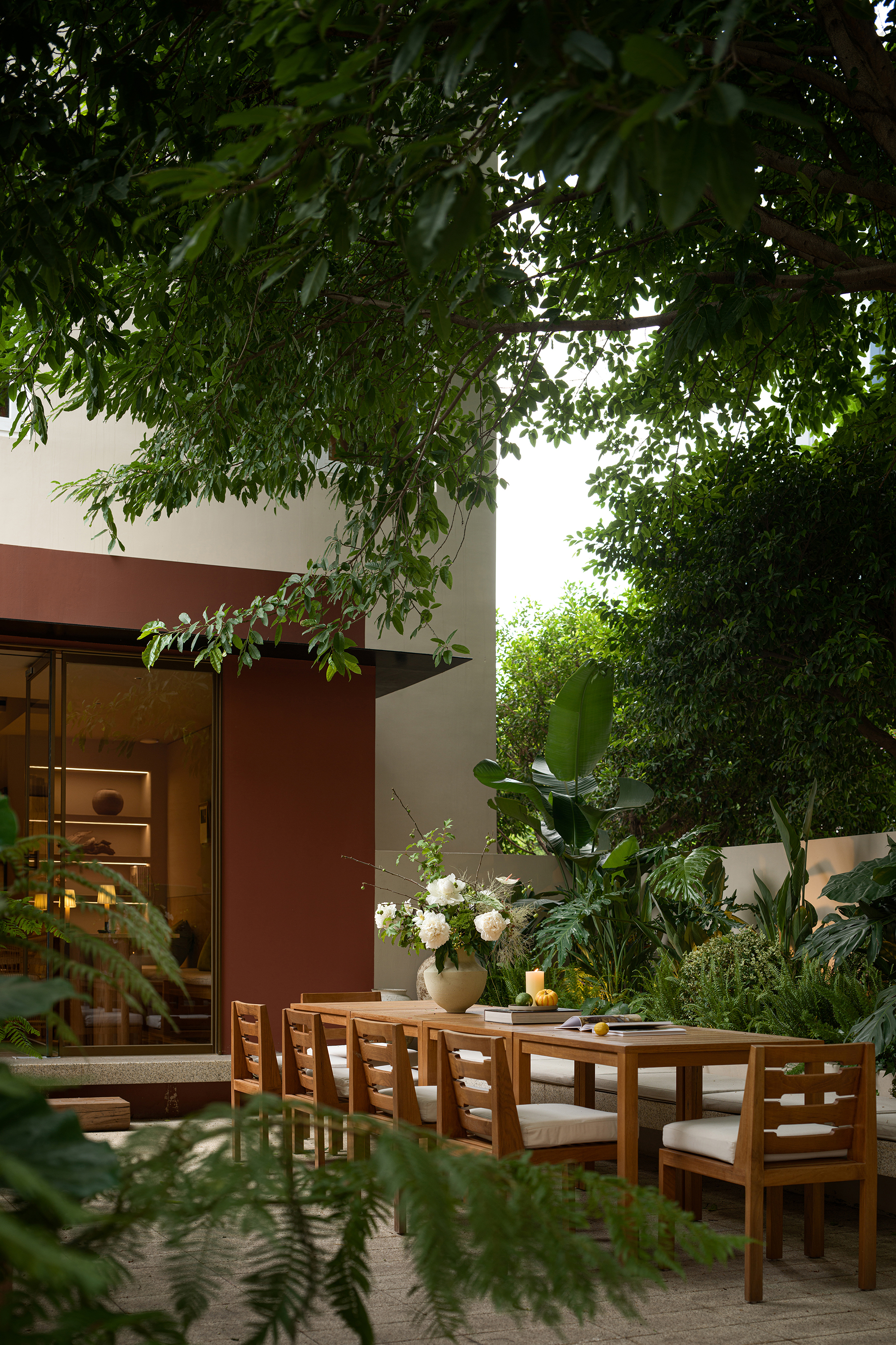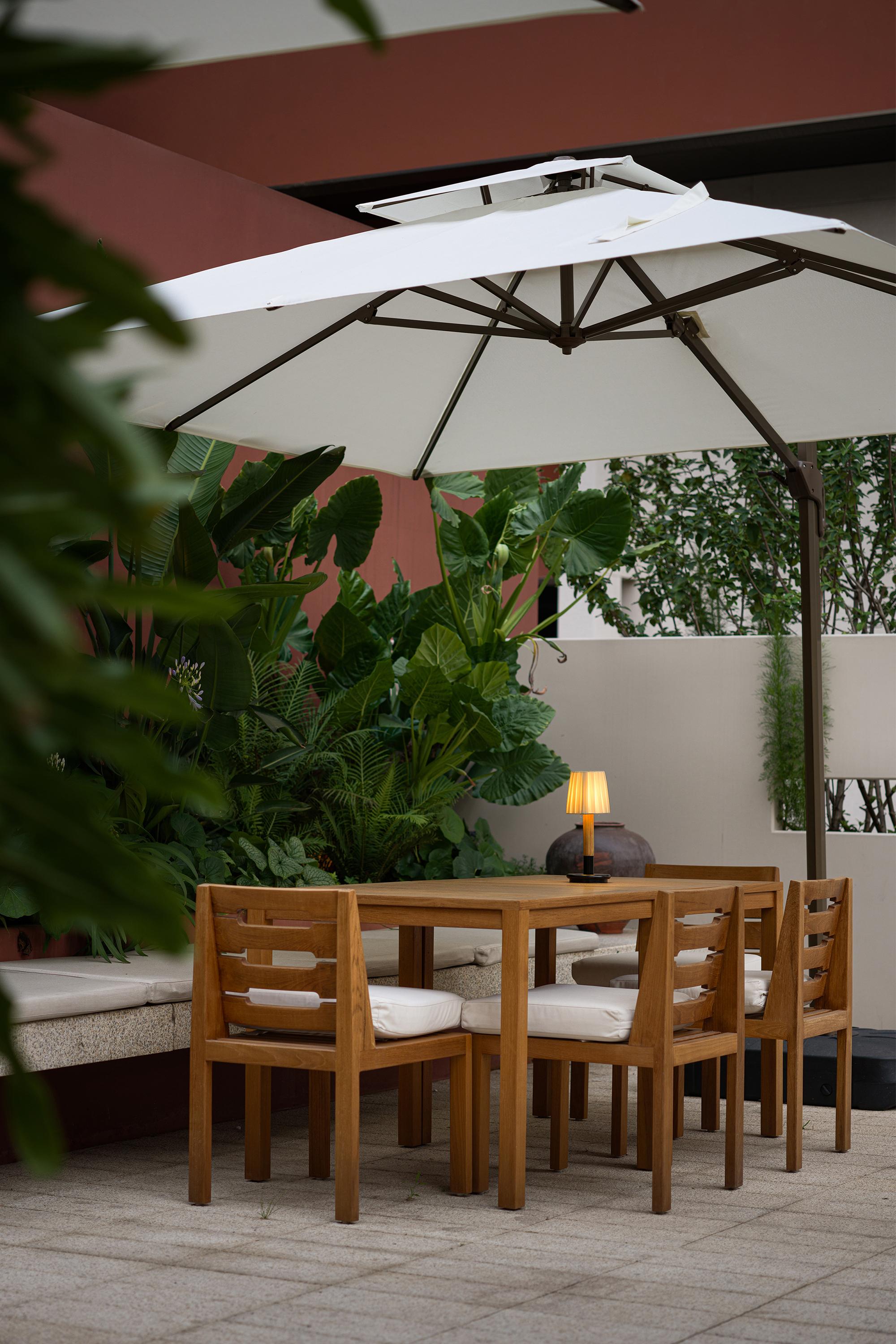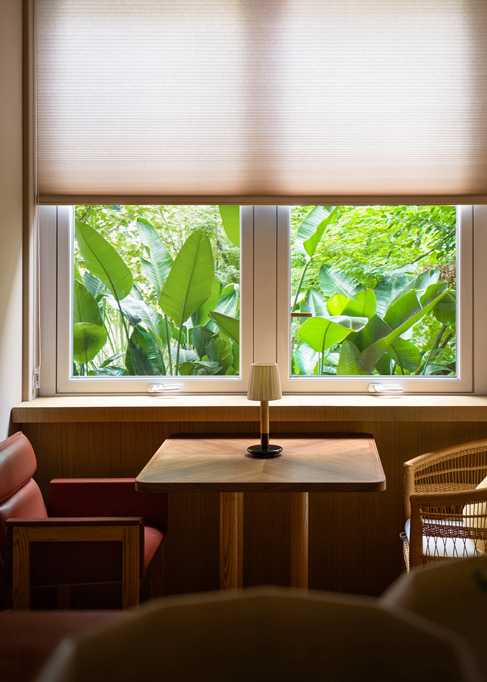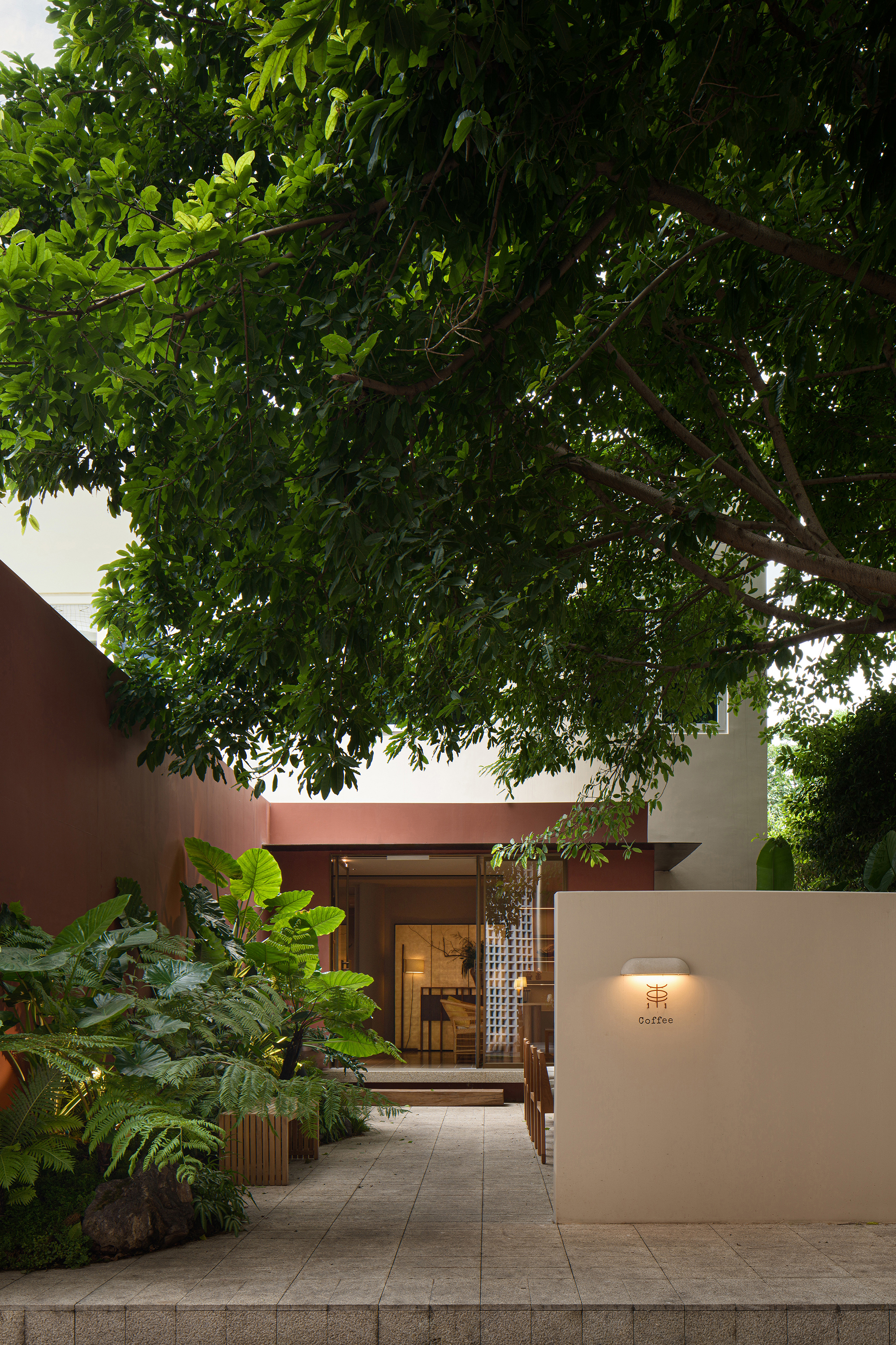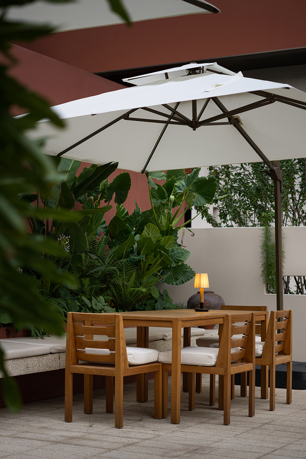 Inside, the aroma of coffee fills the air, but the soould of the space lies in the lush, green courtyard. A few umbrellas, scattered tables, and dappled sunlight filtering through the leaves create a living stage. This café has become the bridge betwwn design and the public, nurturing creativity in nature’s embrace. Instead of pursuing flashy forms, the design focuses on people’s authentic feelings within the space, breaking boundaries to bring the landscape indoors, achieving an aesthetic unity of commercial logic and humanistic spirit.