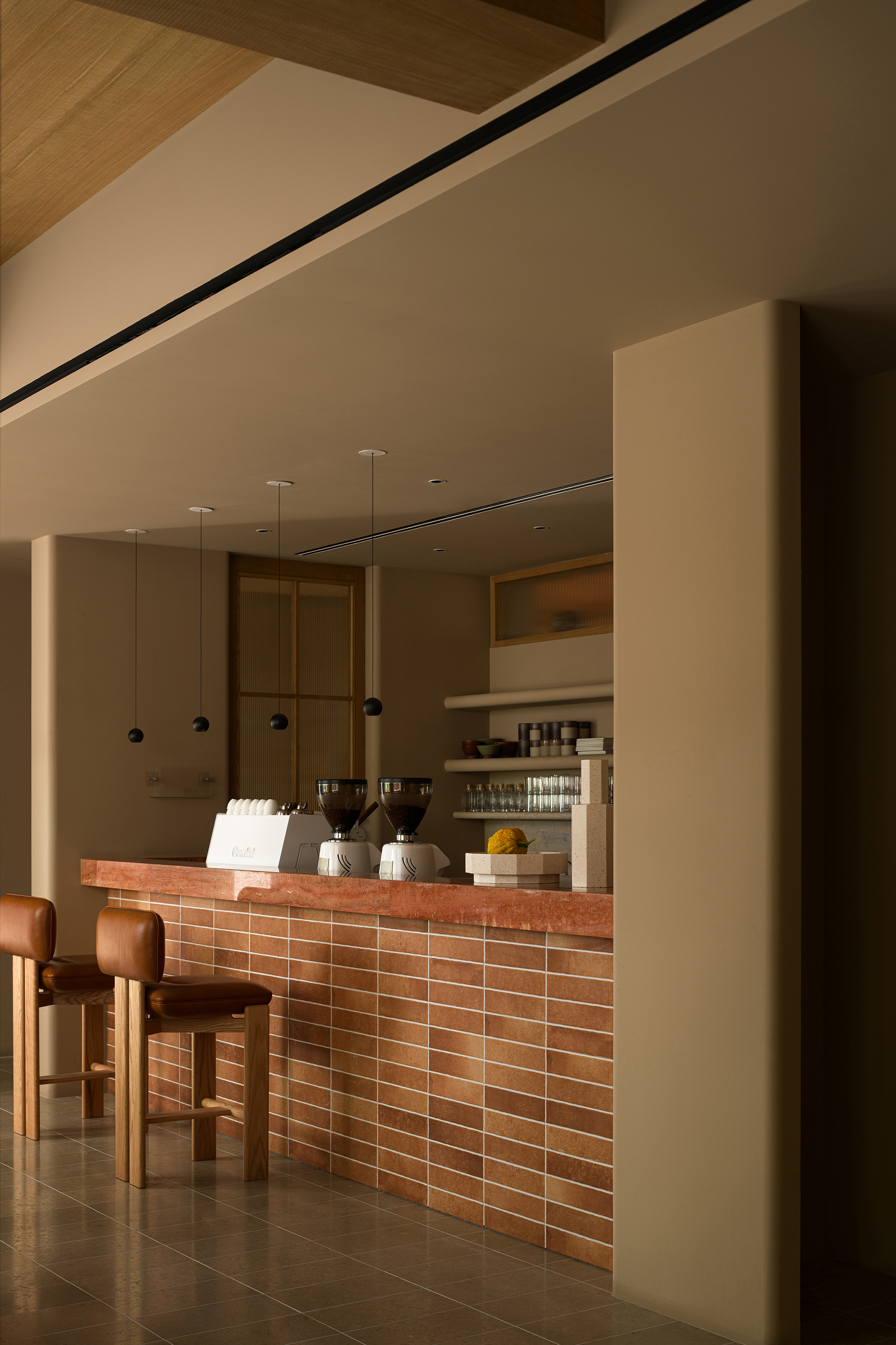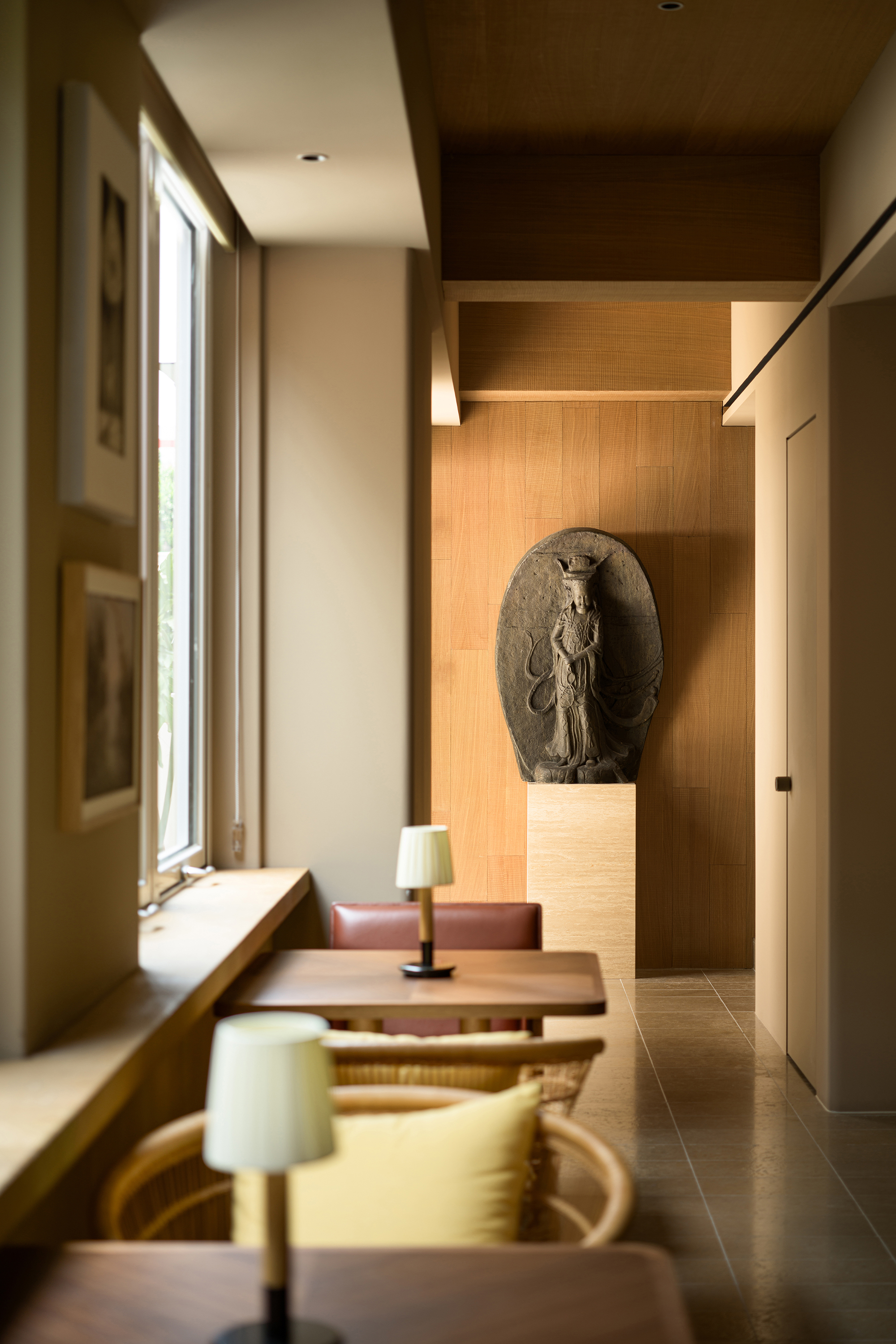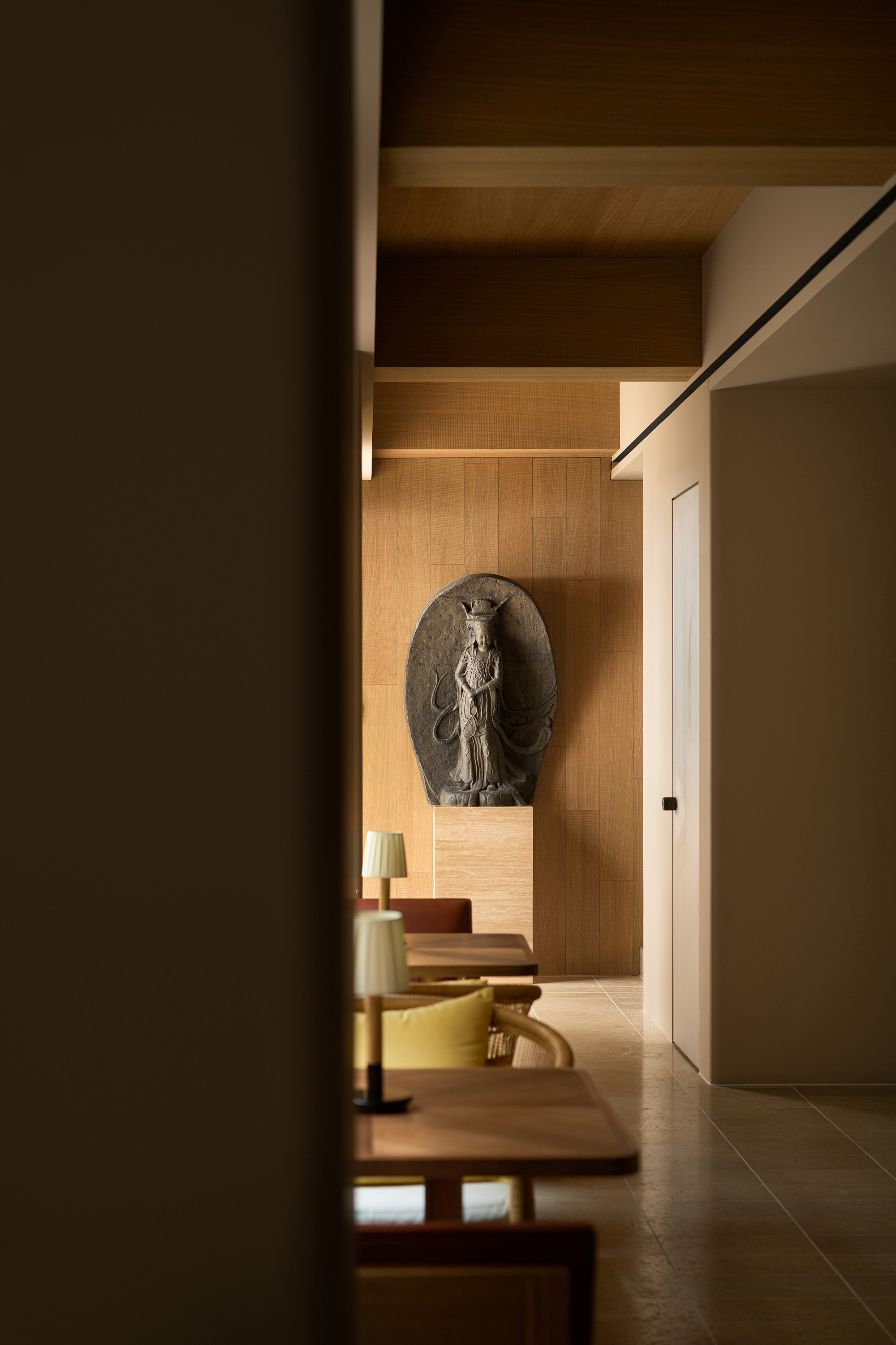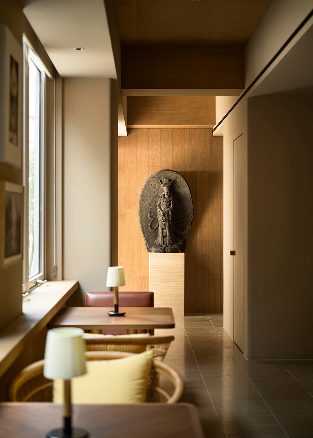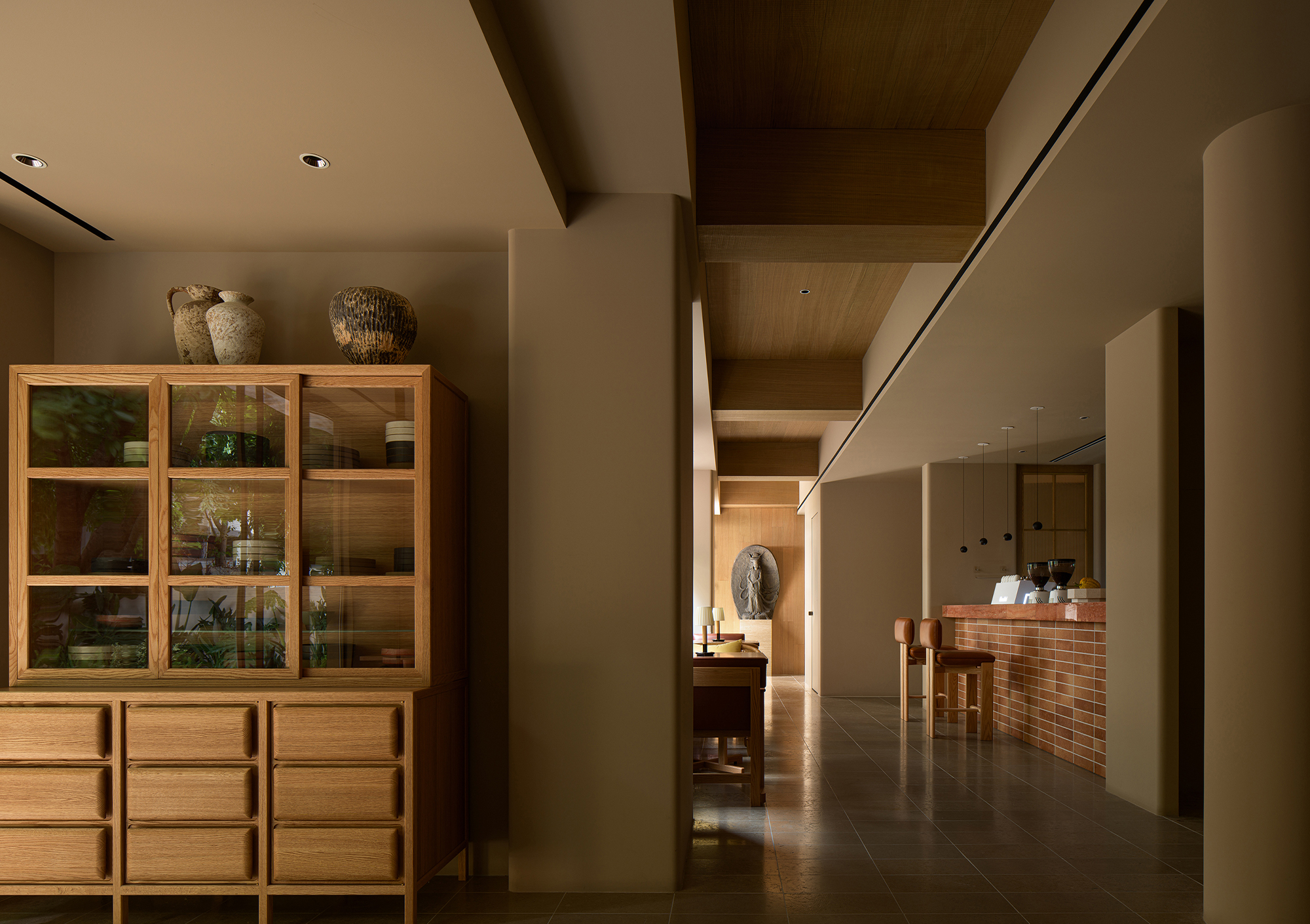Stepping indoors, the warm and serene natural textures, combined with soft warm lighting, instantly bring relaxation. The main tones are beige and natural wood, warm and neutral, soothing and calm. A brick-red bar counter and warm gray stone flooring add stability and timelessness. The overall low-saturation palette creates a comfortable, quiet mood. Warm natural textures and soft lighting create an atmosphere of calm and ease indoors. A palette of beige and wood tones sets the foundation, accented by a brick-red bar and warm gray stone flooring—quiet, grounded, and timeless. Materials such as small-format stone tiles and textured oak panels balance natural authenticity with contemporary minimalism. Ceramic jars and stone sculptures enrich the cultural atmosphere, while custom furniture adds identity and character—letting the materials themselves speak with quiet confidence.