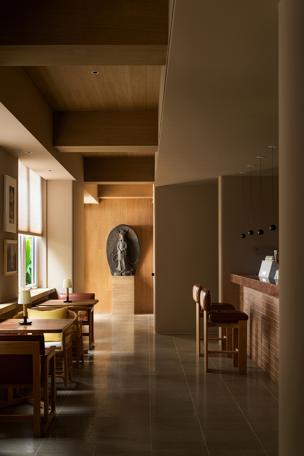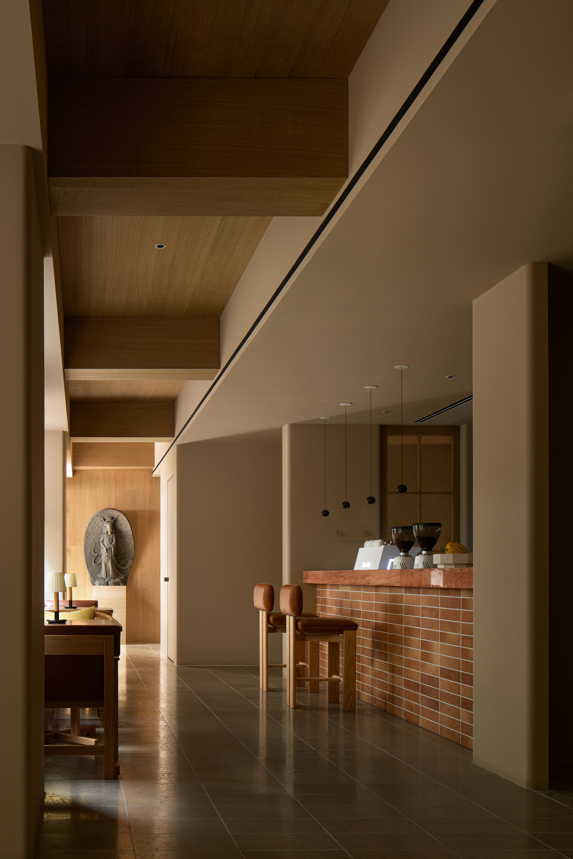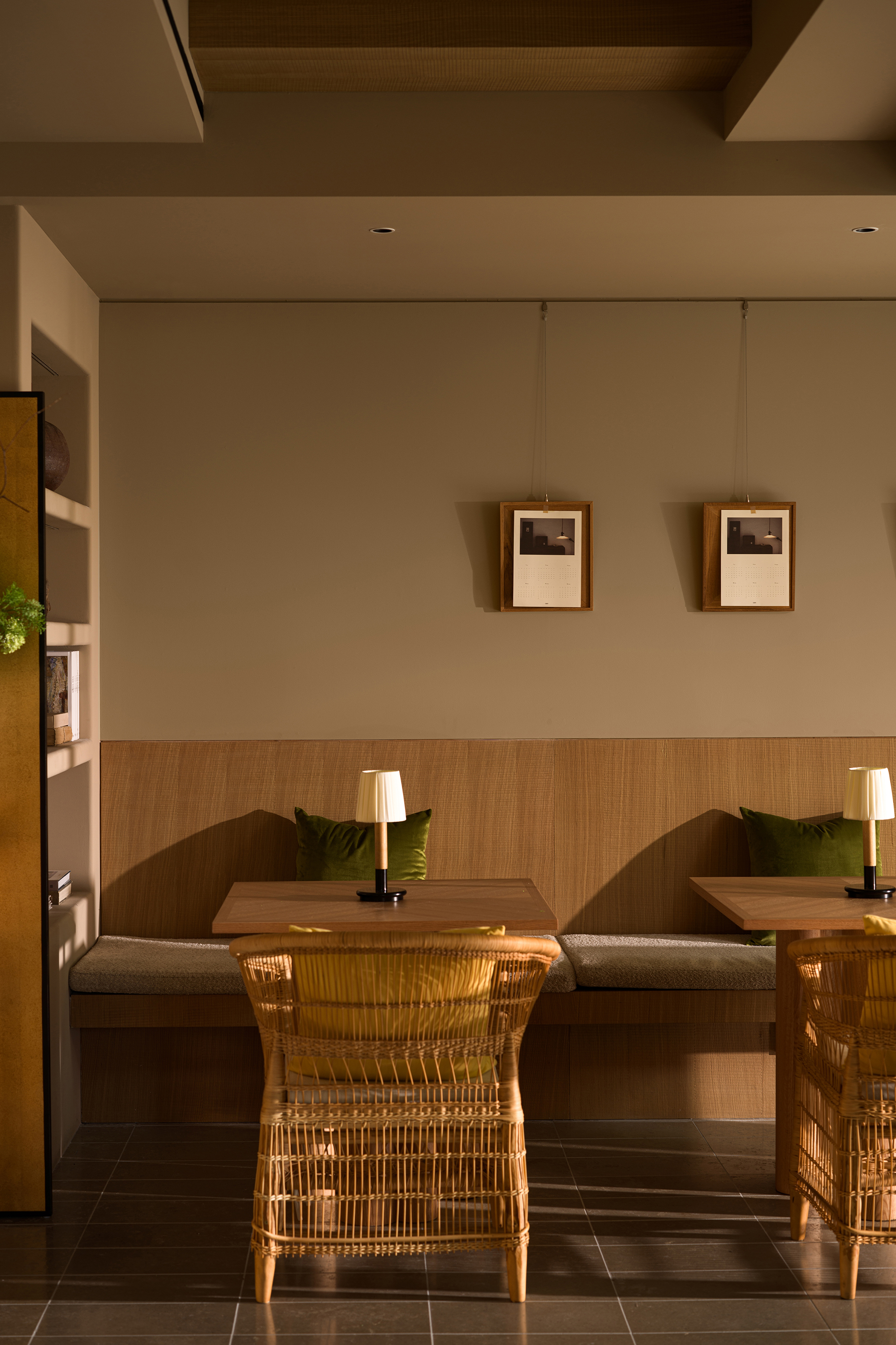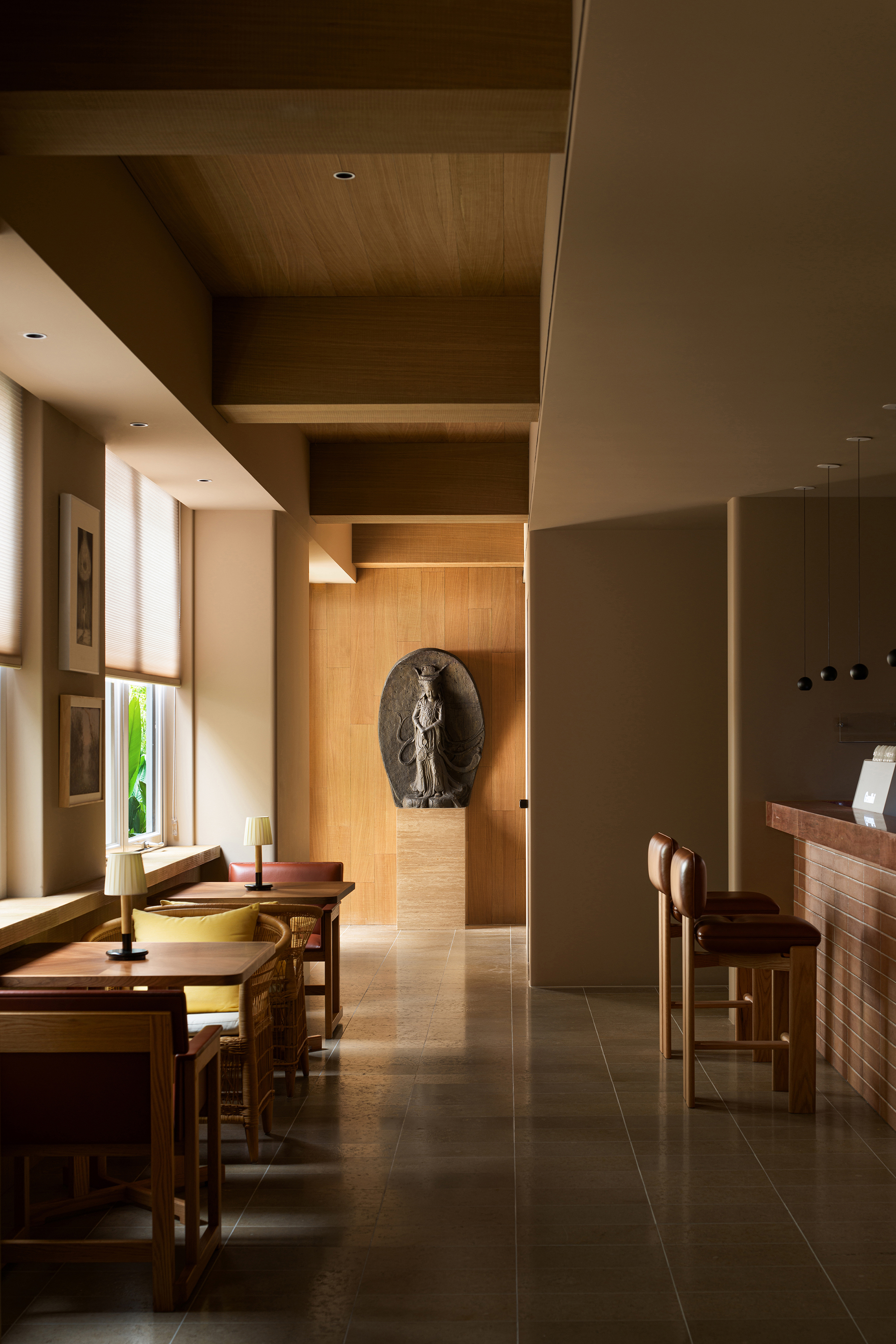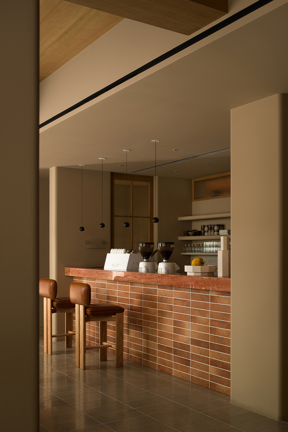 Stepping indoors, the warm and serene natural textures, combined with soft warm lighting, instantly bring relaxation. The main tones are beige and natural wood, warm and neutral, soothing and calm. A brick-red bar counter and warm gray stone flooring add stability and timelessness. The overall low-saturation palette creates a comfortable, quiet mood. Warm natural textures and soft lighting create an atmosphere of calm and ease indoors. A palette of beige and wood tones sets the foundation, accented by a brick-red bar and warm gray stone flooring—quiet, grounded, and timeless. Materials such as small-format stone tiles and textured oak panels balance natural authenticity with contemporary minimalism. Ceramic jars and stone sculptures enrich the cultural atmosphere, while custom furniture adds identity and character—letting the materials themselves speak with quiet confidence.