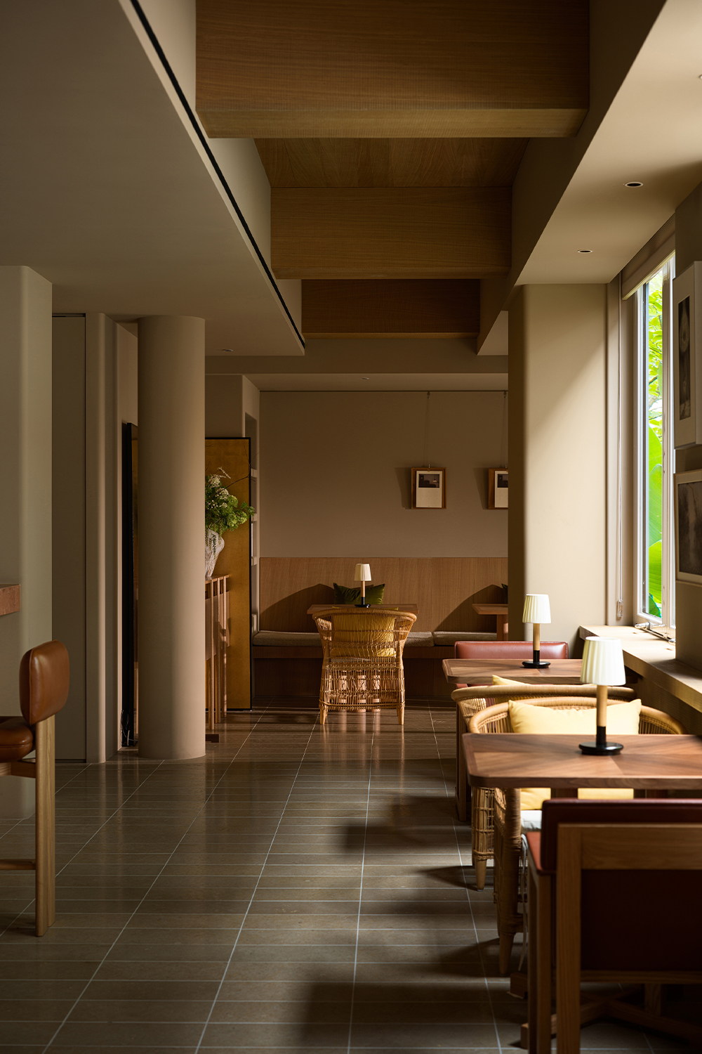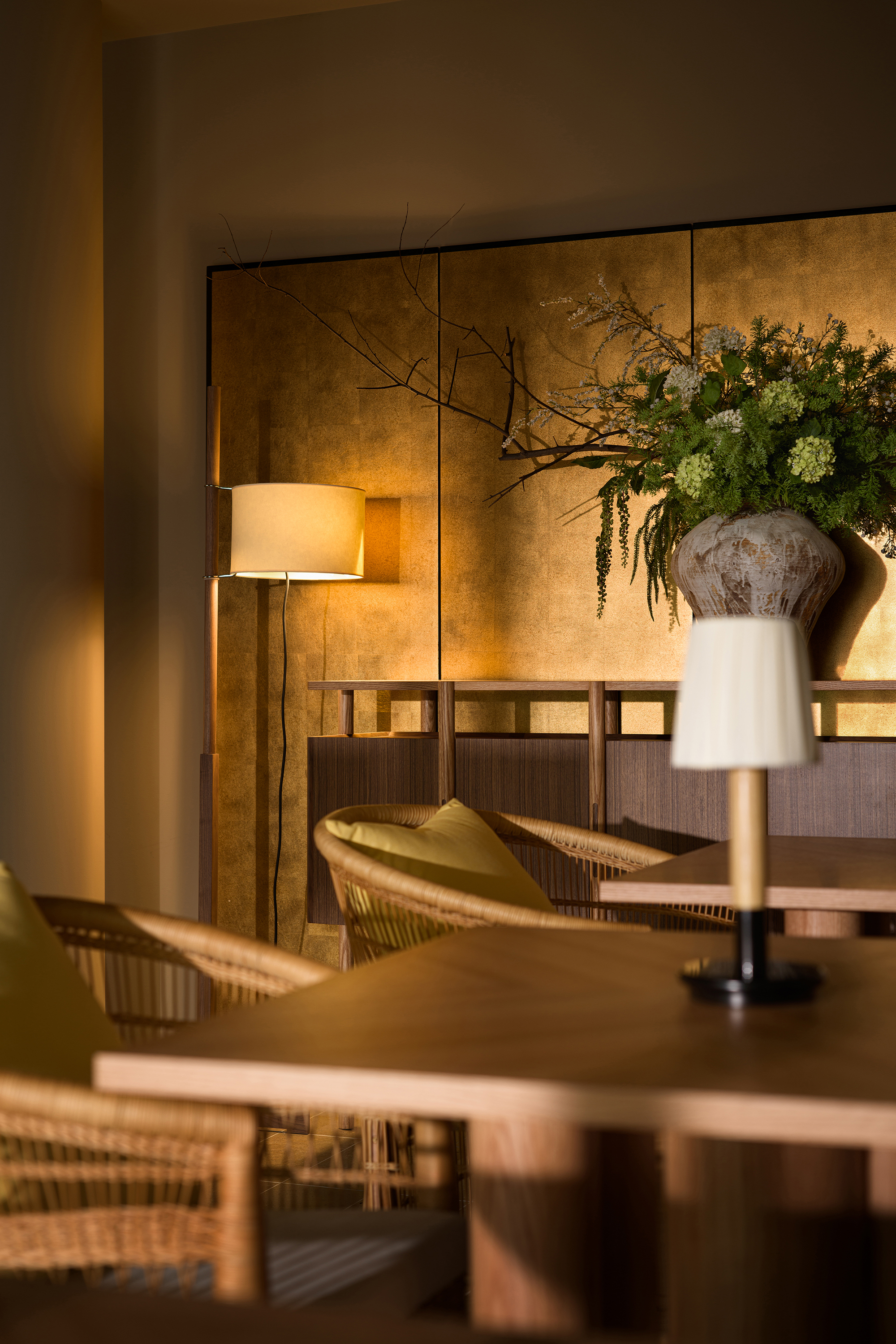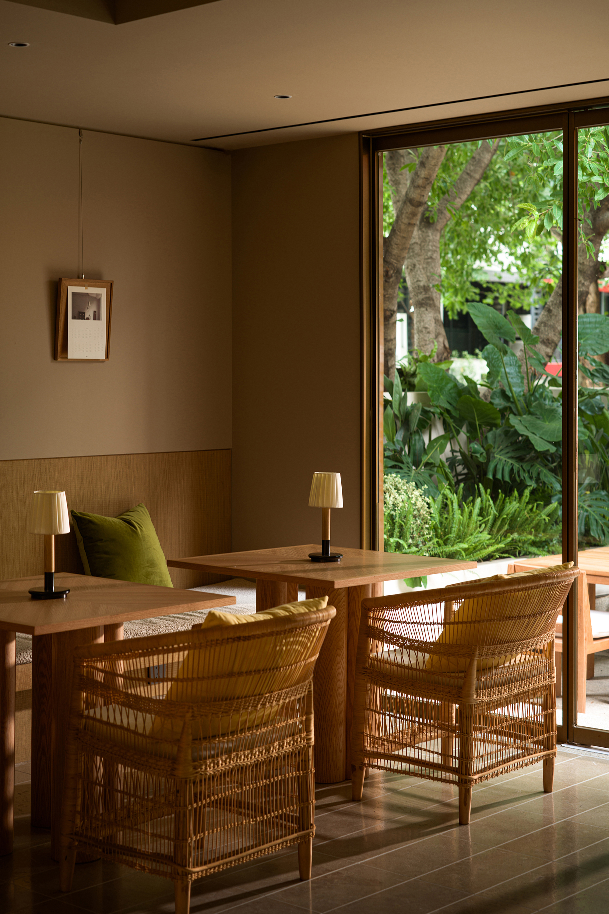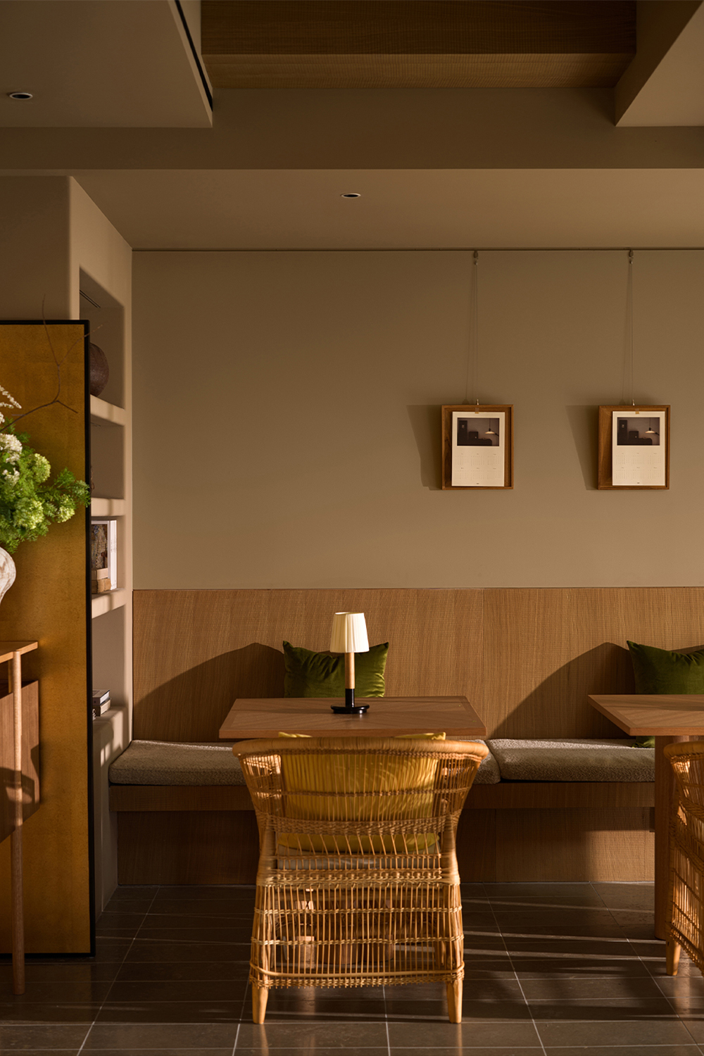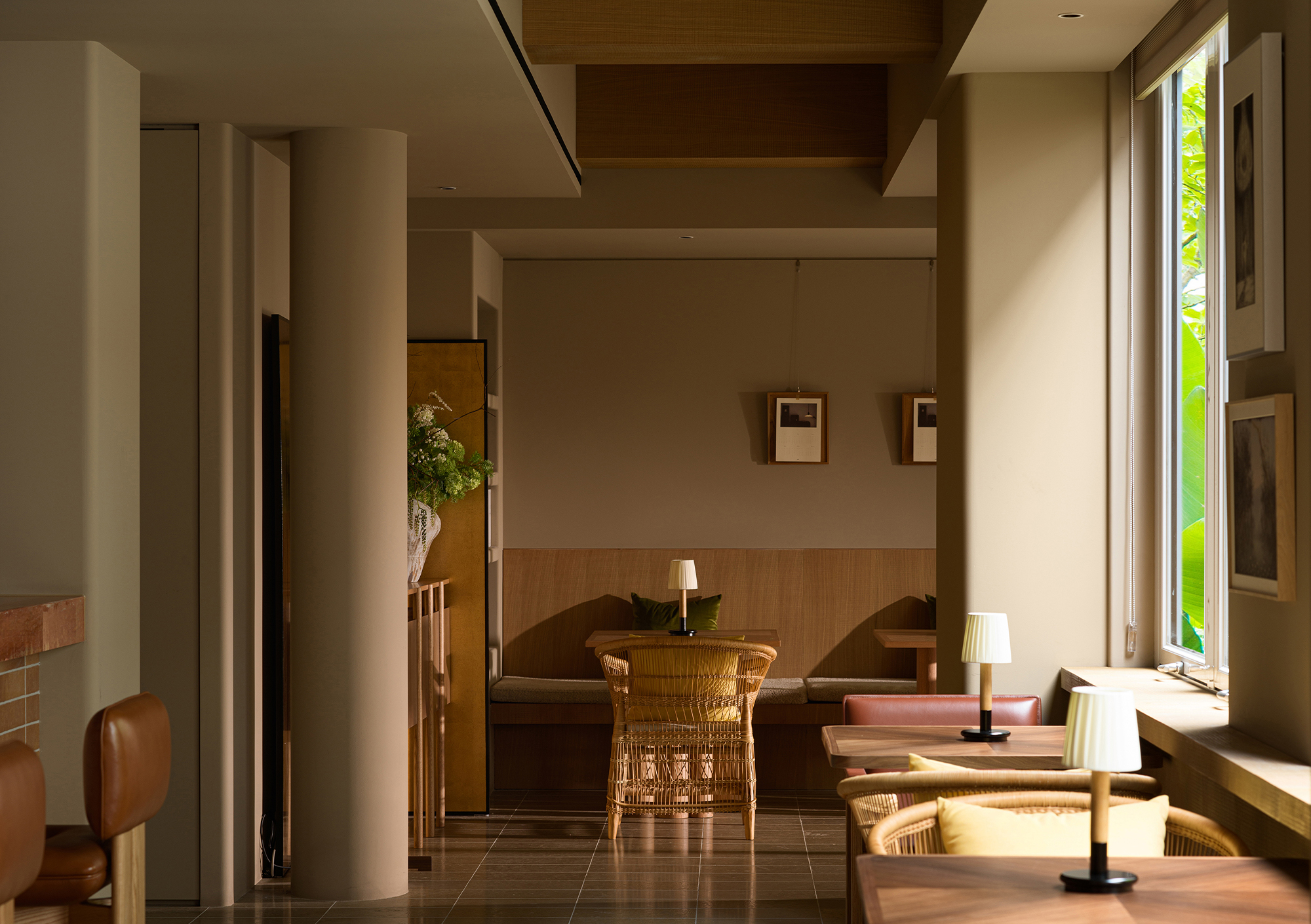 Stepping indoors, the warm and serene natural textures, combined with soft warm lighting, instantly bring relaxation. The main tones are beige and natural wood, warm and neutral, soothing and calm. A brick-red bar counter and warm gray stone flooring add stability and timelessness. The overall low-saturation palette creates a comfortable, quiet mood. Warm natural textures and soft lighting create an atmosphere of calm and ease indoors. A palette of beige and wood tones sets the foundation, accented by a brick-red bar and warm gray stone flooring—quiet, grounded, and timeless. Materials such as small-format stone tiles and textured oak panels balance natural authenticity with contemporary minimalism. Ceramic jars and stone sculptures enrich the cultural atmosphere, while custom furniture adds identity and character—letting the materials themselves speak with quiet confidence.