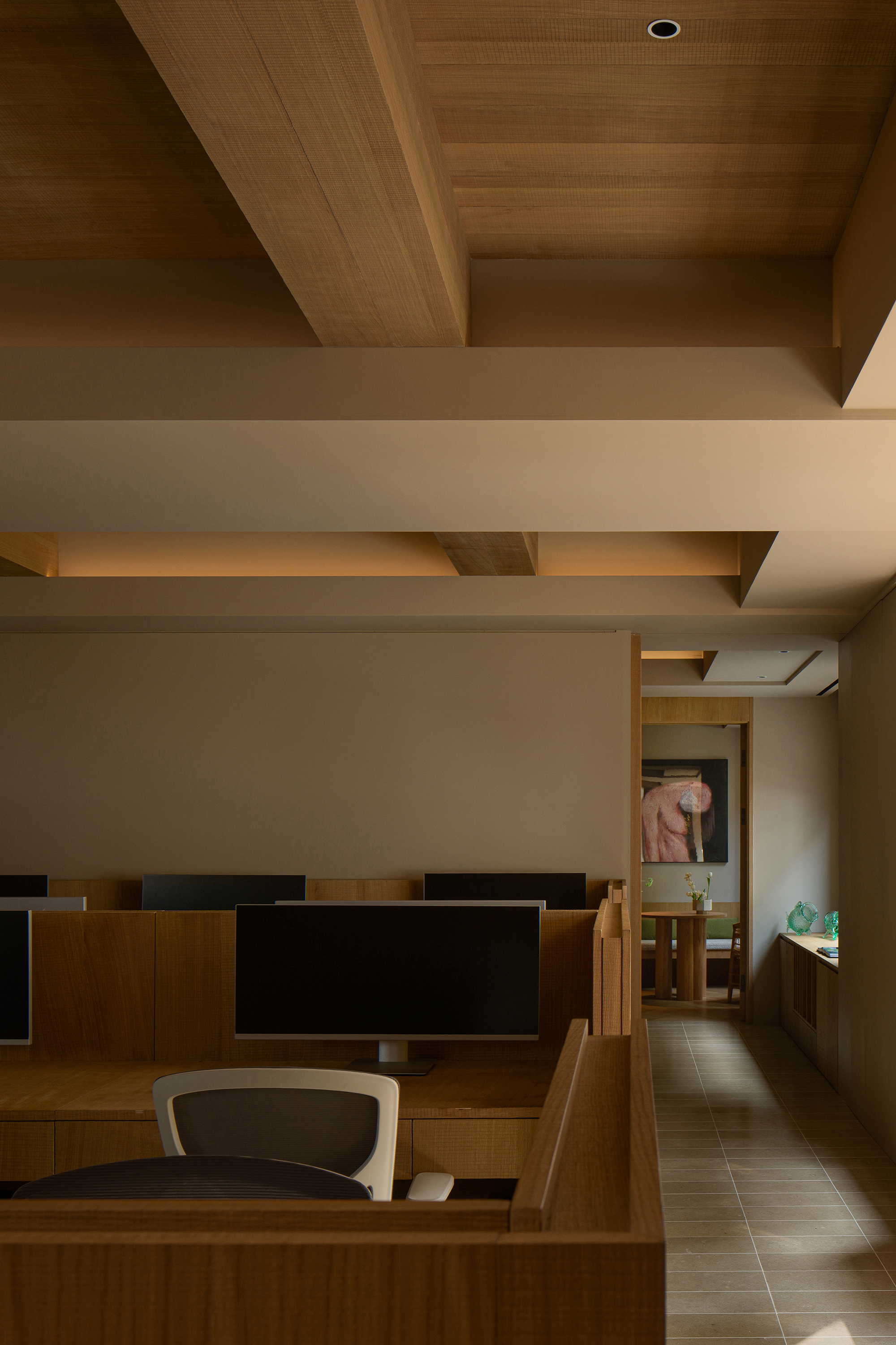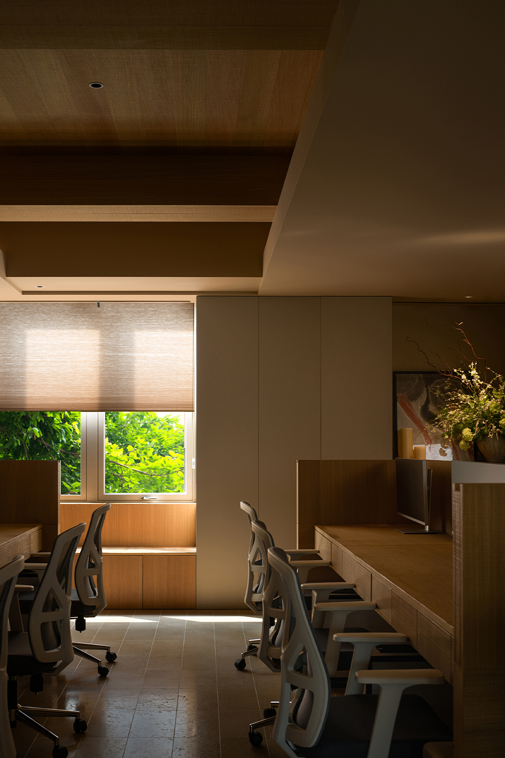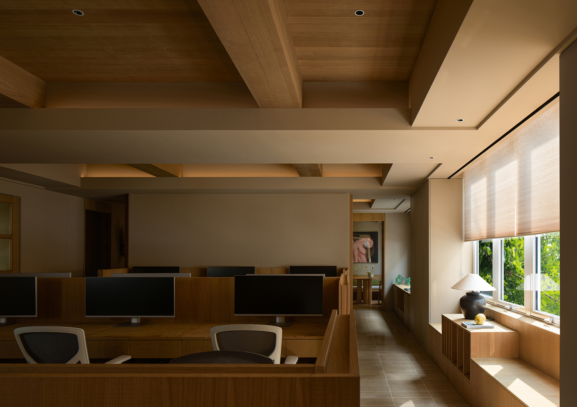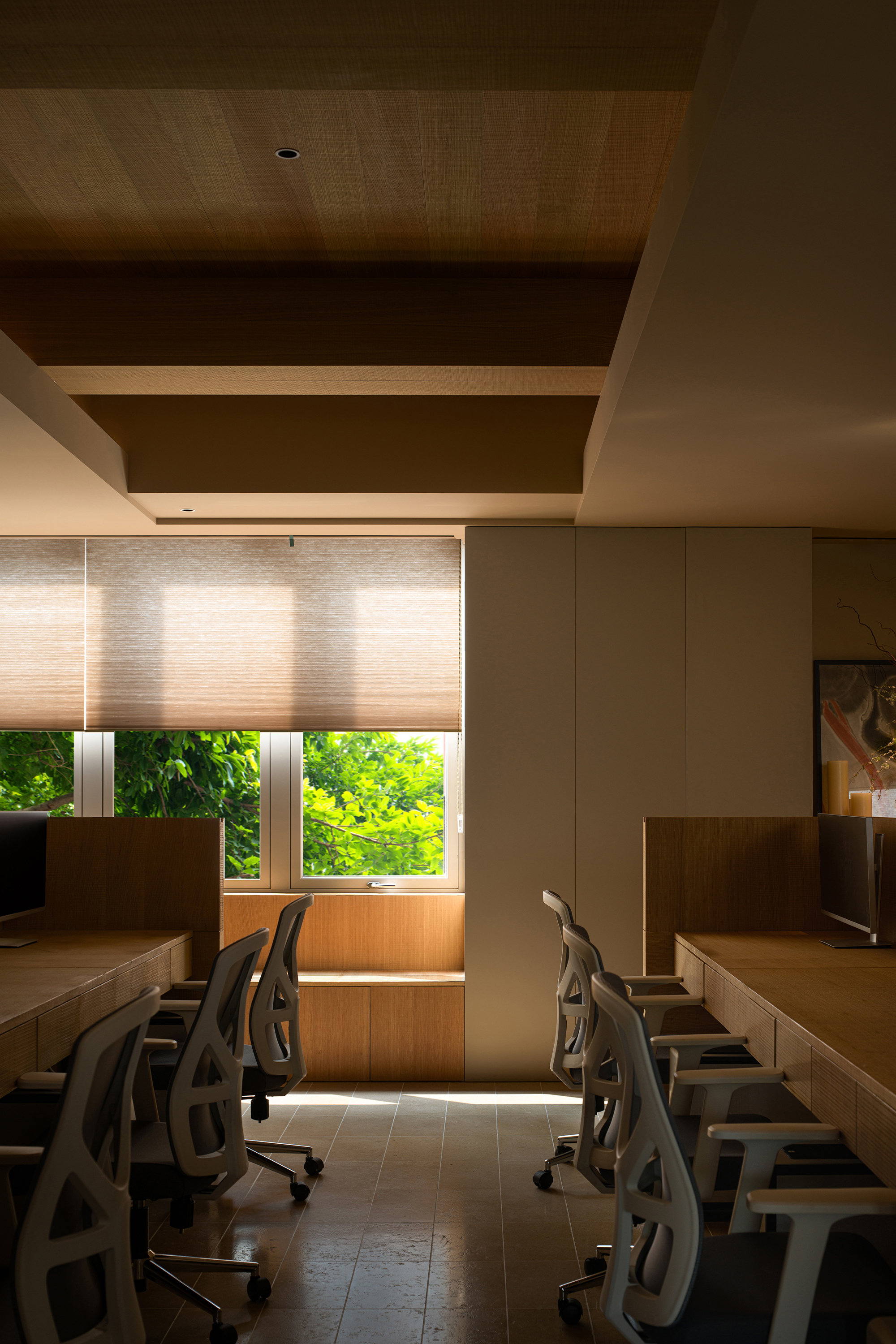 Ascending upstairs, the mood shifts from open to serene, leading into a focused workspace. Here, the atmosphere is not coldly corporate, but quietly artistic and restrained. Warm wood tones and light neutrals, paired with natural light and floral arrangements, create an environment of concentration and calm. The café’s lively aroma below transforms upstairs into a setting of tranquil professionalism.For Lai, the office is more than a workplace—it is a designer’s personal calling card. It carries both the professionalism of his craft and the taste of everyday aesthetics, radiating a quiet, confident, and creative energy.