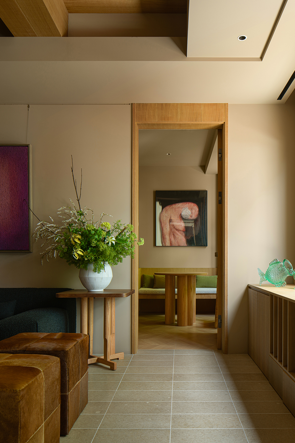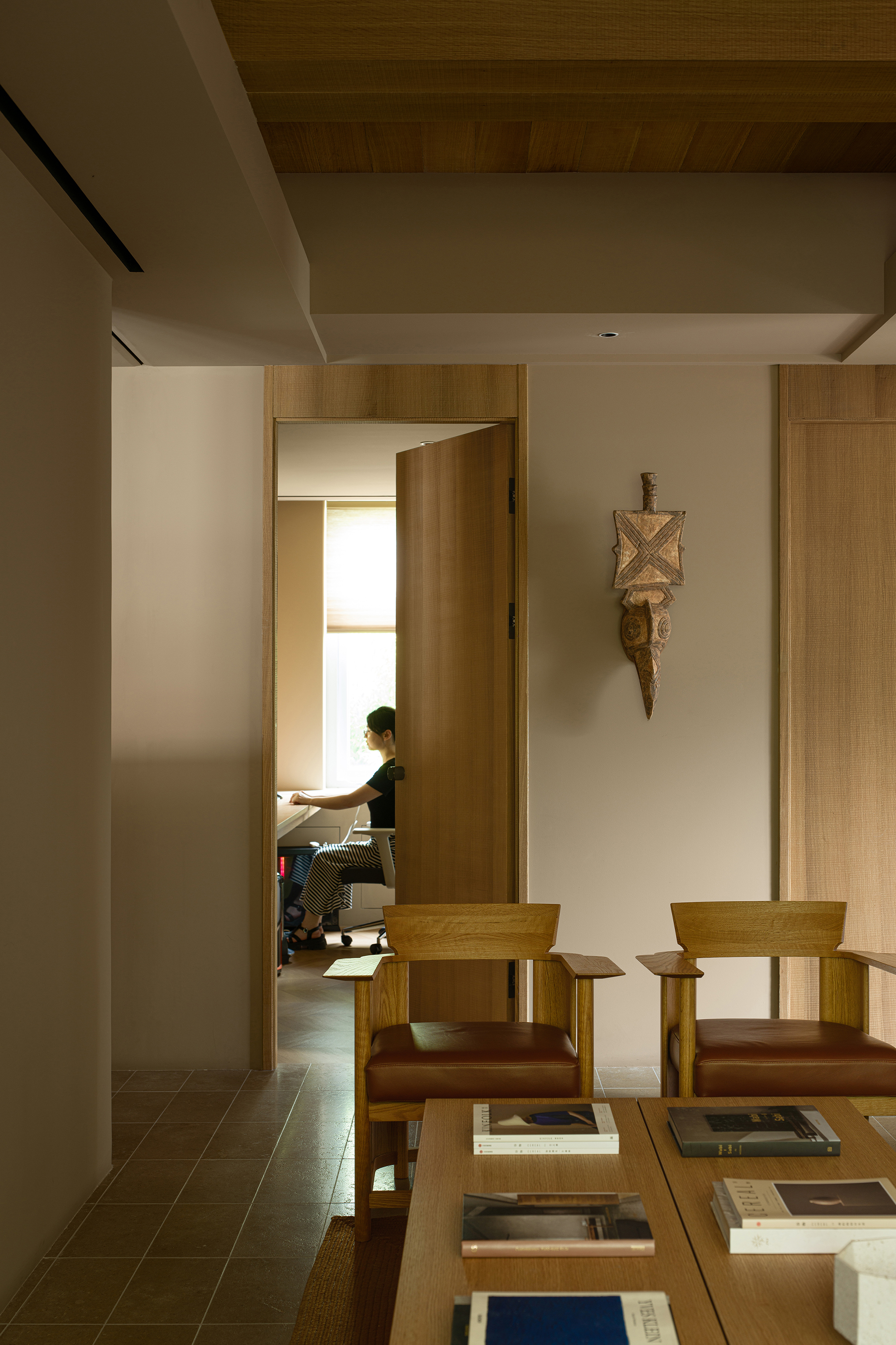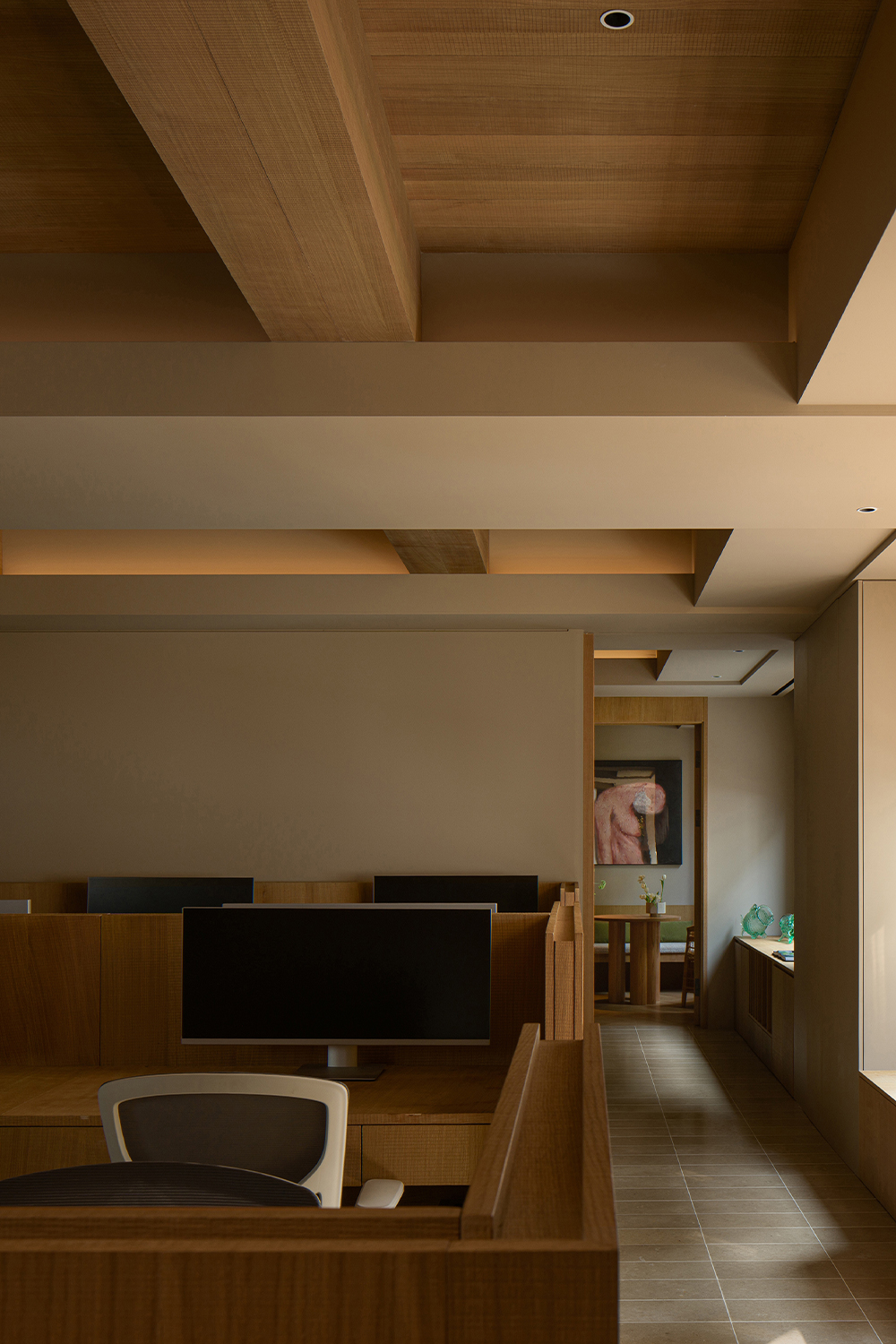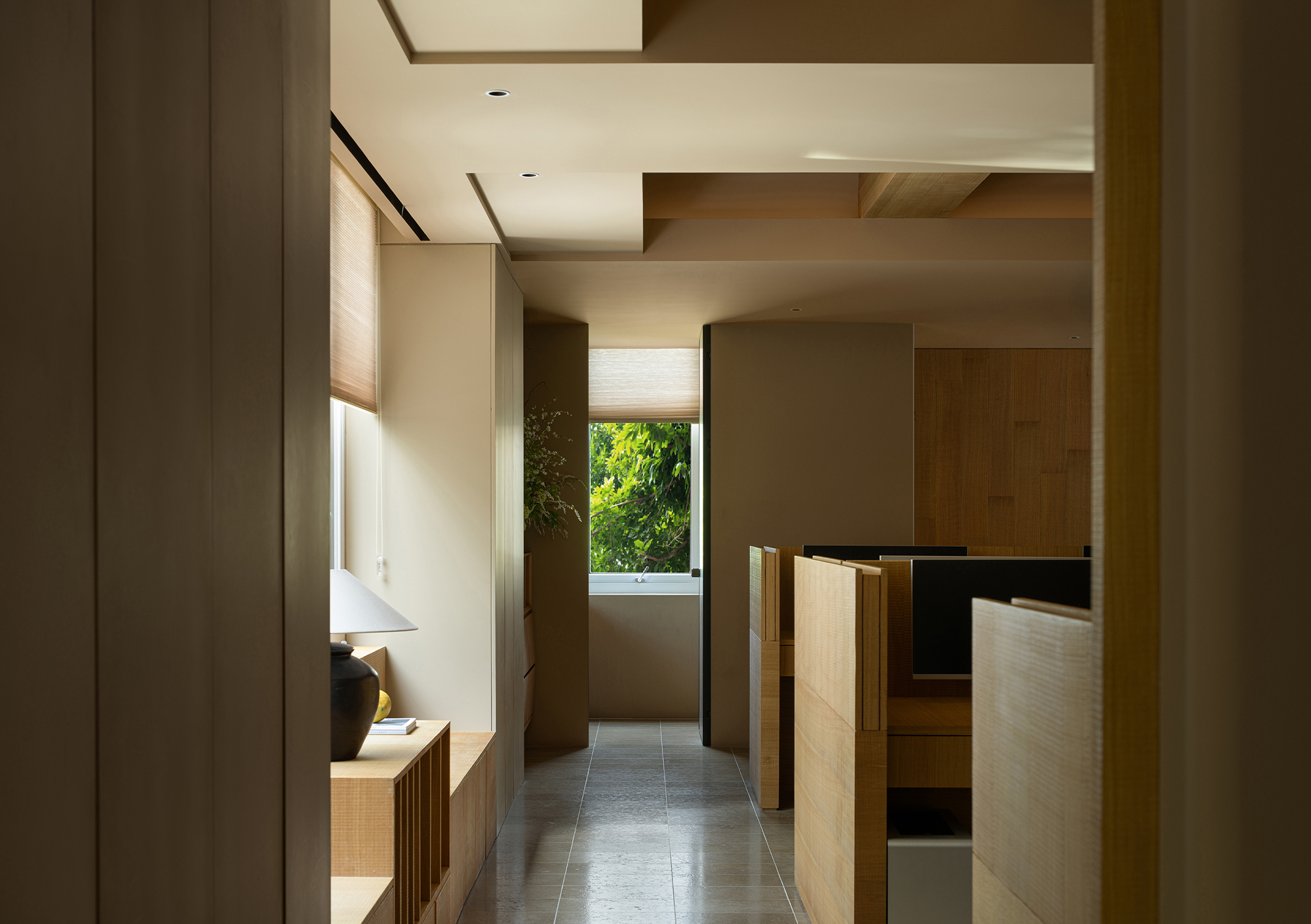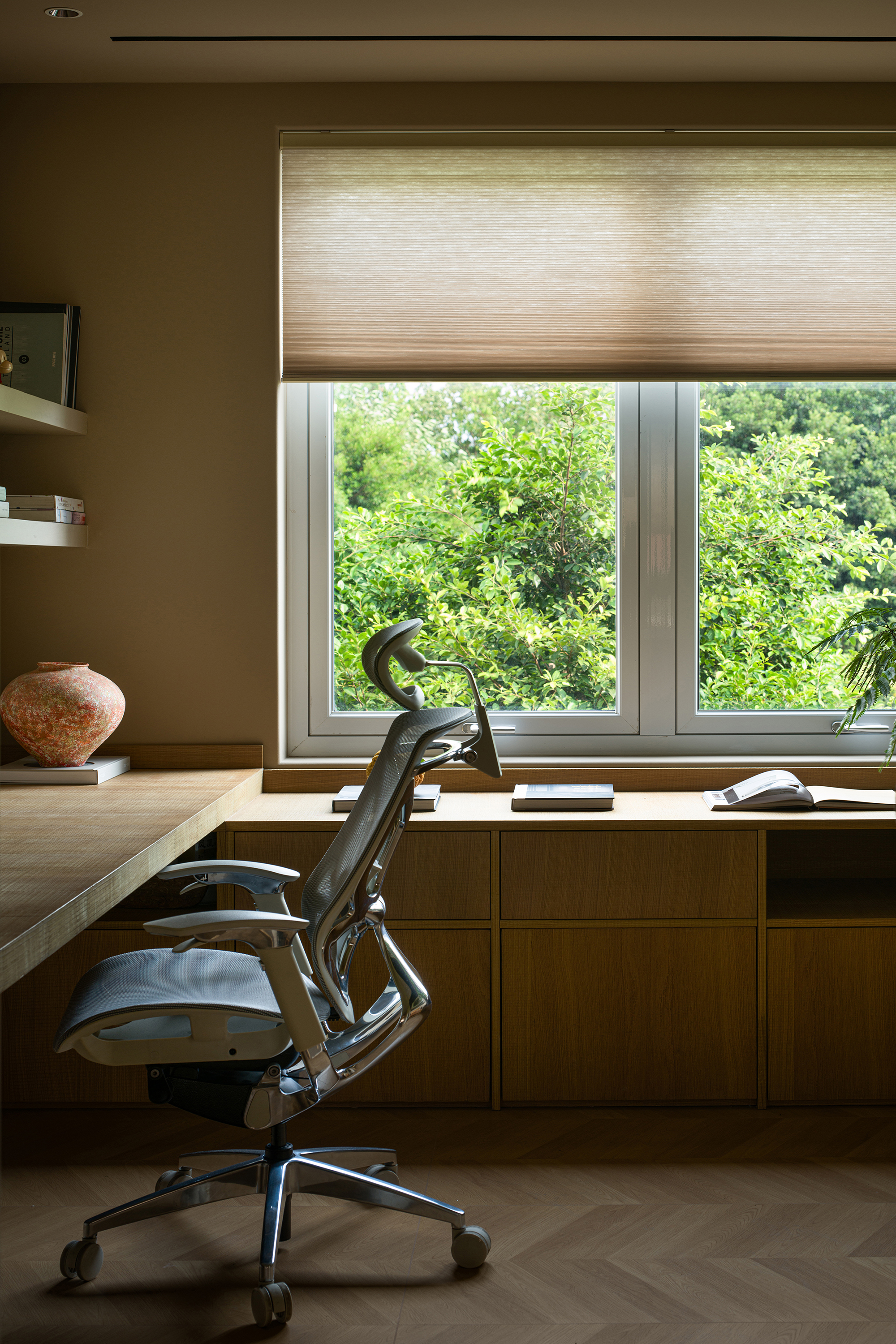 Ascending upstairs, the mood shifts from open to serene, leading into a focused workspace. Here, the atmosphere is not coldly corporate, but quietly artistic and restrained. Warm wood tones and light neutrals, paired with natural light and floral arrangements, create an environment of concentration and calm. The café’s lively aroma below transforms upstairs into a setting of tranquil professionalism.For Lai, the office is more than a workplace—it is a designer’s personal calling card. It carries both the professionalism of his craft and the taste of everyday aesthetics, radiating a quiet, confident, and creative energy.