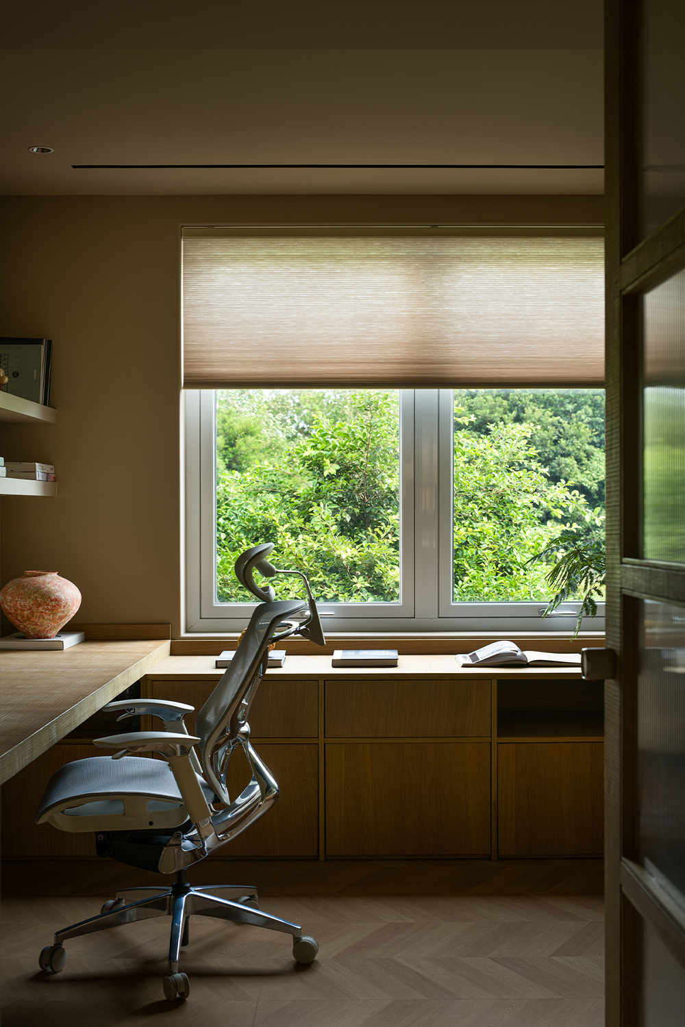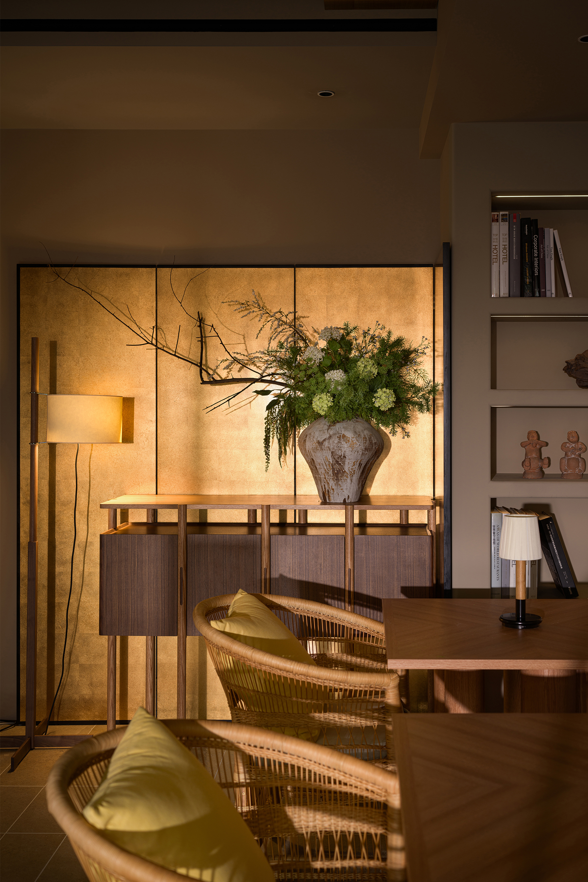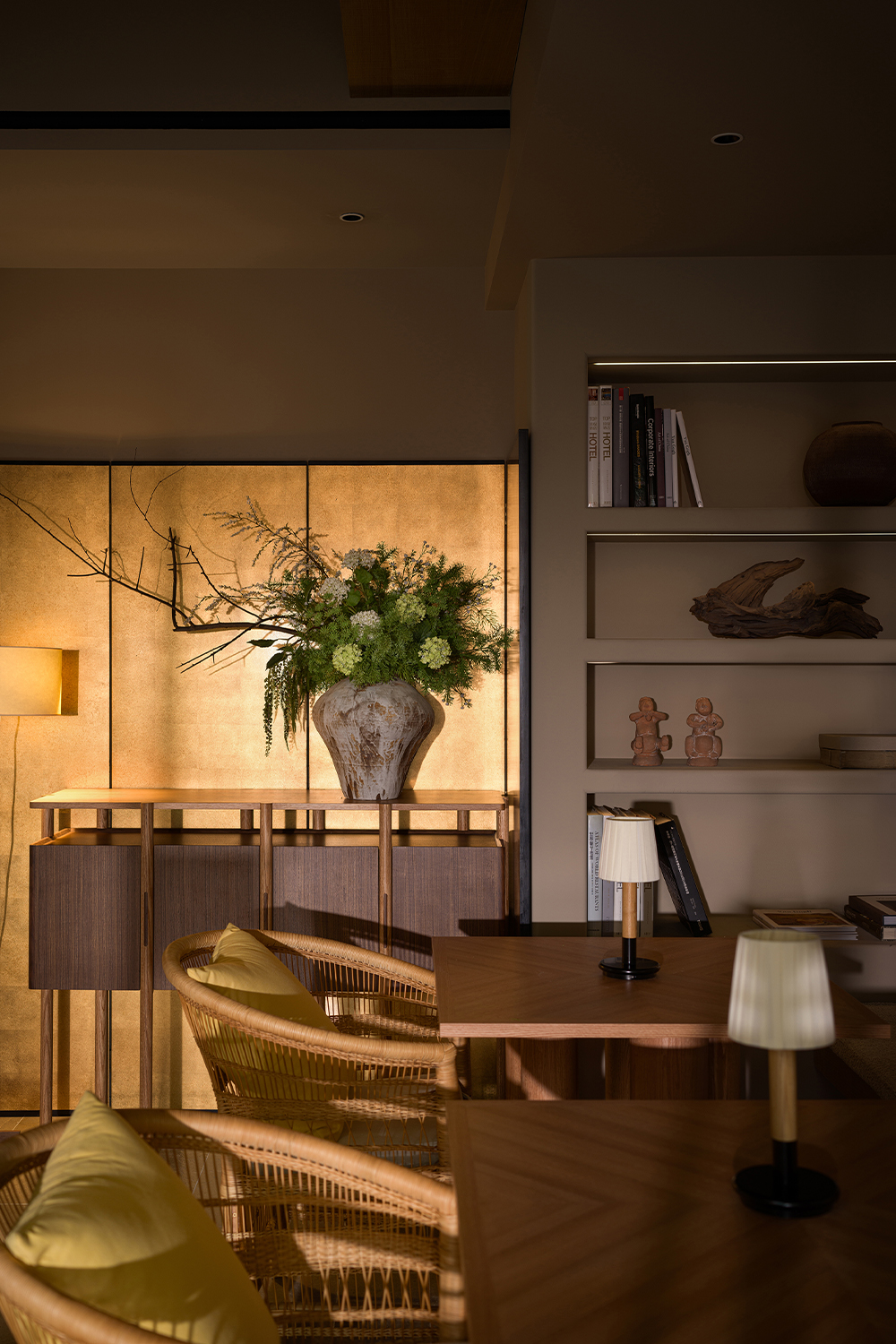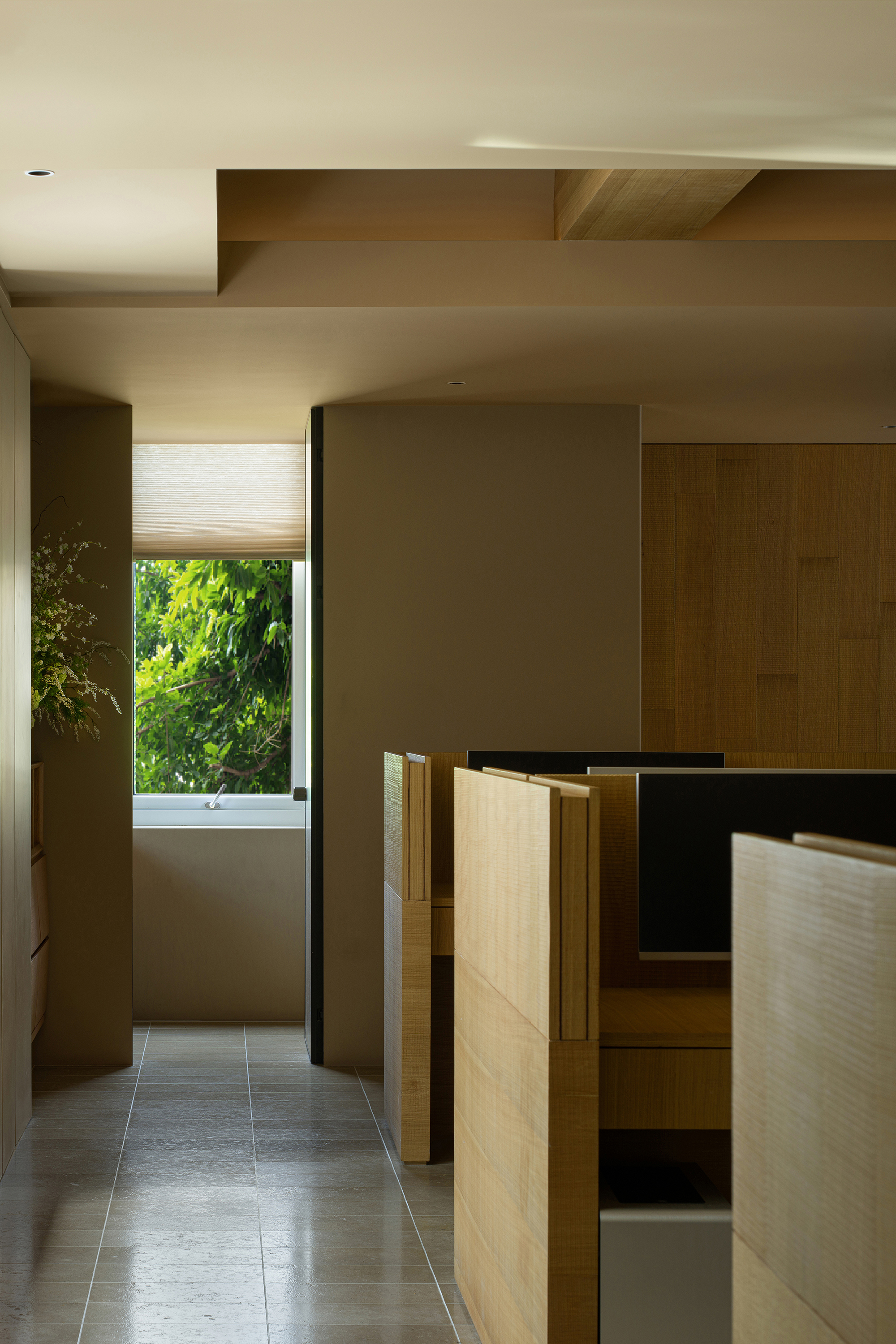 Ascending upstairs, the mood shifts from open to serene, leading into a focused workspace. Here, the atmosphere is not coldly corporate, but quietly artistic and restrained. Warm wood tones and light neutrals, paired with natural light and floral arrangements, create an environment of concentration and calm. The café’s lively aroma below transforms upstairs into a setting of tranquil professionalism.For Lai, the office is more than a workplace—it is a designer’s personal calling card. It carries both the professionalism of his craft and the taste of everyday aesthetics, radiating a quiet, confident, and creative energy.