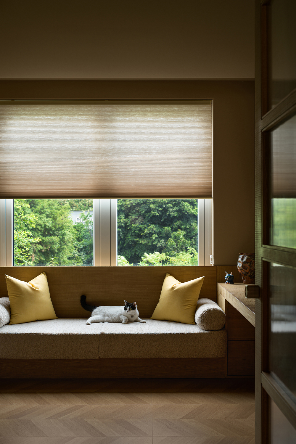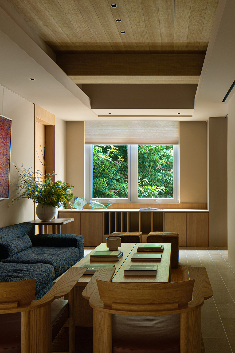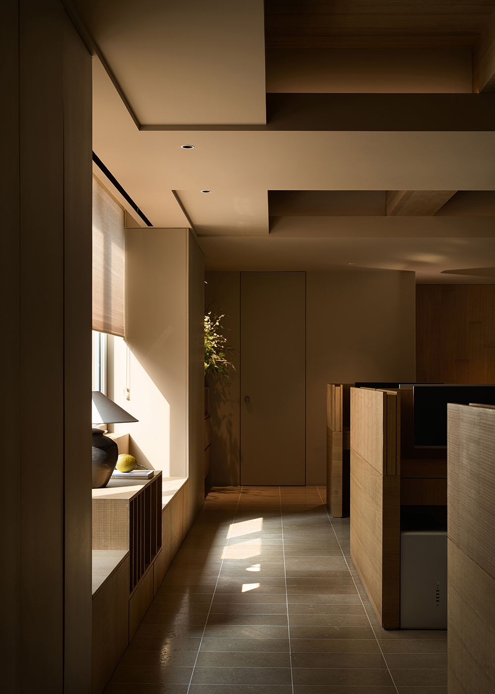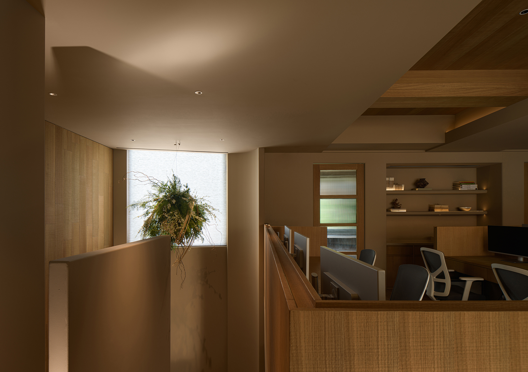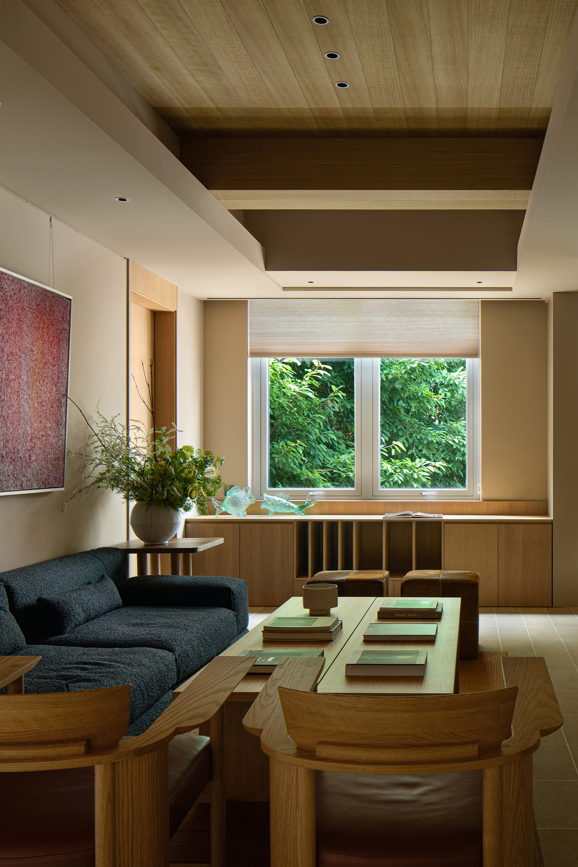 Ascending upstairs, the mood shifts from open to serene, leading into a focused workspace. Here, the atmosphere is not coldly corporate, but quietly artistic and restrained. Warm wood tones and light neutrals, paired with natural light and floral arrangements, create an environment of concentration and calm. The café’s lively aroma below transforms upstairs into a setting of tranquil professionalism.For Lai, the office is more than a workplace—it is a designer’s personal calling card. It carries both the professionalism of his craft and the taste of everyday aesthetics, radiating a quiet, confident, and creative energy.