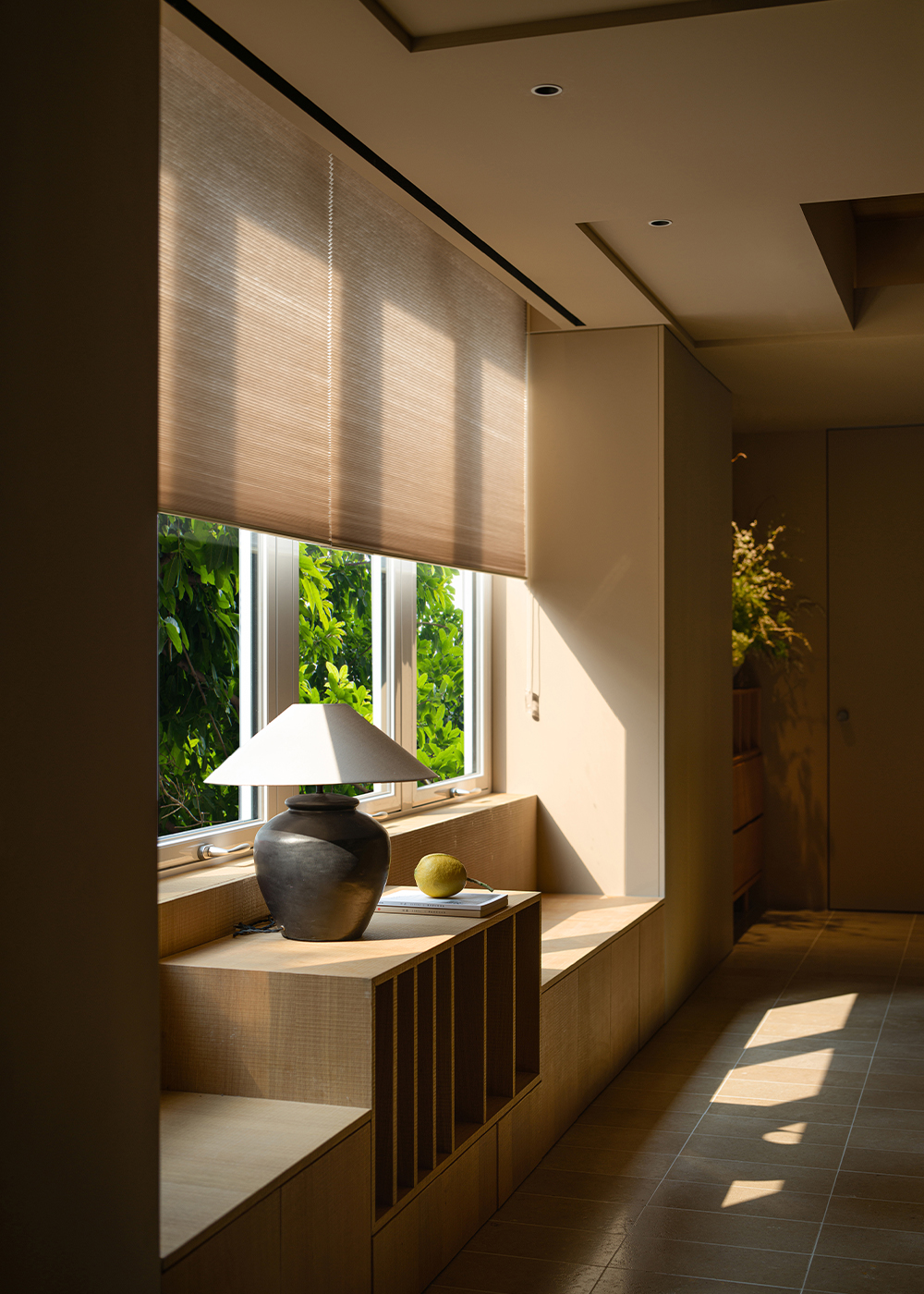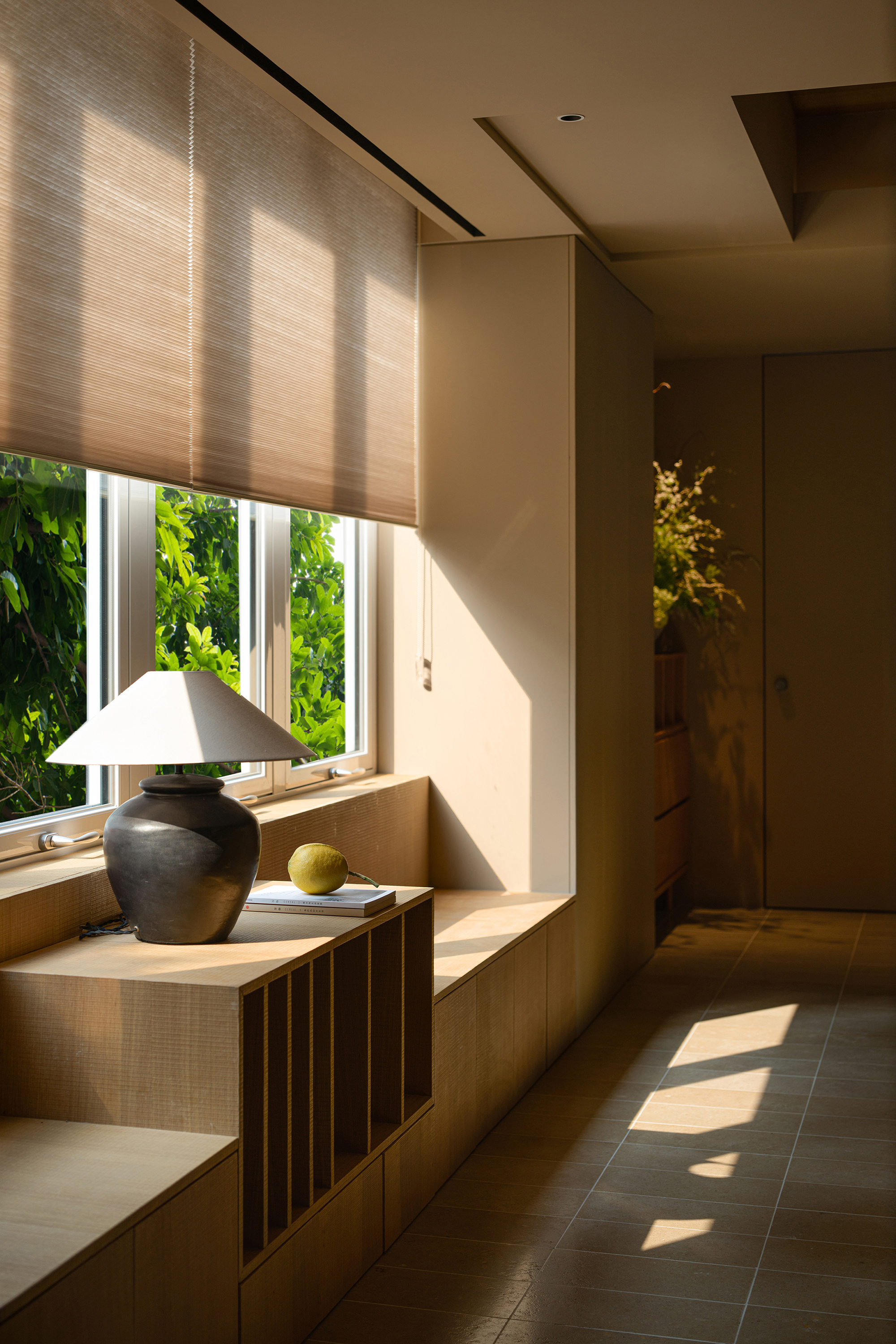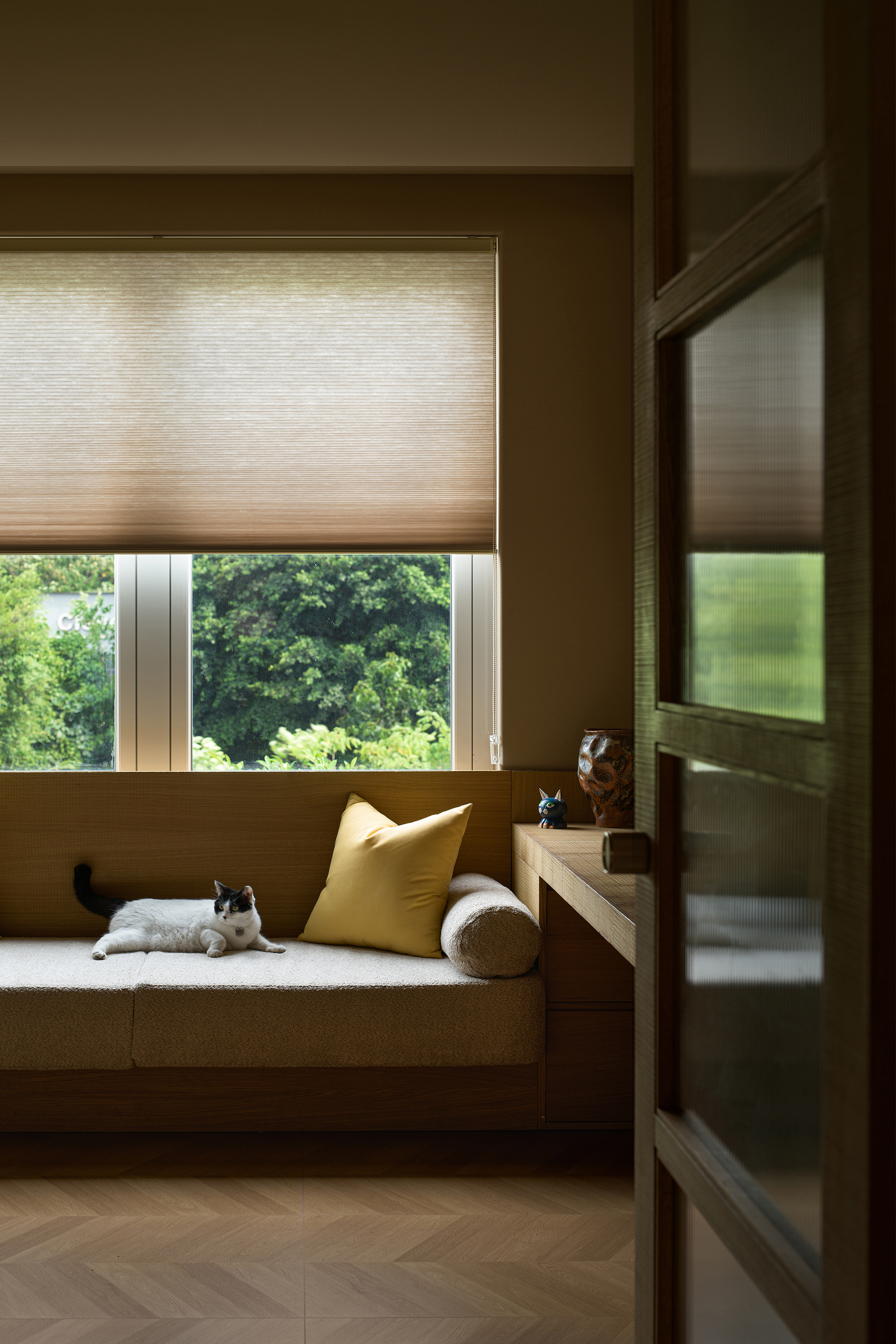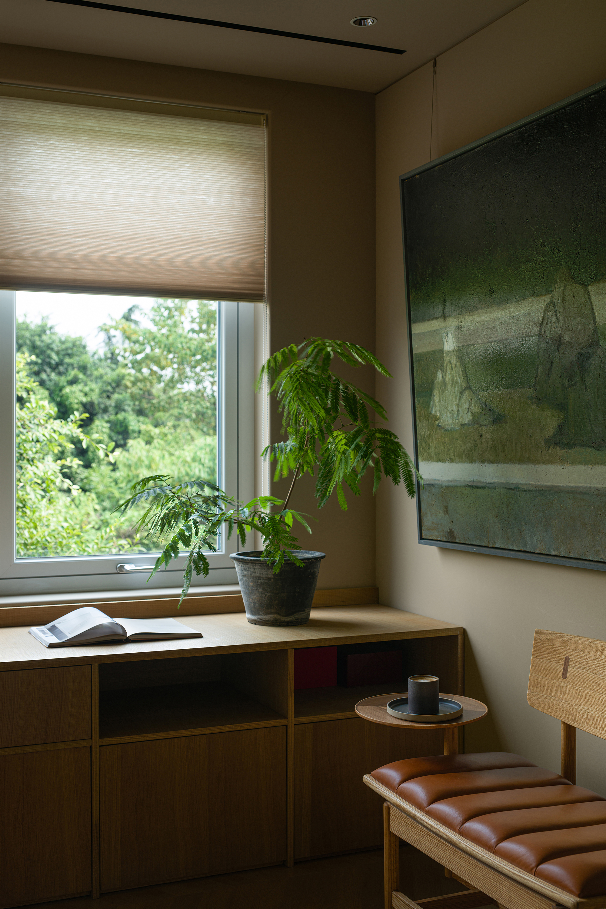 Ascending upstairs, the mood shifts from open to serene, leading into a focused workspace. Here, the atmosphere is not coldly corporate, but quietly artistic and restrained. Warm wood tones and light neutrals, paired with natural light and floral arrangements, create an environment of concentration and calm. The café’s lively aroma below transforms upstairs into a setting of tranquil professionalism.For Lai, the office is more than a workplace—it is a designer’s personal calling card. It carries both the professionalism of his craft and the taste of everyday aesthetics, radiating a quiet, confident, and creative energy.