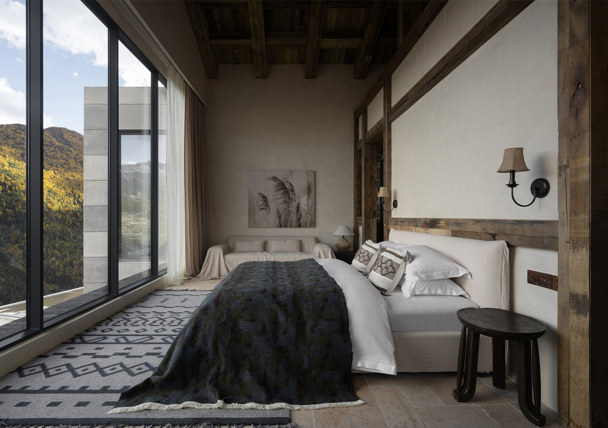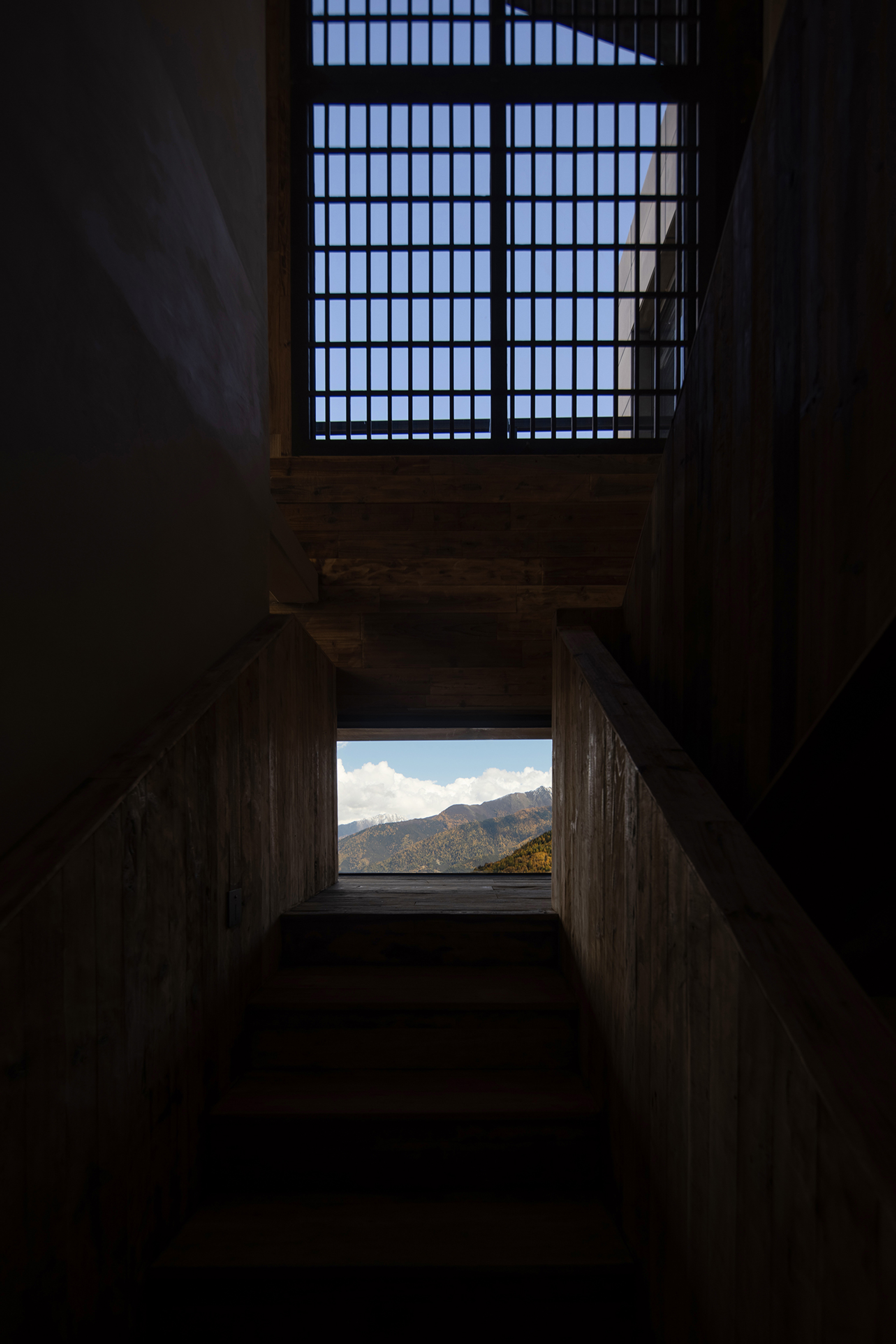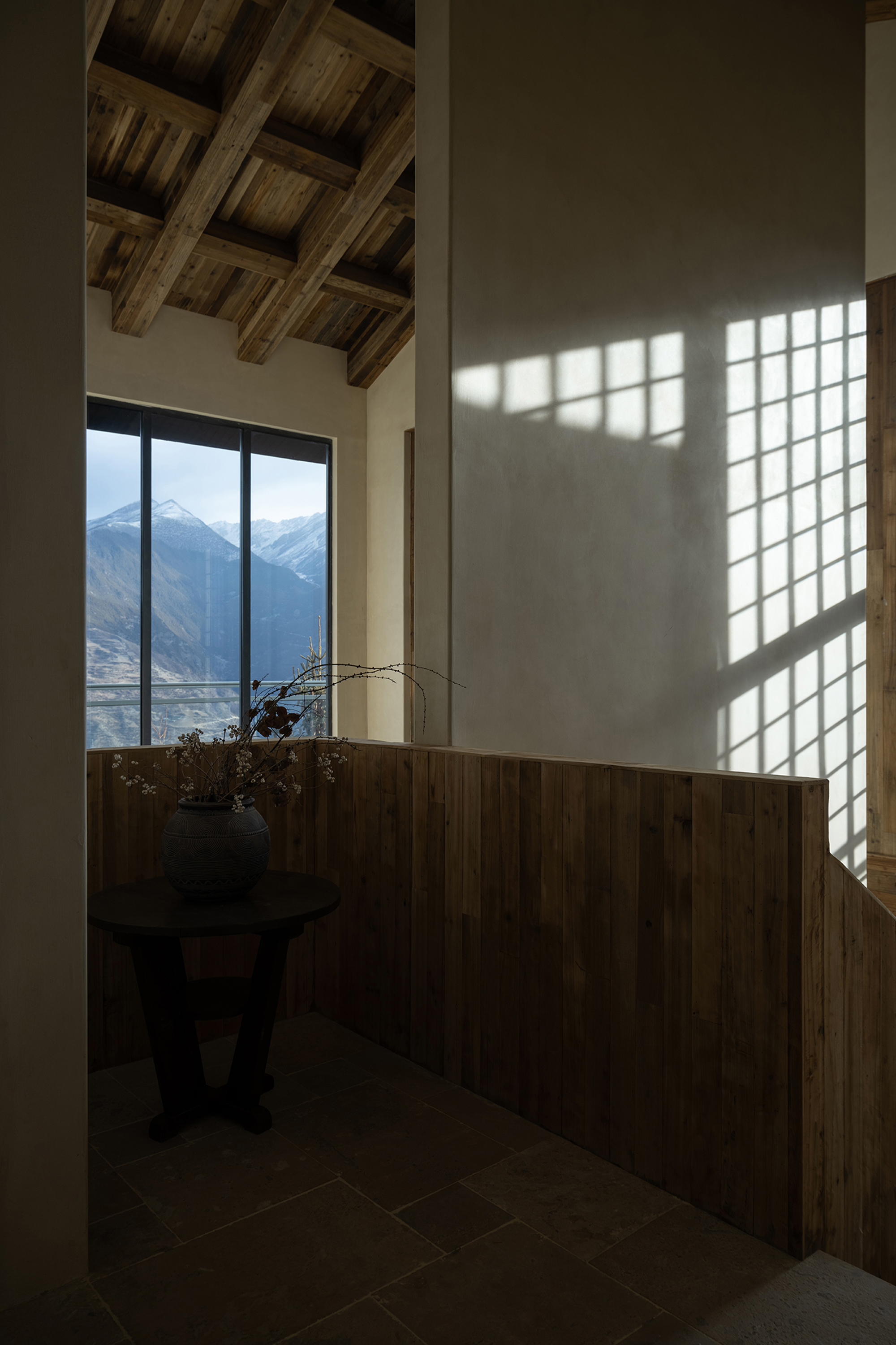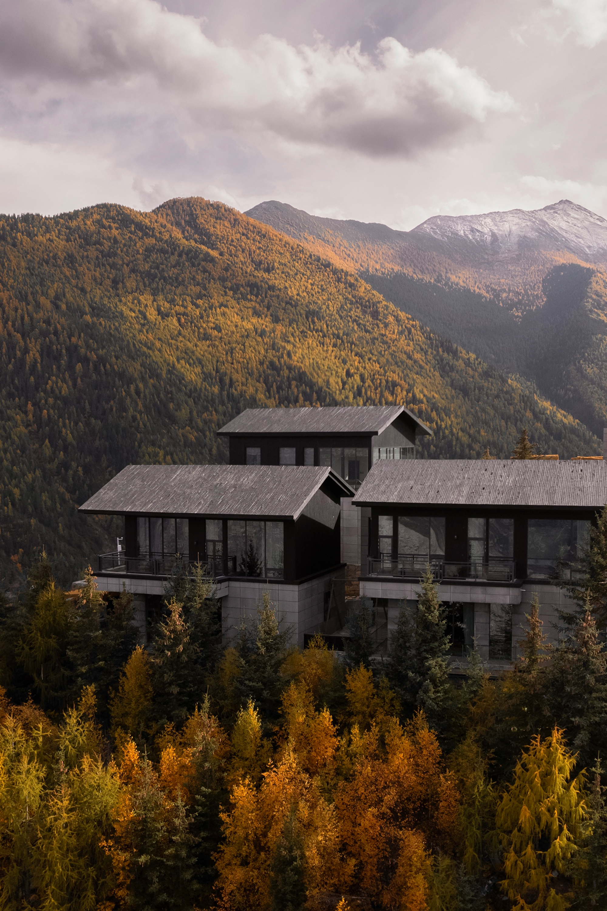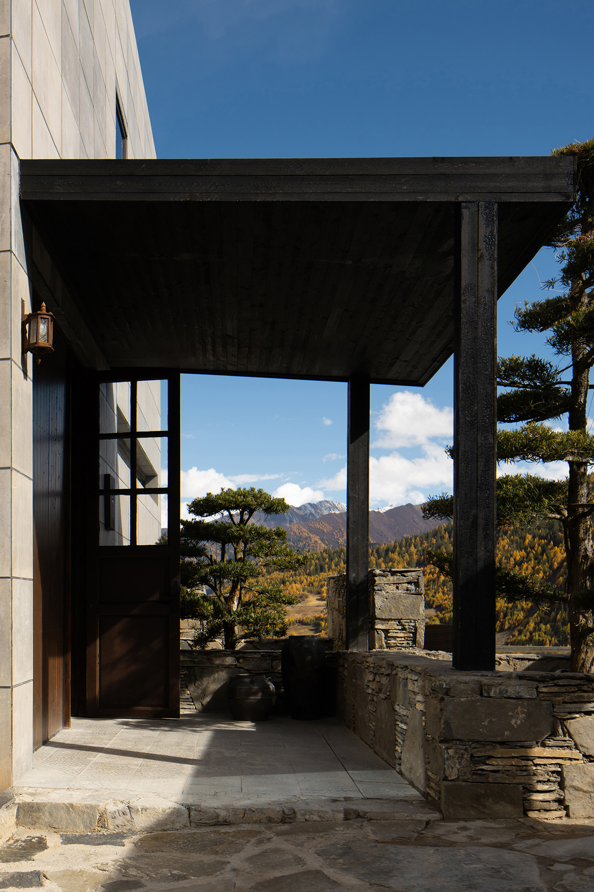 This is a renovation project located in Si'an Village, Rier Township, next to Siguniang Mountain in western Sichuan, which means "prominent platform" in Tibetan, and the Yunshan Mountain stands on a cliff held up by the forest. The roof of the renovated building is flush with the ridge of the Kanoer Snow Mountain, and the side near the cliff is opposite the direction of the sunrise of the Balang Snow Mountain. The original building structure sank into the forest, and the newly added buildings slowly disappeared into the mountain of Kanuoer Snow Mountain when the clouds and mist were filled, and the sloped roof and ridge converged into a "in" word, which is the origin of the project into the cloud mountain.