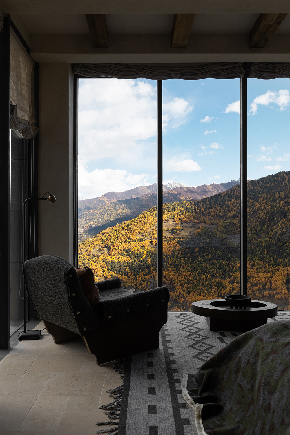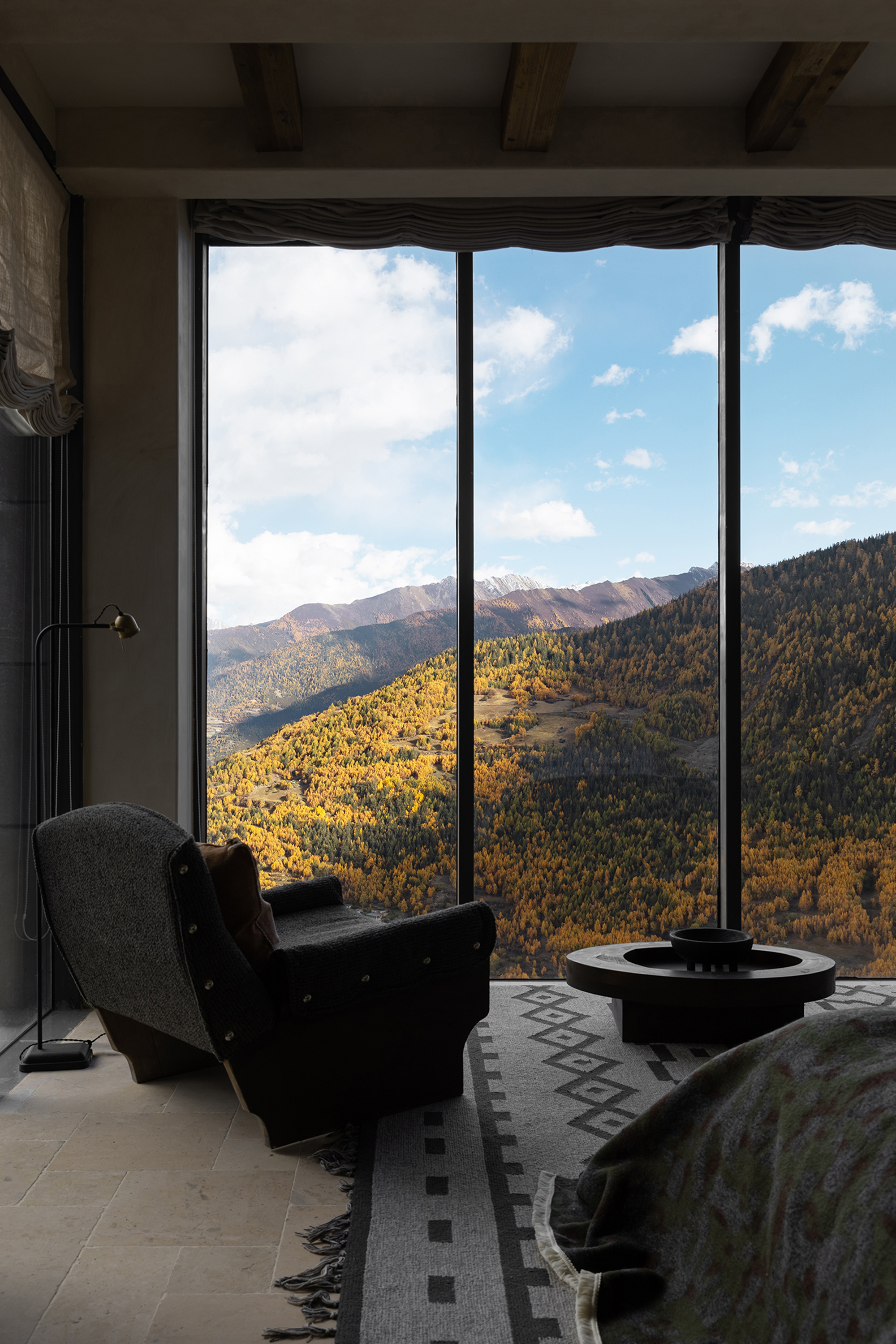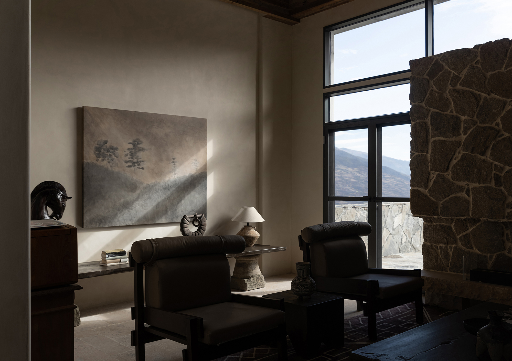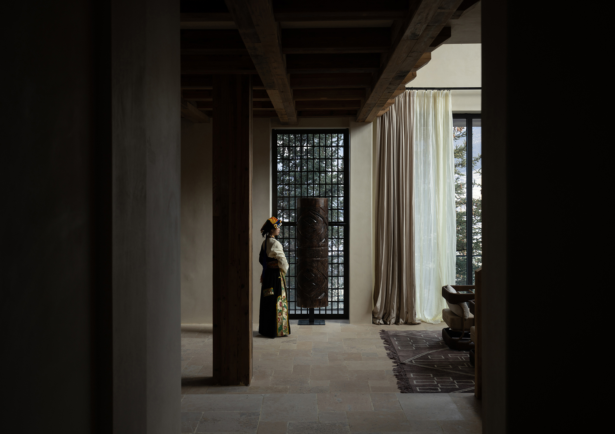 This is a renovation project located in Si'an Village, Rier Township, next to Siguniang Mountain in western Sichuan, which means "prominent platform" in Tibetan, and the Yunshan Mountain stands on a cliff held up by the forest. The roof of the renovated building is flush with the ridge of the Kanoer Snow Mountain, and the side near the cliff is opposite the direction of the sunrise of the Balang Snow Mountain. The original building structure sank into the forest, and the newly added buildings slowly disappeared into the mountain of Kanuoer Snow Mountain when the clouds and mist were filled, and the sloped roof and ridge converged into a "in" word, which is the origin of the project into the cloud mountain.