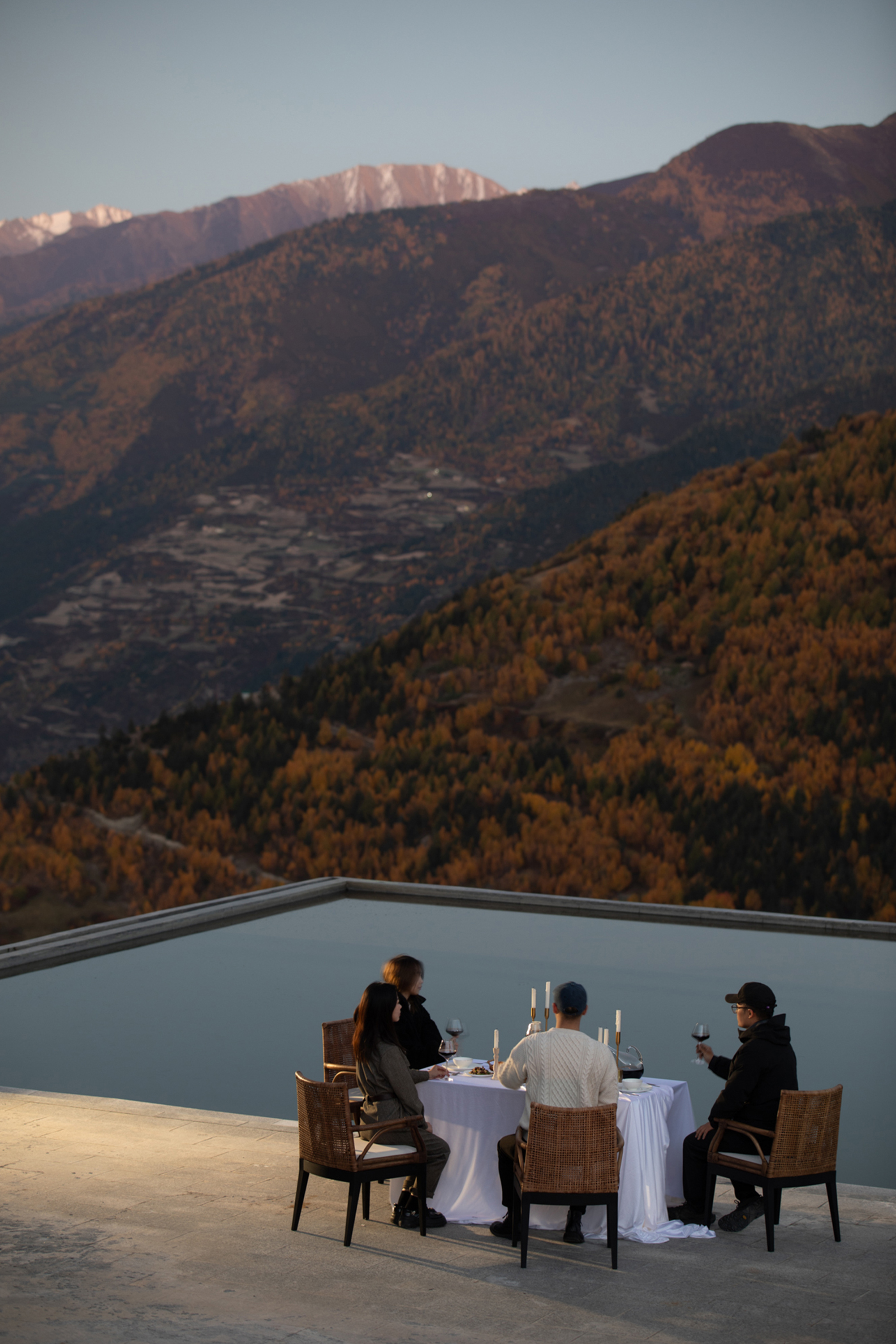 There was a waterhole near the edge of the cliff, which was later transformed into a cliffside water feature. It is also an excellent location to watch the sunrise over the Balang Snow Mountain, as well as the rainbow. When the weather is good, it will be an outdoor dining bar, the pond is not deep but can fill the mountains all year round.