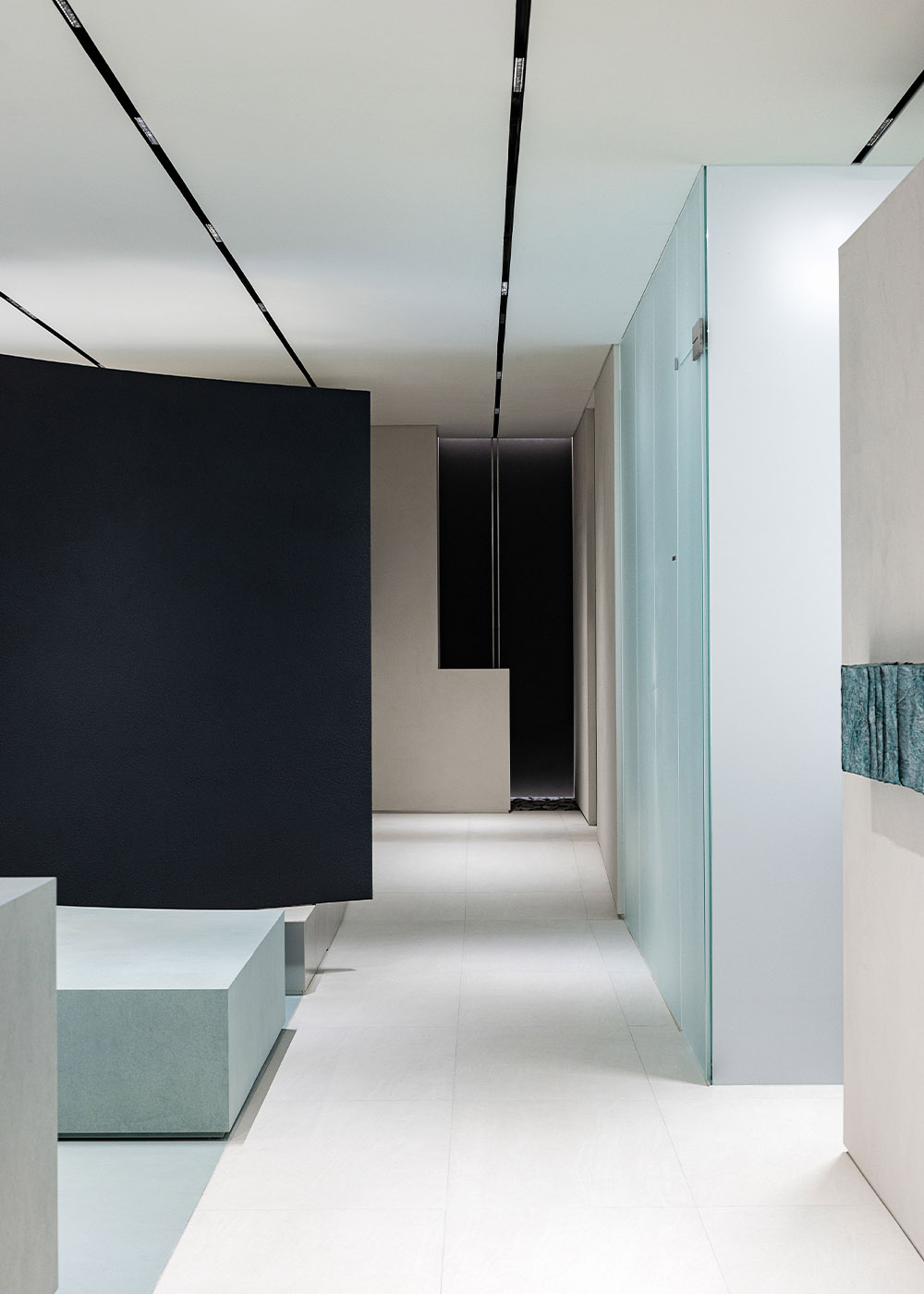 At the end of the lounge’s left corridor, two spa rooms—one private and one shared—are located. The corridor itself serves as a transitional zone, opening perspectives and introducing rhythm to the spatial flow. The spa rooms are not merely spaces for shampooing; they are places where another layer of sensation opens. In contrast to the store’s overall tone and manner, the darker ambience and the subtle yet intense glow of the walls create a striking interplay. This balance allows clients to fully immerse in their senses, encountering an extraordinary, out-of-the-ordinary experience.