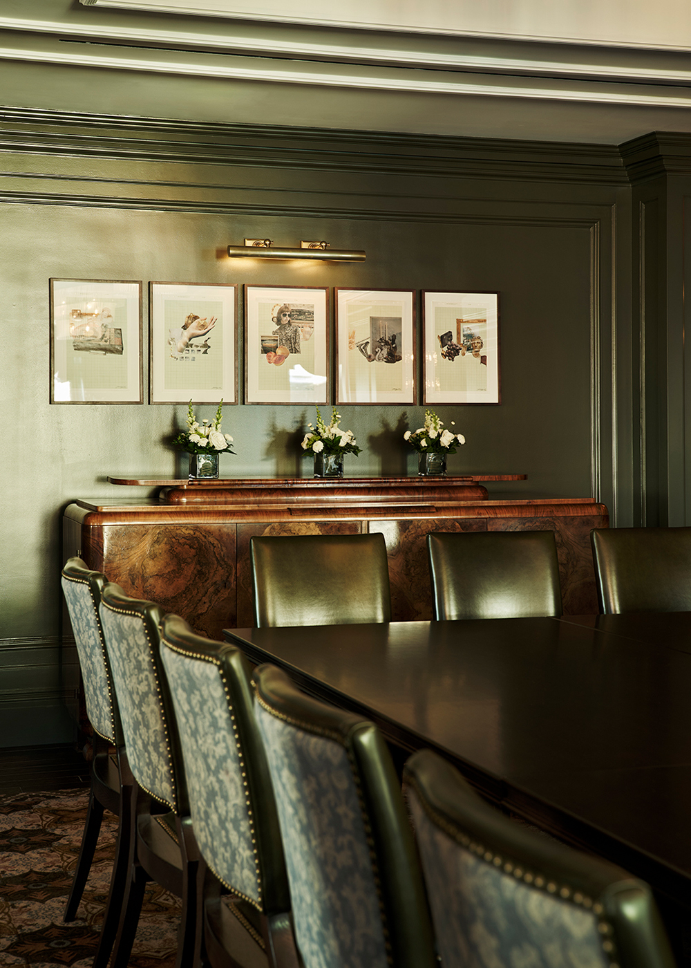 On the member’s floor, several rooms take inspiration from former White House eras. The member’s library features vintage mantels and a bold striped wallcovering inspired by images of the Obama White House. During the day, the library is a cozy workspace and at night transforms into a lively hub with a fully functioning bar. The parlor, adorned with murals reminiscent of the Sister Parish-designed President’s Dining Room completed during the Kennedy era, becomes a canvas where history and art converge.