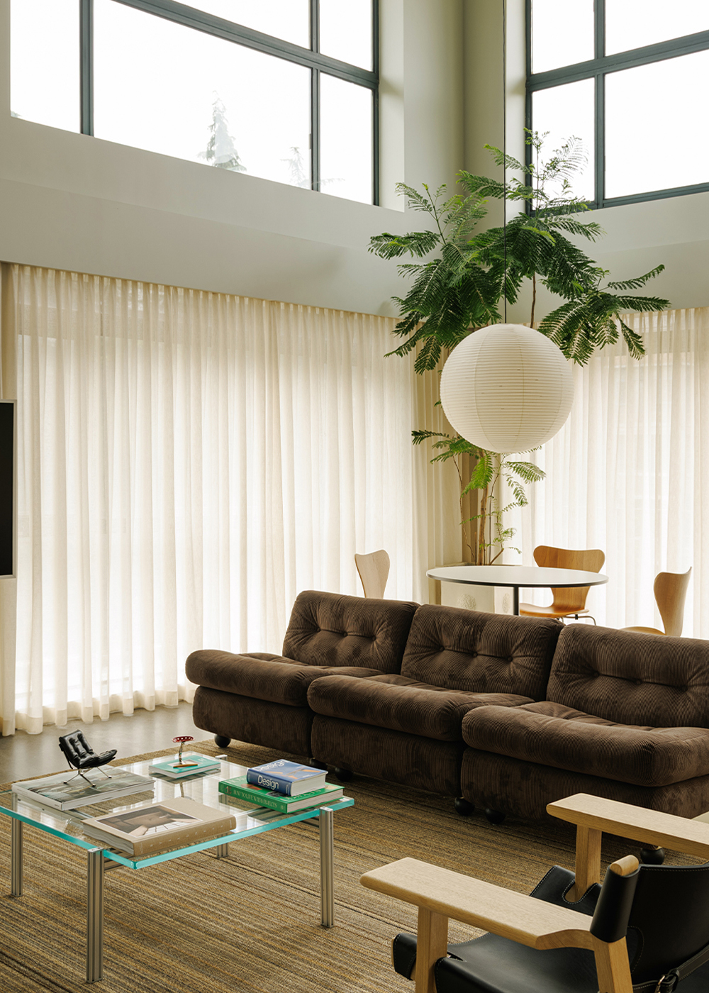 The first floor is reserved for visiting owners, which integrates functions of living room, meeting room, material display area, and lounge. The living room is furnished with flexibly arranged furniture. The double-height section features two rows of 270° panoramic windows that draw natural light and sky views into the interior. The addition of plants, sheer curtains, and a rug softens the ambiance, creating a relaxed and comfortable atmosphere. Beneath the staircase, tiered seating is designed to blend naturally with the steps, forming a versatile composite area suitable for daily meetings, sharing sessions, and displays. A variety of workspace configurations encourage users to freely choose their spots, allowing inspiration to flourish anywhere, which becomes a zone for free expression and creative exchange.