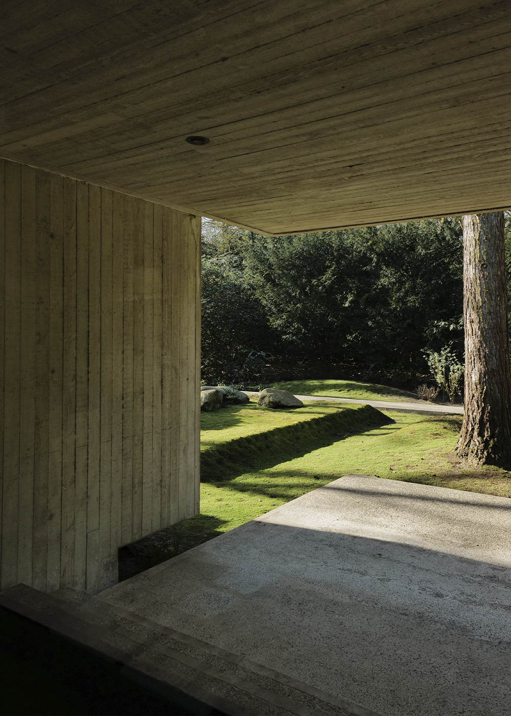 When the morning mist had not yet dissipated, sunlight had already flowed down along the edges of the concrete, leaving geometric light spots on the grey stone floor. This building, hidden in the suburbs of Durle, Belgium, is like a sleeping giant beast - the two staggered stone walls at the entrance are like its shadows, leading visitors into a carefully designed visual delay. When bypassing the last barrier, the mottled concrete blocks suddenly came into view: It was like a crashed alien spaceship, crawling on the perfectly trimmed lawn with the marks of time erosion, forming a sharp contrast with the neatly arranged mansions around.