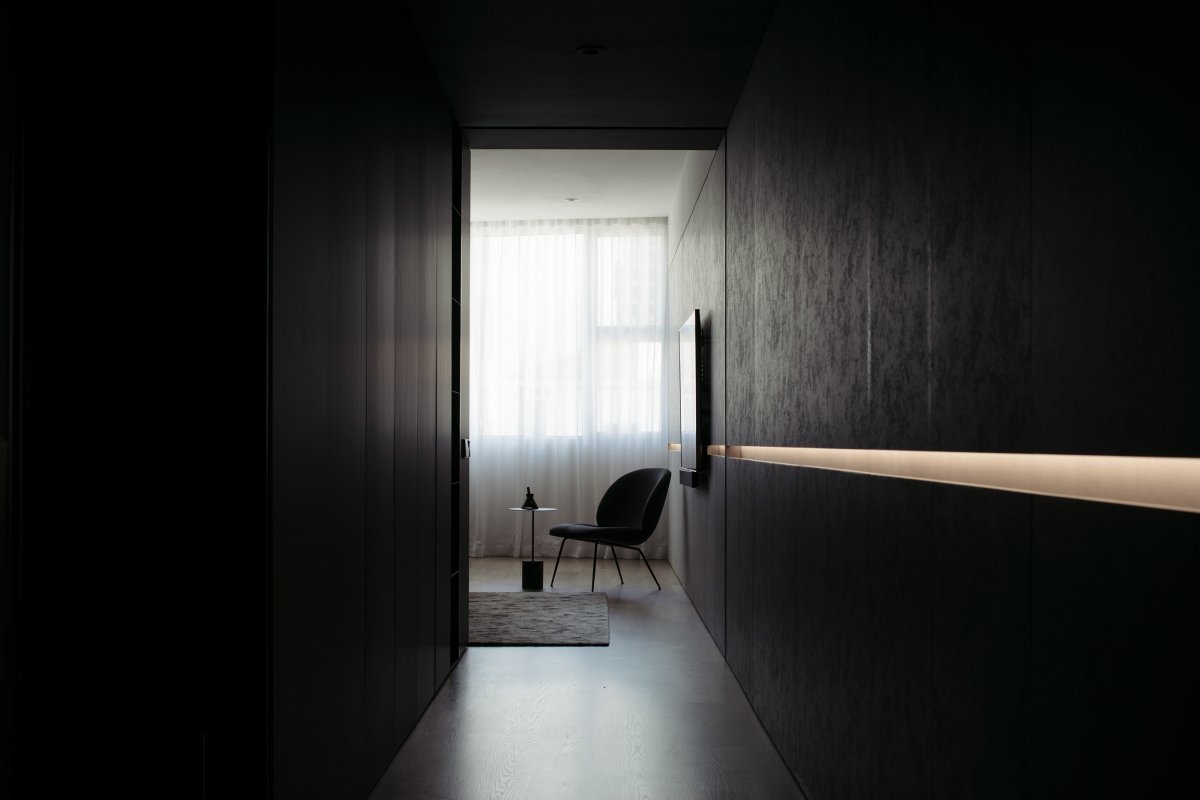 The three zones are separated by sliding doors. People can see the entire home in one glance when all doors are open. To create a visual connection between the three zones, a simple light strip along the corridor guides the owner along the dimmed space like a cool special effect.