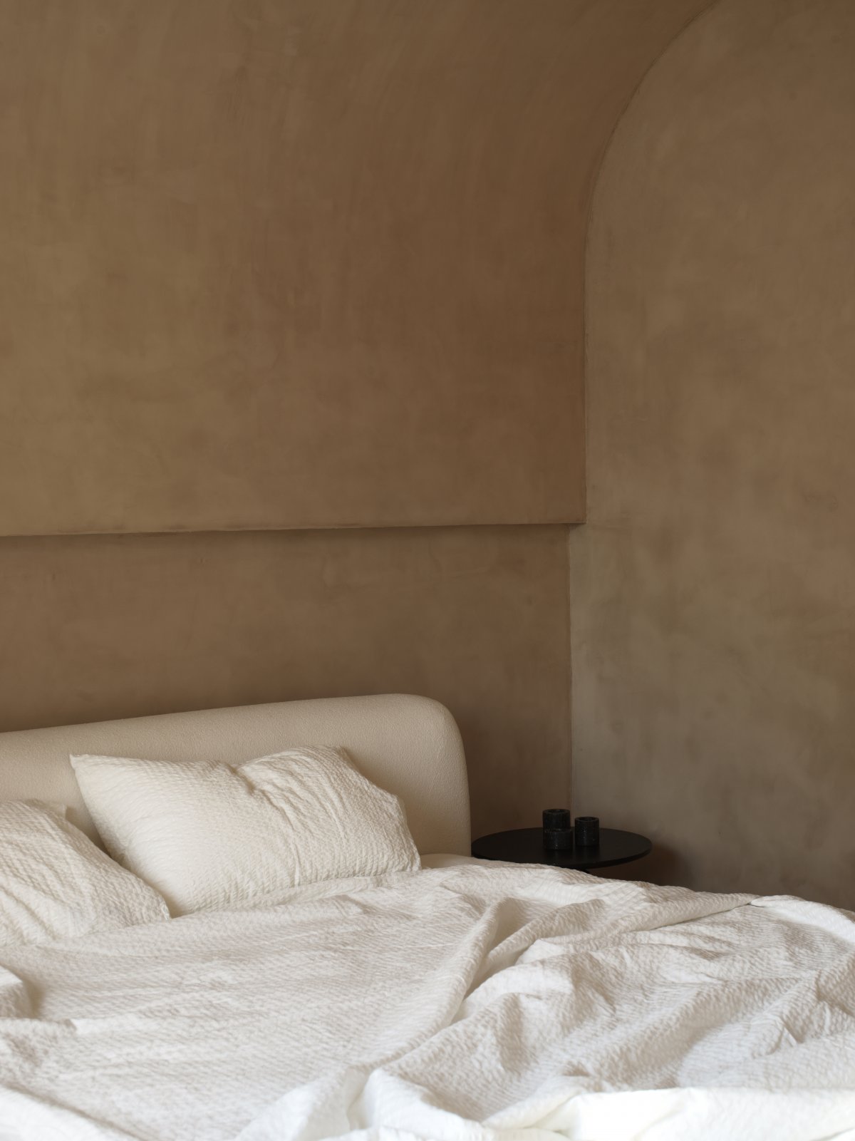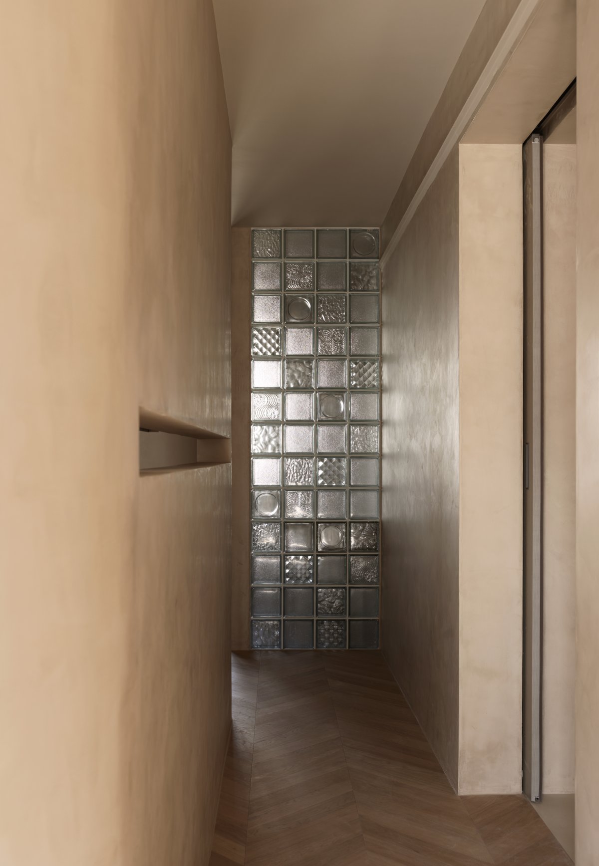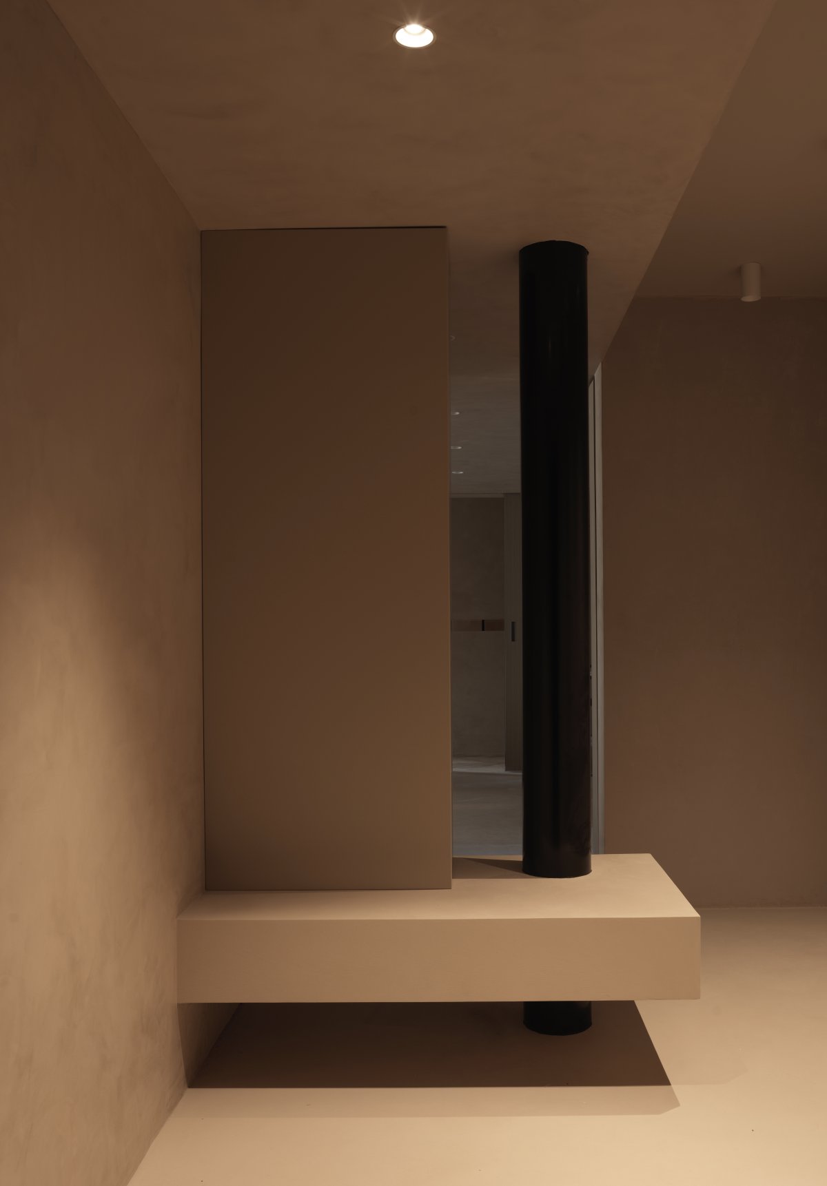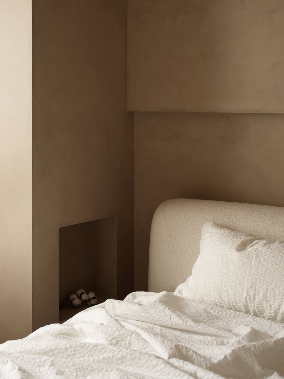 The designer uses a large area of texture paint to create a tactile sense of "hole" in the space. The superimposed changes of natural light make this empty room with texture on cotton and hemp material embellishment.