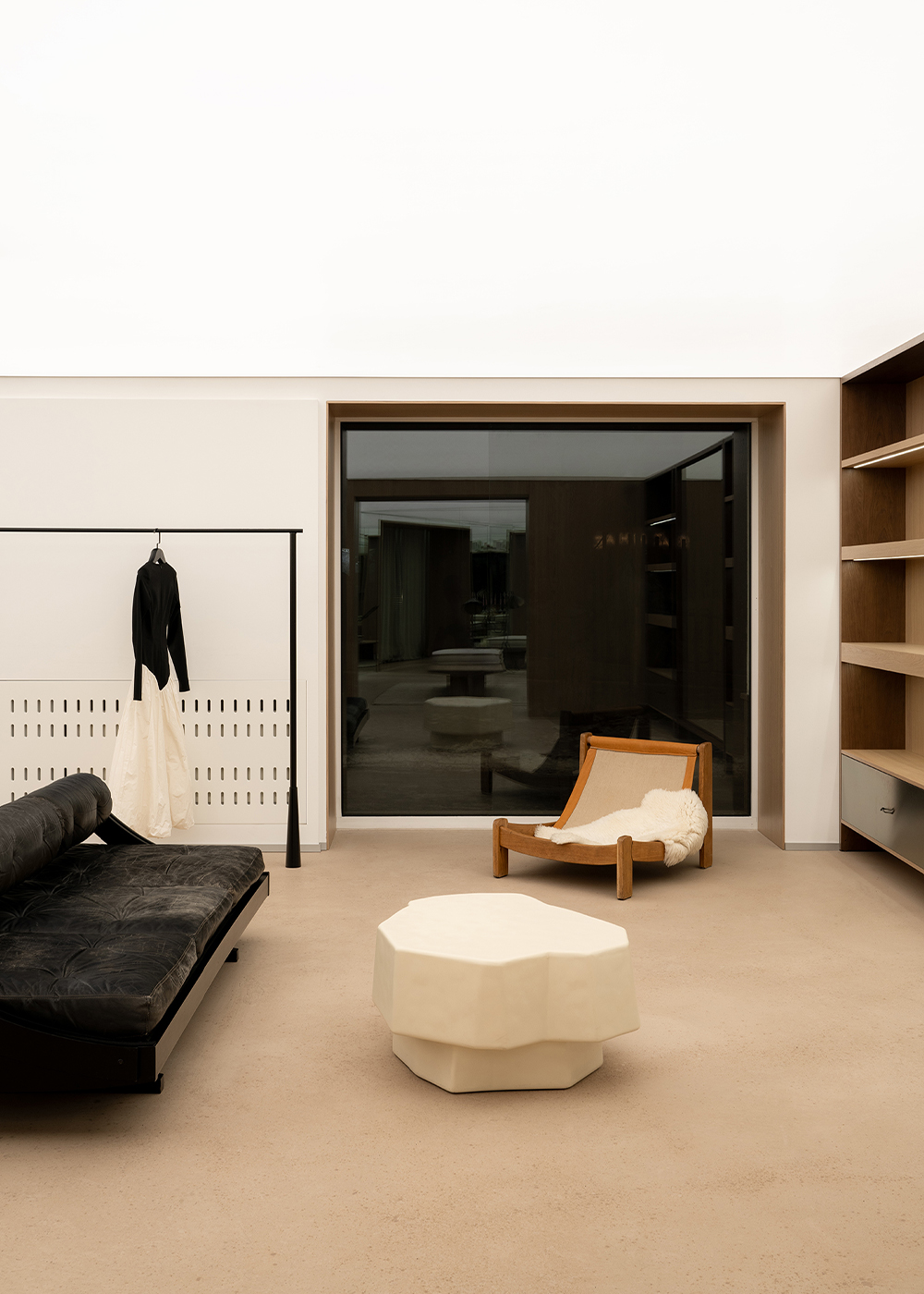 The room has an elongated shape and is divided into two zones relative to the entrance. The first visual accent is the reception desk, made of wood and travertine. Its elongated horizontal line forms the direction of movement inside the space. To the left of the reception desk is the main hall with rails for clothes and a waiting area. The latter is decorated with a black leather sofa by Gianni Songia, tables made of fiberglass concrete by ferm living and a low vintage armchair.