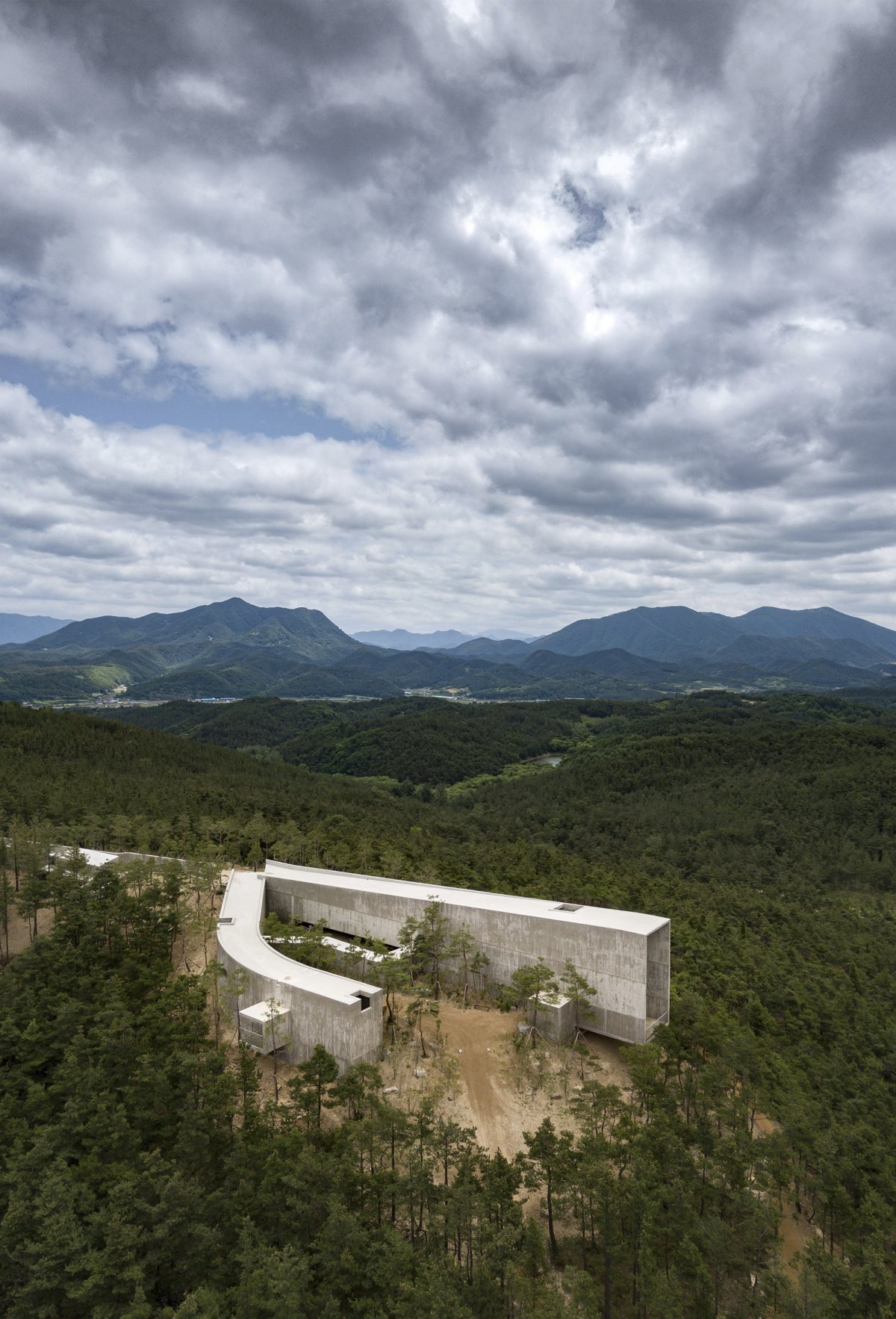 Saya Park, set in a forest in South Korea's Gyeongsang Province, includes an art gallery with a matching chapel and observation deck. The buildings don’t belong to the site; instead, they carve out their own site.